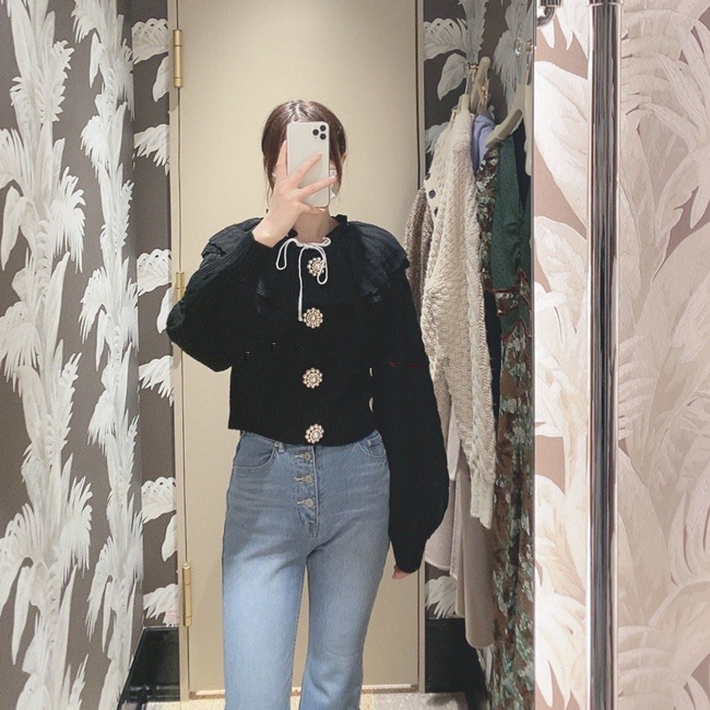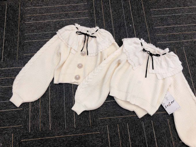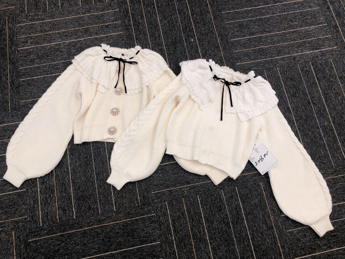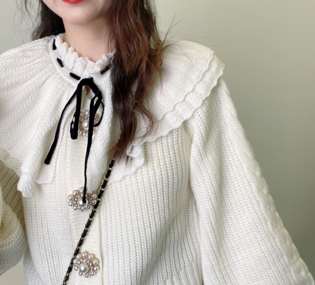 身頃と袖は畦編みのニットでふんわりとしたフォルムに、襟はボリュームを抑えた別糸の柄編みで仕上げました。パールボタンはスナップ式なので美しいシルエットをキープします。フェミニンなオフホワイト、モードなブラックの2色でご用意しました。プルオーバーとしてもお楽しみいただけます。