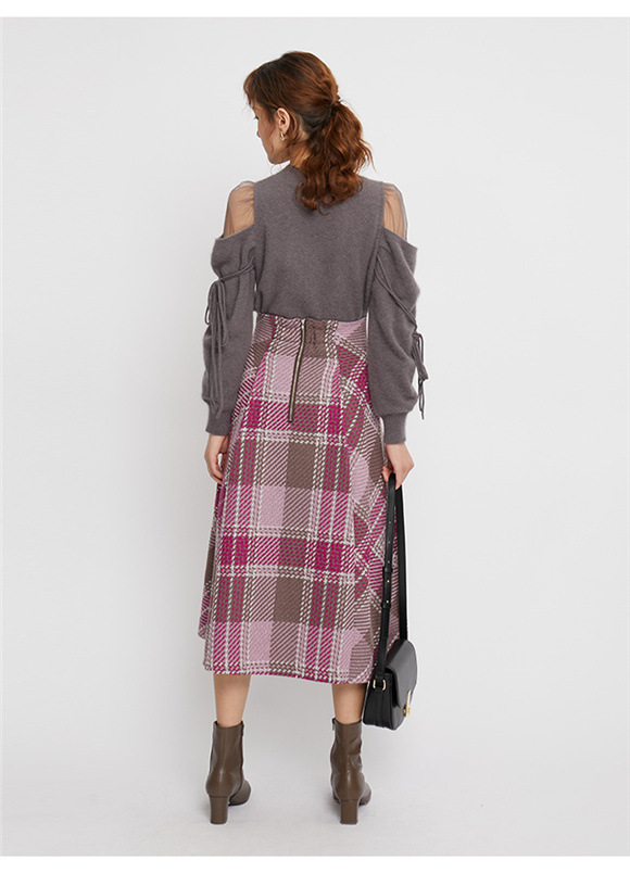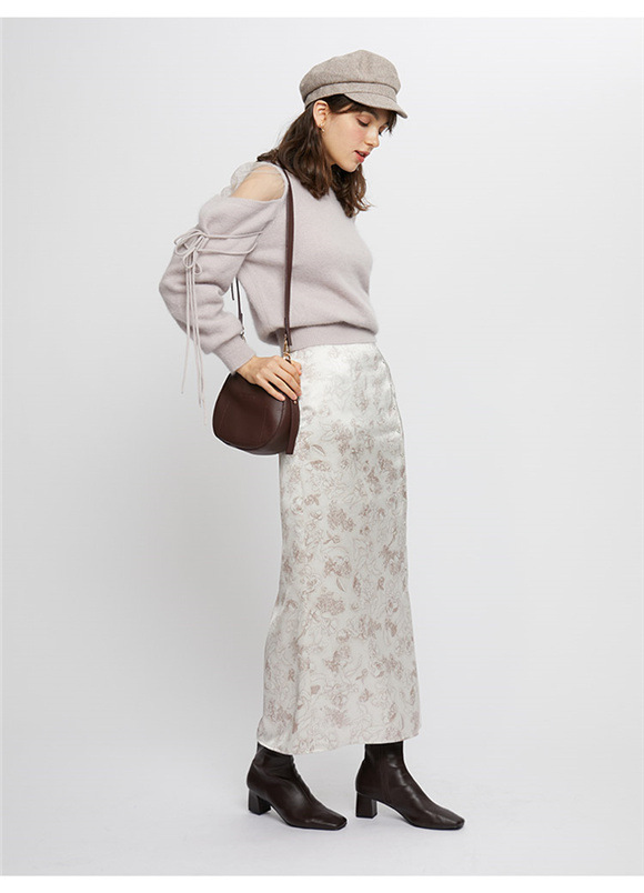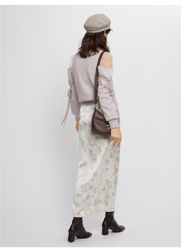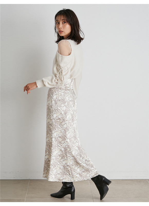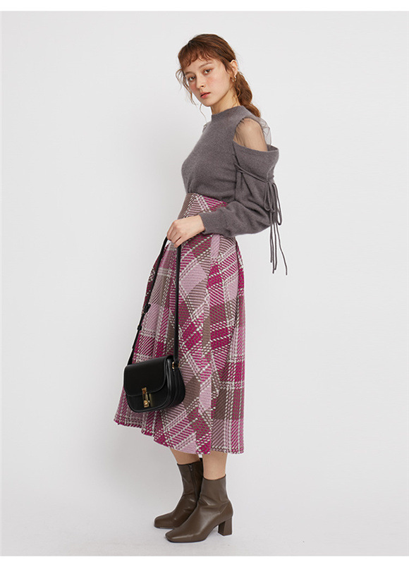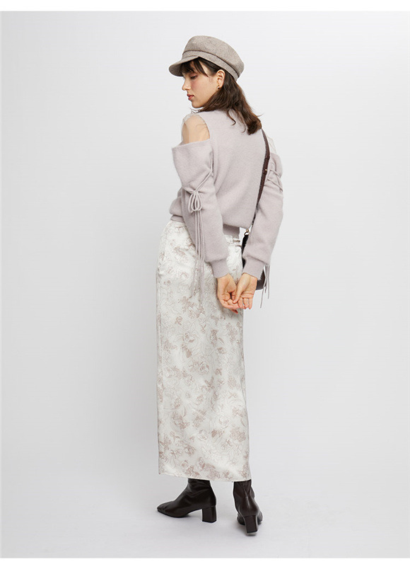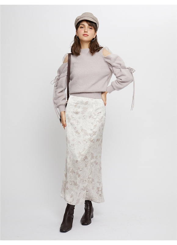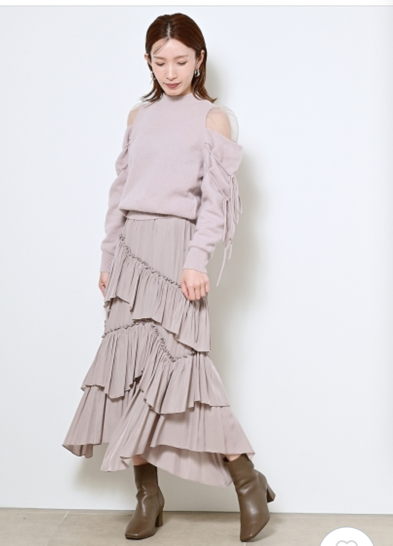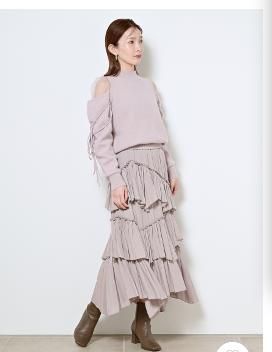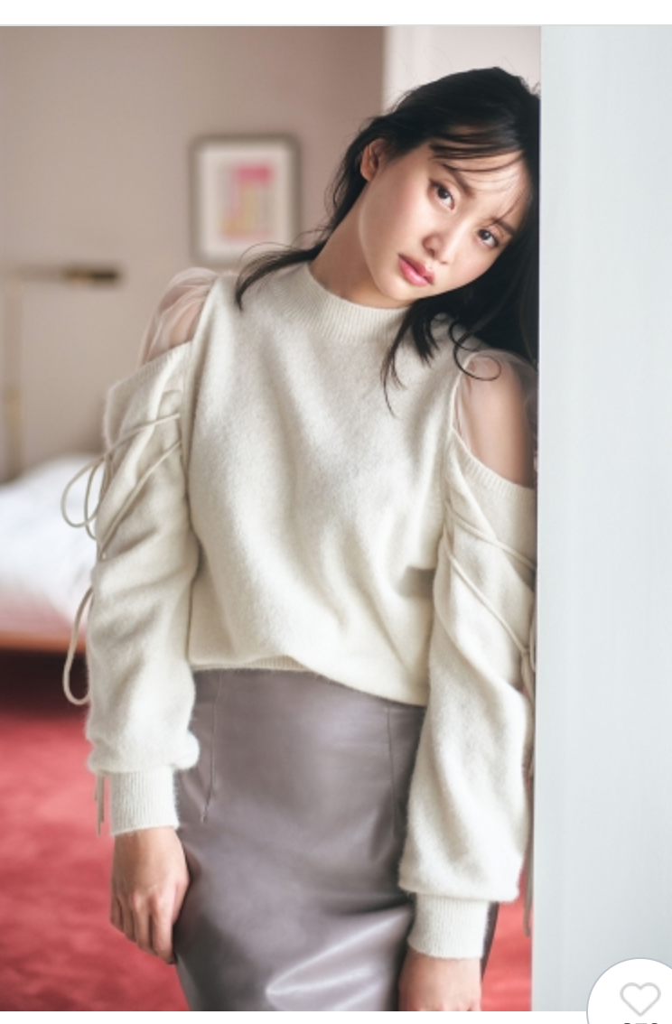「SNIDEL」の代名詞アイテムの1つでもあるシースルーショルダーニットがこの冬も登場。1番のポイントであるショルダーデザインは、繊細に透けるチュールで切り替えることで華奢な肌見せと抜け感を演出。ややハイネックの襟ぐりでモードな印象を加算しつつ、甘さのあるルックスとのバランスを意識し大人な印象に落とし込みました。ルーズに落ちる袖には2本のリボンをあしらい、優しく垂れる様子が印象的。柔らかなニットとニュアンスカラーも手伝って、「SNIDEL」ならではのフェミニンな1枚が完成しました。