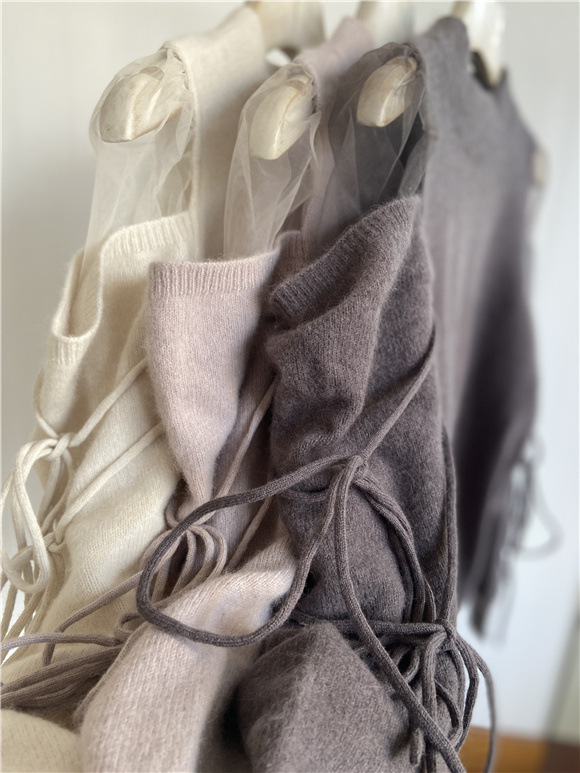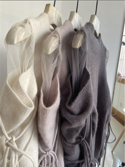 ボディ部分にはラクーン混のニットを使用し、ふんわりと毛を吹かせて柔らかく心地よく仕上げました。アイボリー、ピンクベージュ、グレーベージュのニュアンスカラー3色です。