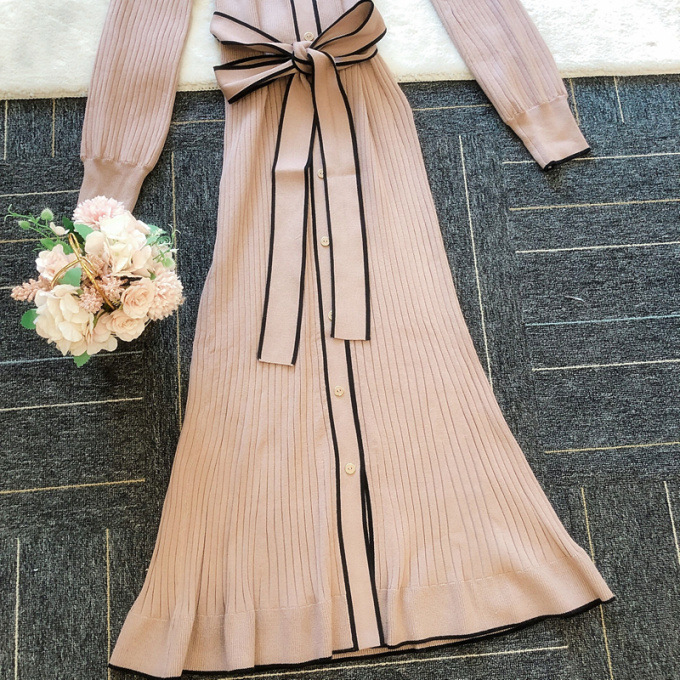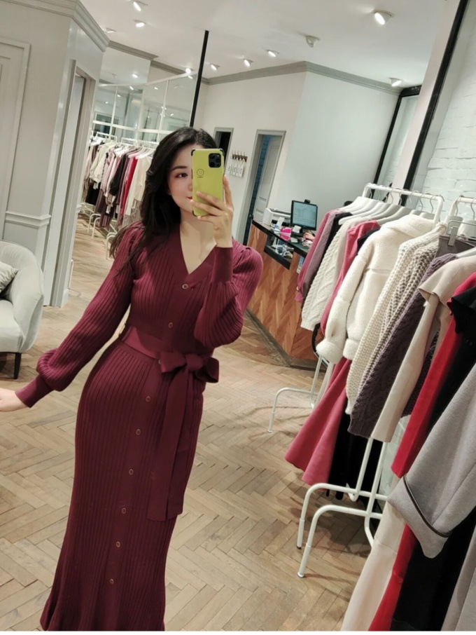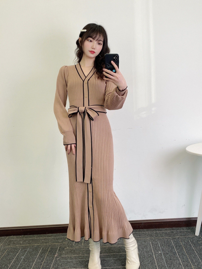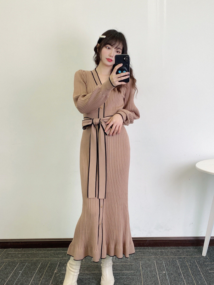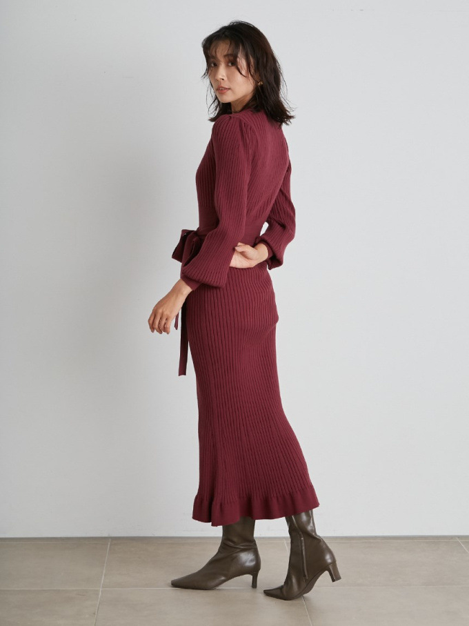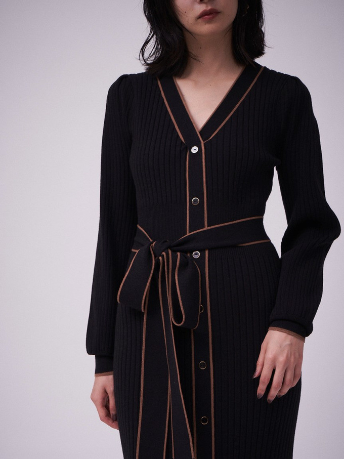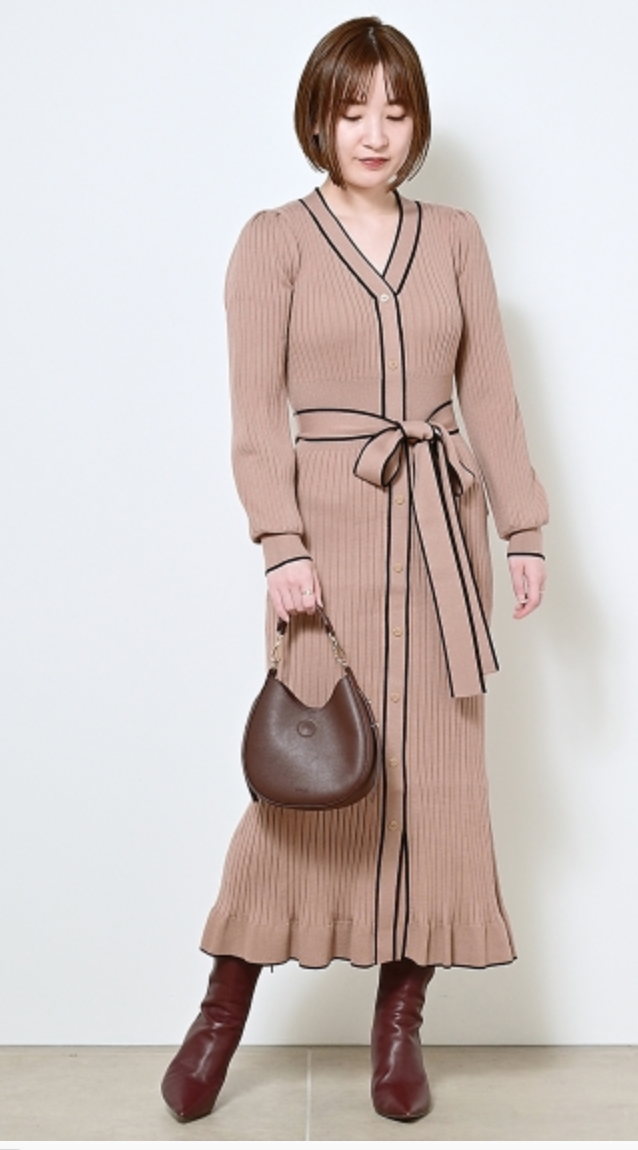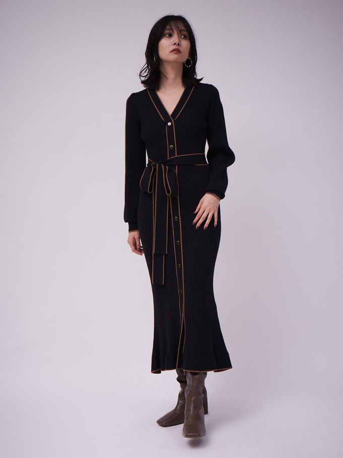 「SNIDEL」で長く愛されているフロントボタンニットワンピースに、パイピングなどのクラシカルなディティールを加え今季らしいデザインに。肩や袖にボリュームを出すことでコンサバ見えを防ぎ、従来より着丈を長くすることでどんな身長の方も着やすいようアップデートしました。深めのVネックがデコルテに色香を与え、ボディラインを美しく魅せるマーメイドとウエストベルトでとことんレディな印象に。程良く厚手のニットを使用しているので、身体を拾いすぎず安心して着ていただけます。