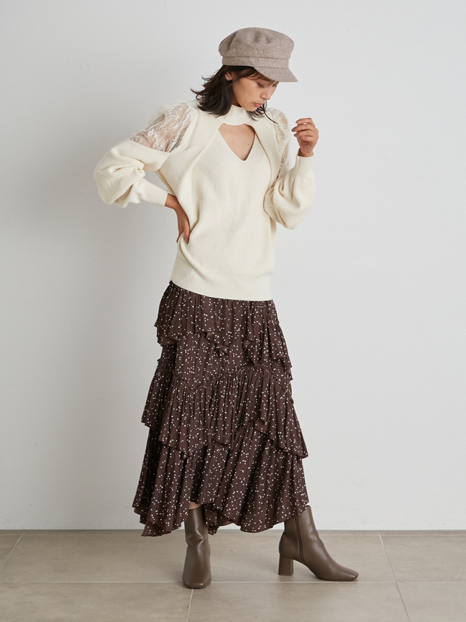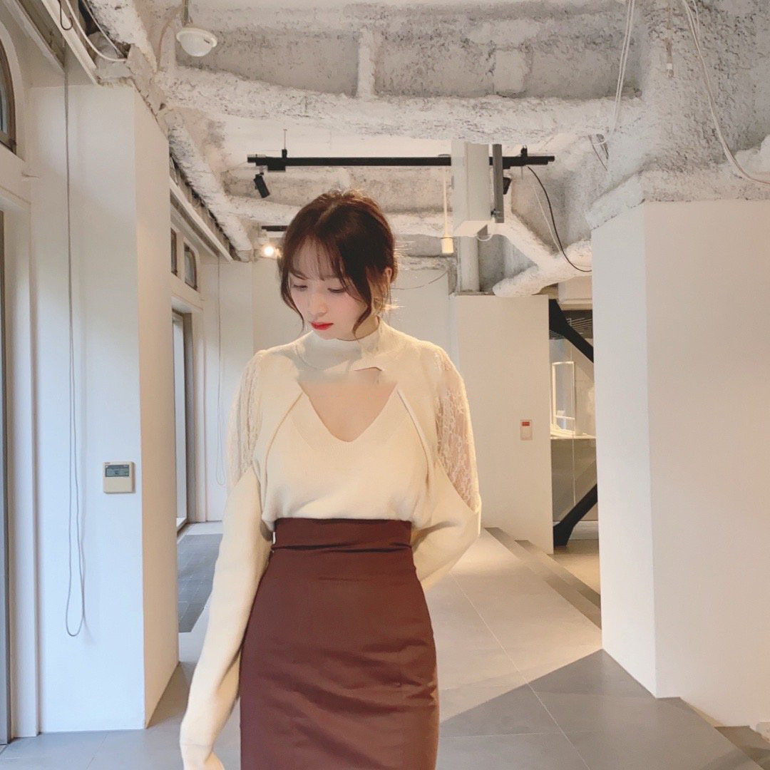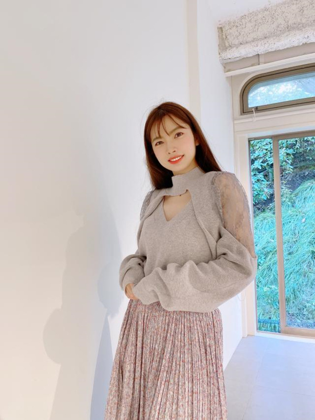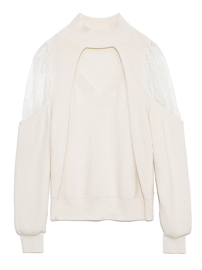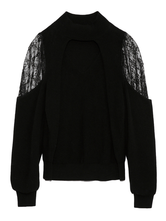 【肌見せやレースの透け感で女性らしい緩急をデザインしたレースドッキングニット】