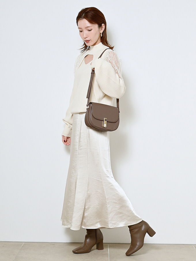レースの袖にオフショルダーのようなニットの袖を重ね、ダブルスリーブでデザインした高感度なニットトップス。重みのあるニットにレースの透け感が相性抜群に、ヘルシーな肌魅せが大人の色香を纏います。品の良いタートルと胸元カッティングのギャップも美しく、深めのタックで肌が見えるバランスを調整。隠す部分と見せる部分のコントラストにこだわり、女性らしさを引き出す魅力的な1着が完成しました。