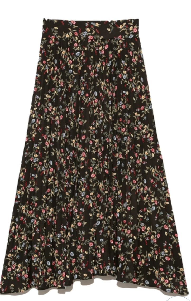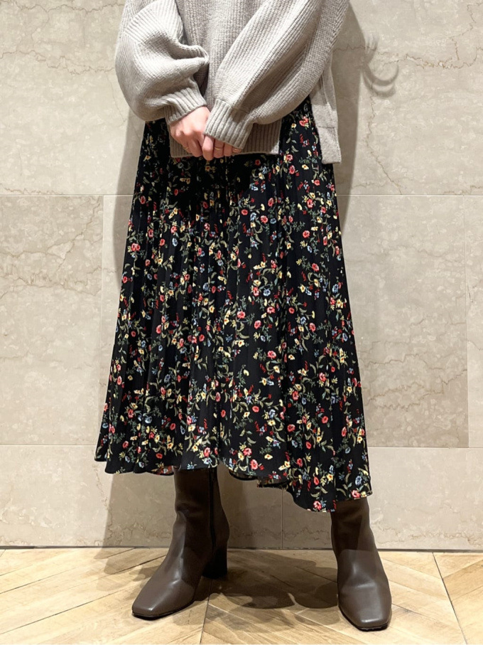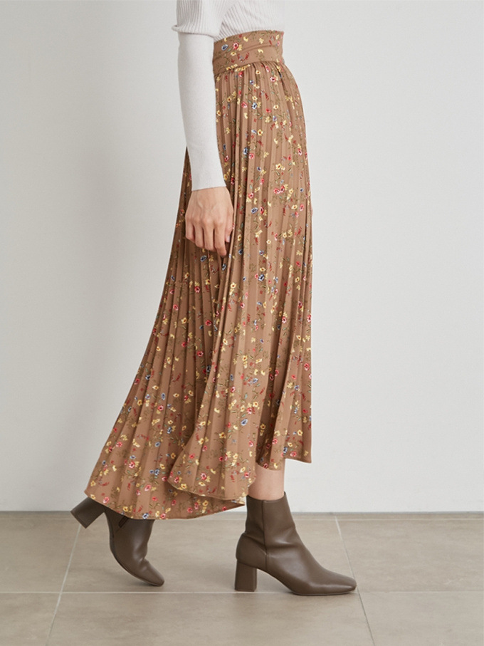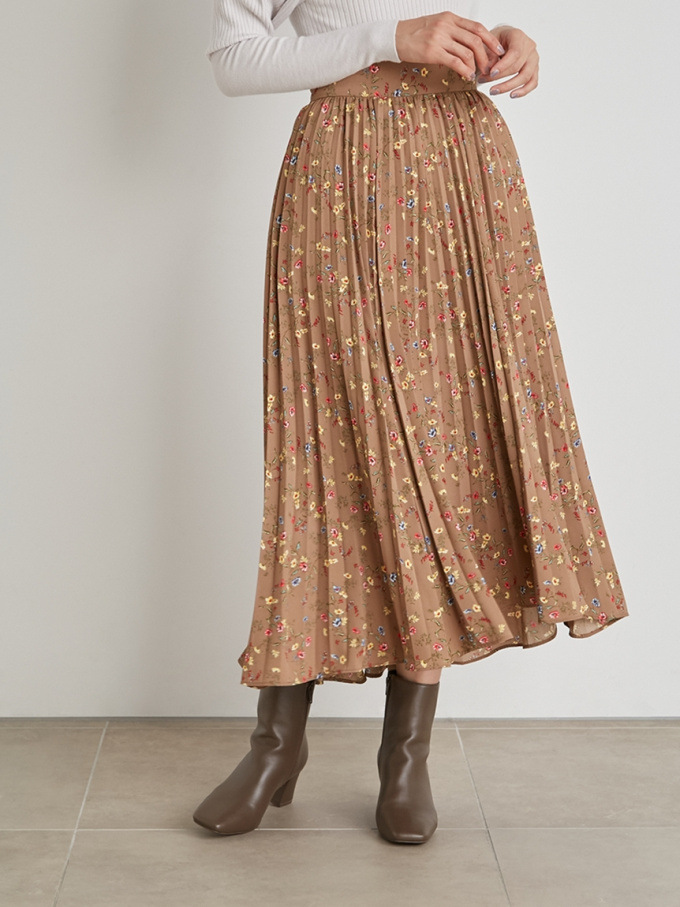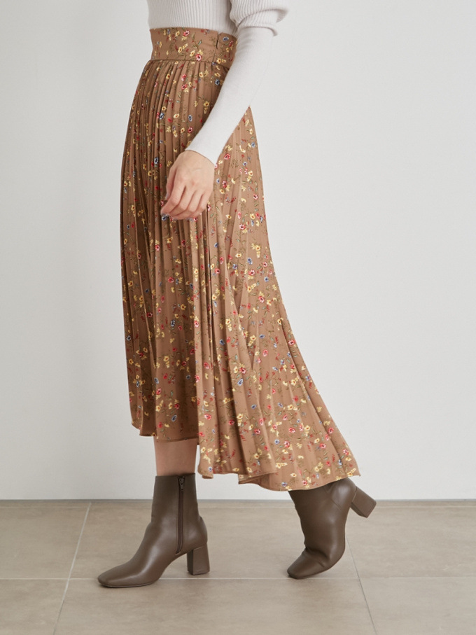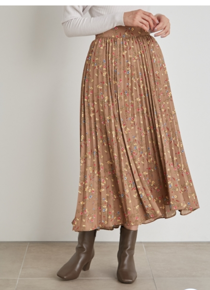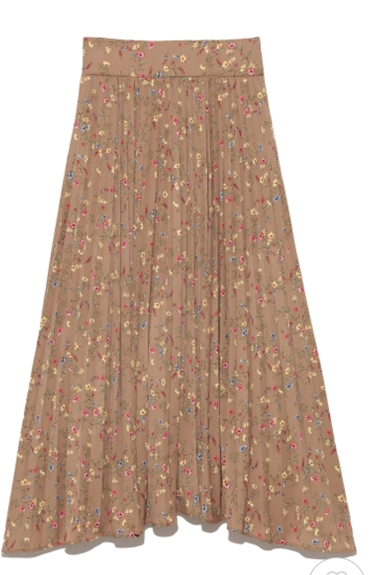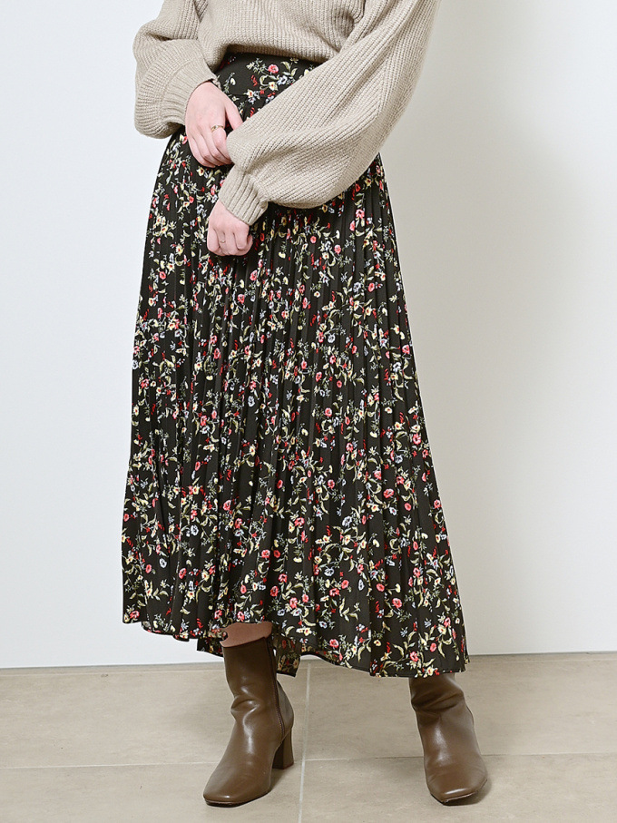 【シックな小花柄とイレギュラーヘムが印象的なプリントプリーツスカート】
