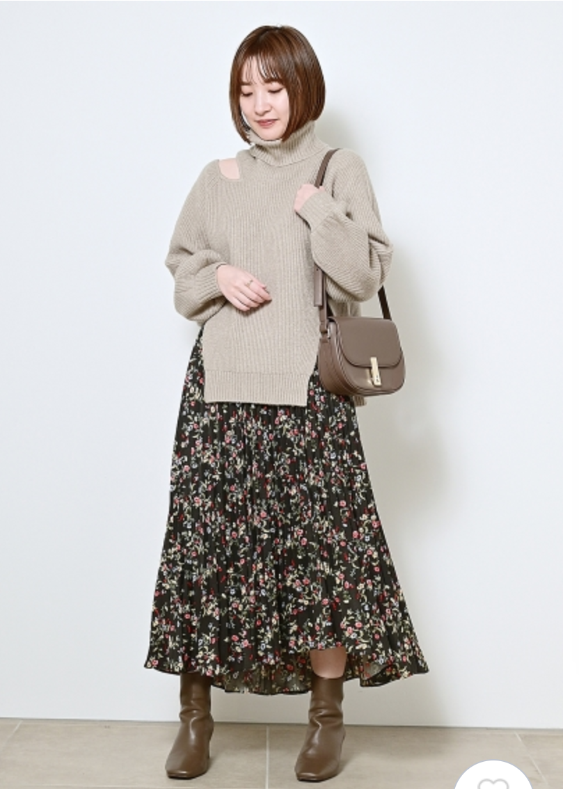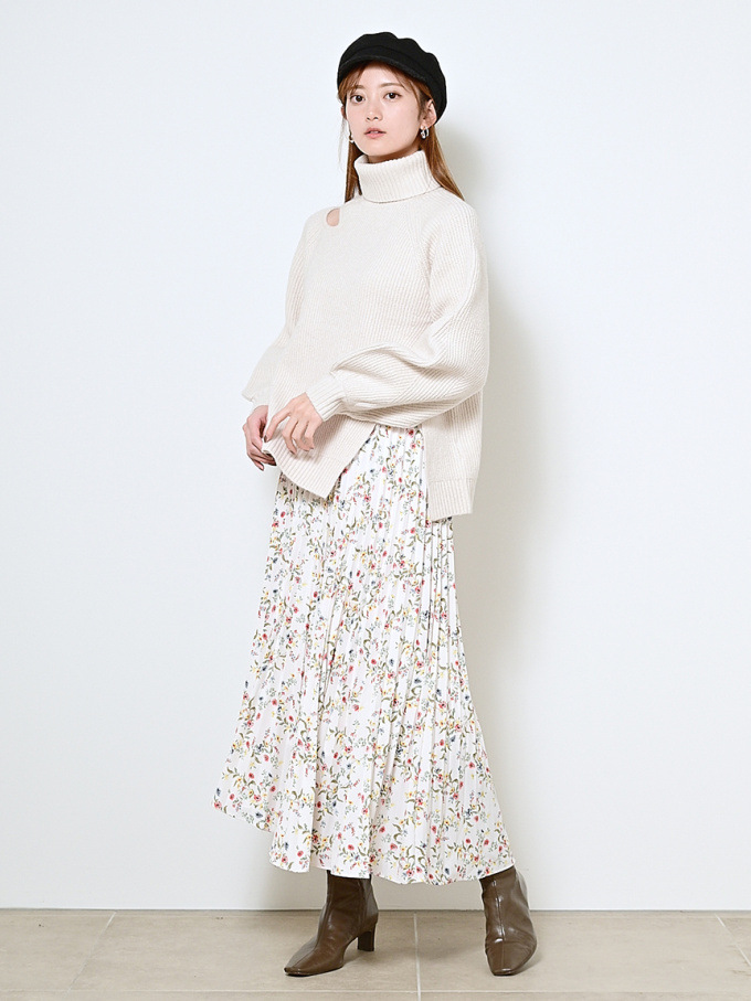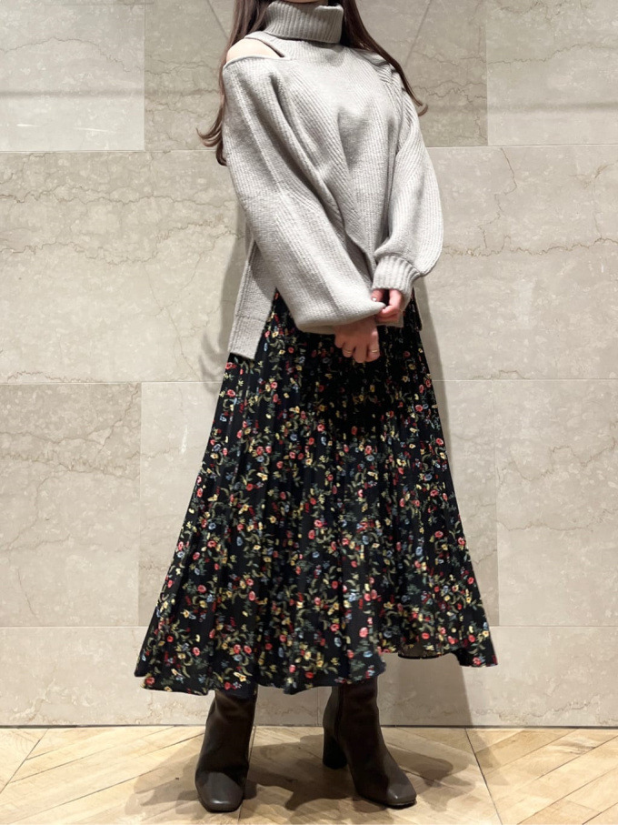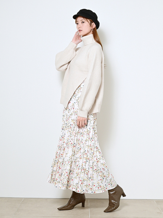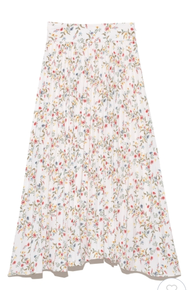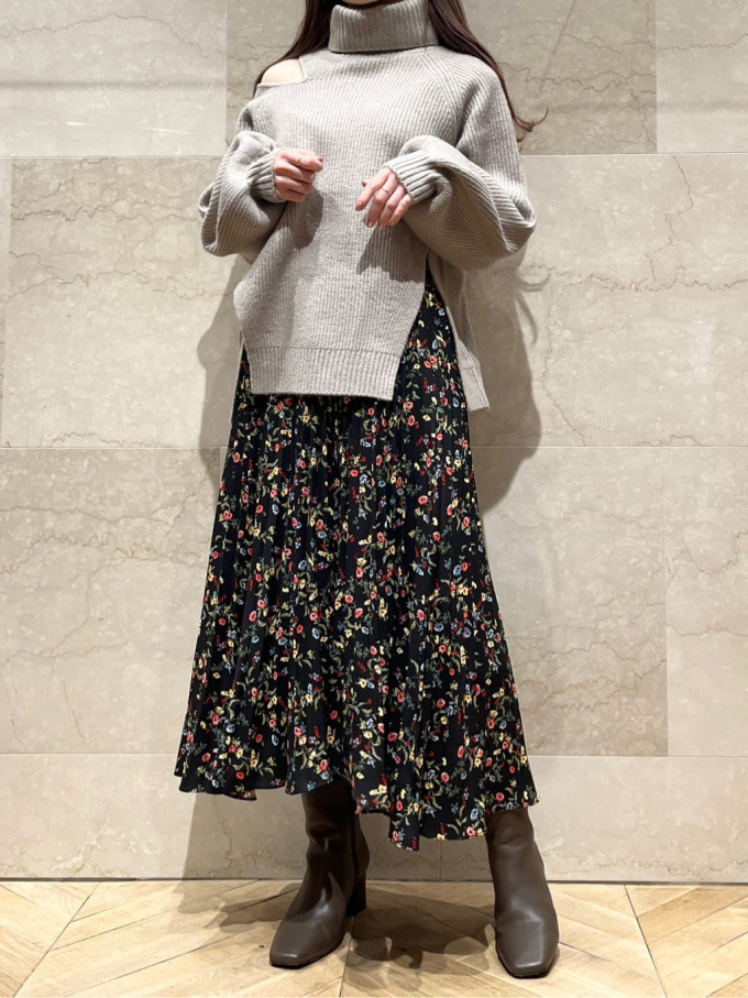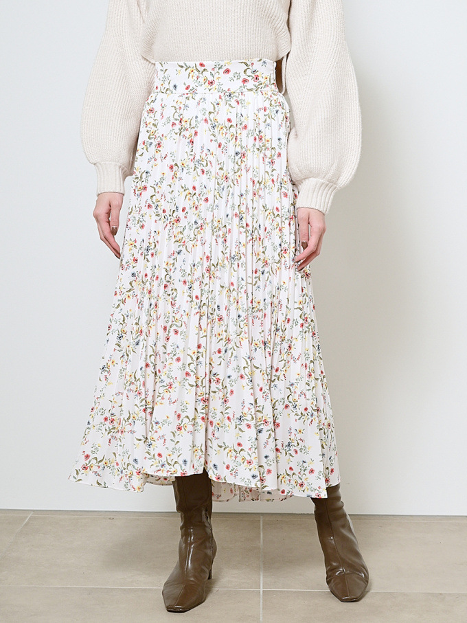 【シックな小花柄とイレギュラーヘムが印象的なプリントプリーツスカート】