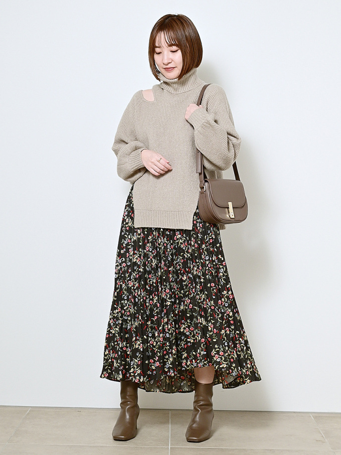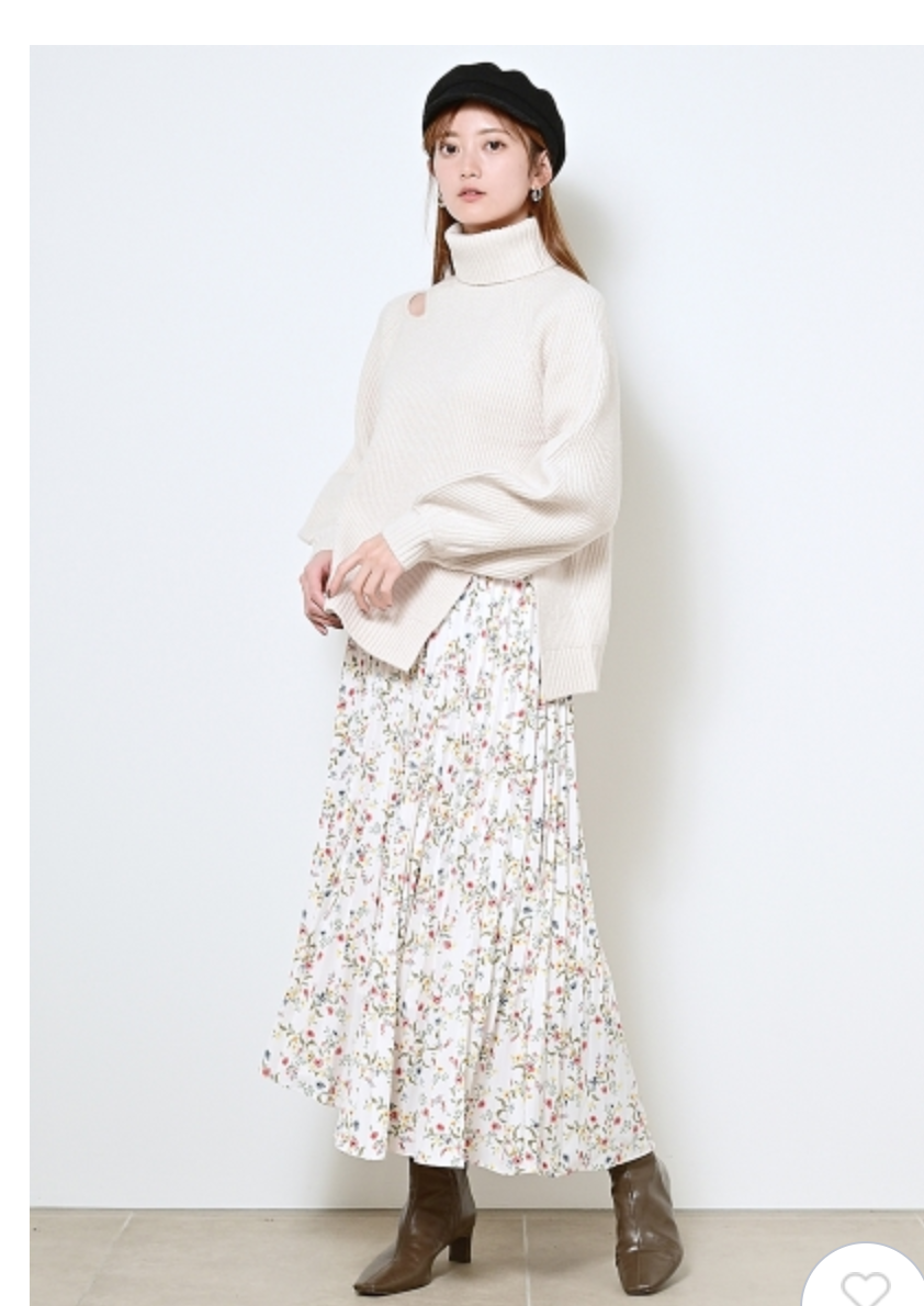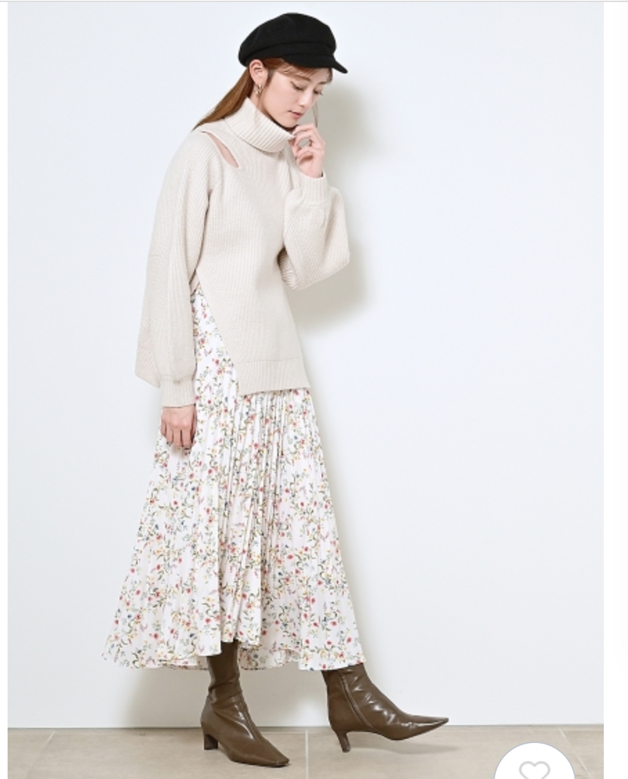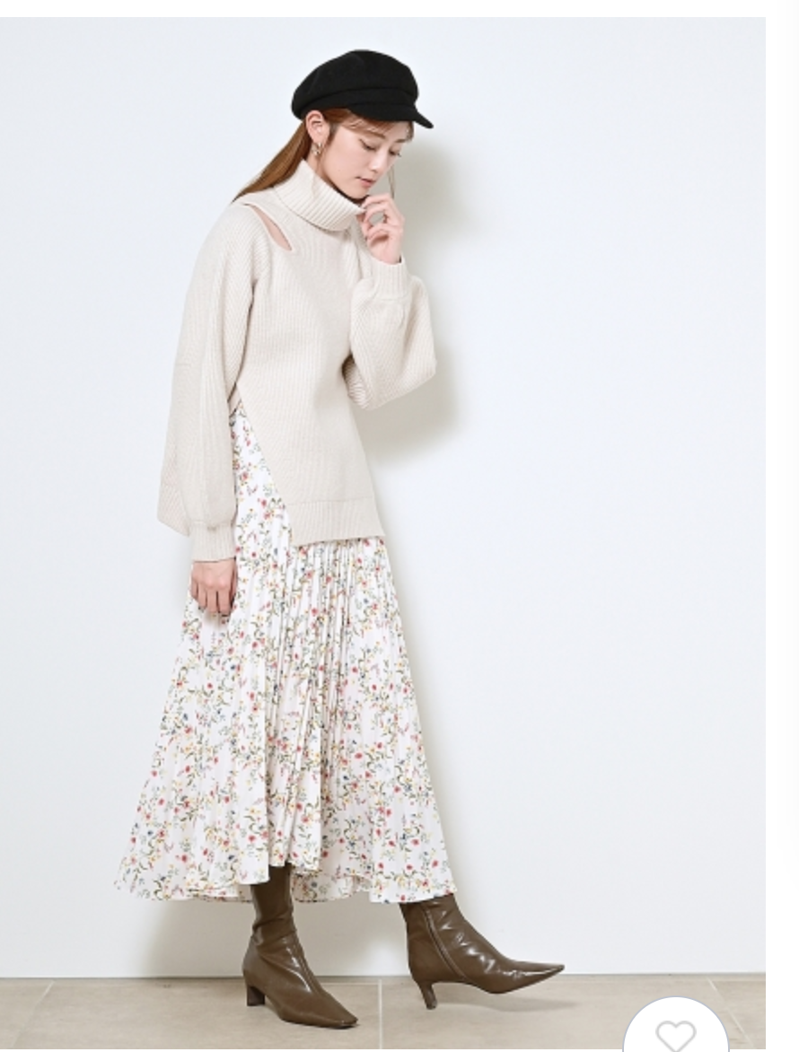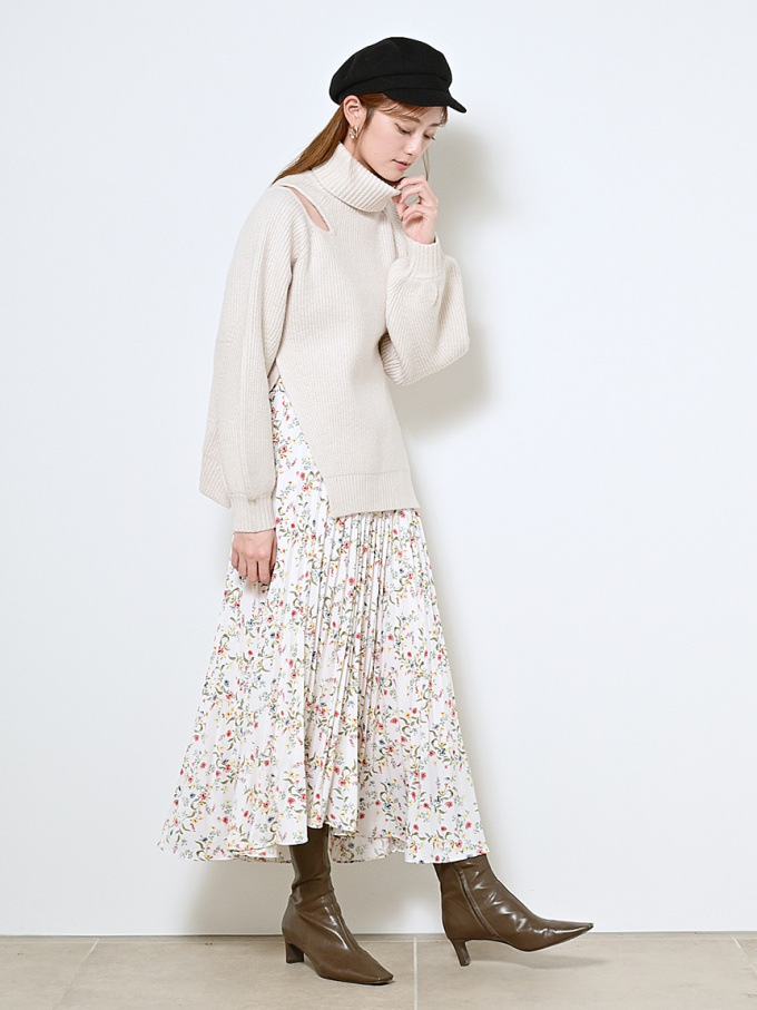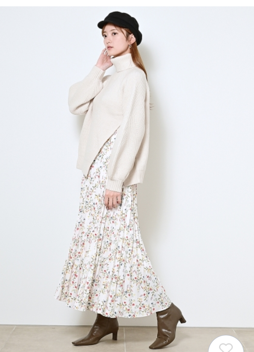【シックな小花柄とイレギュラーヘムが印象的なプリントプリーツスカート】