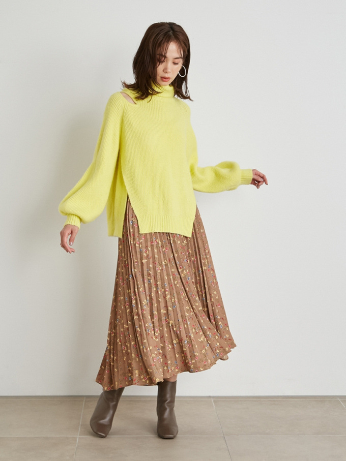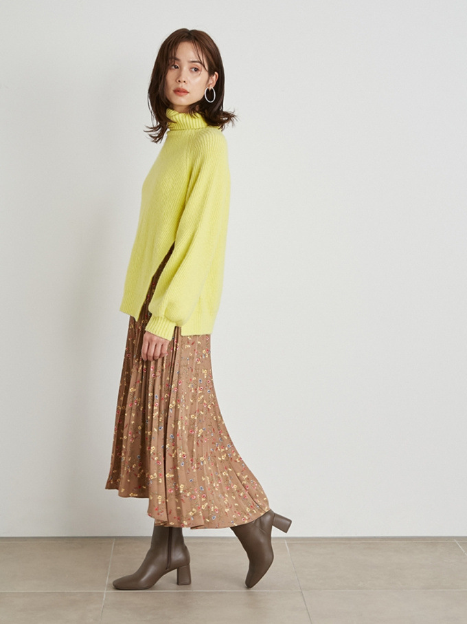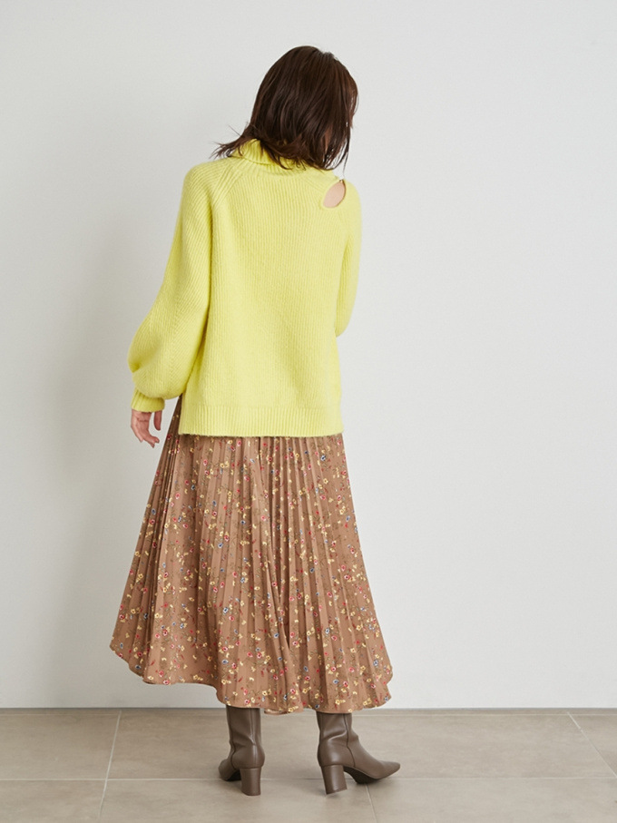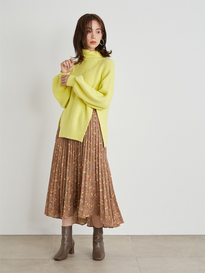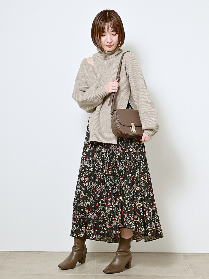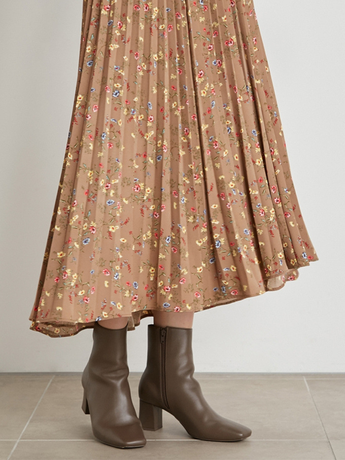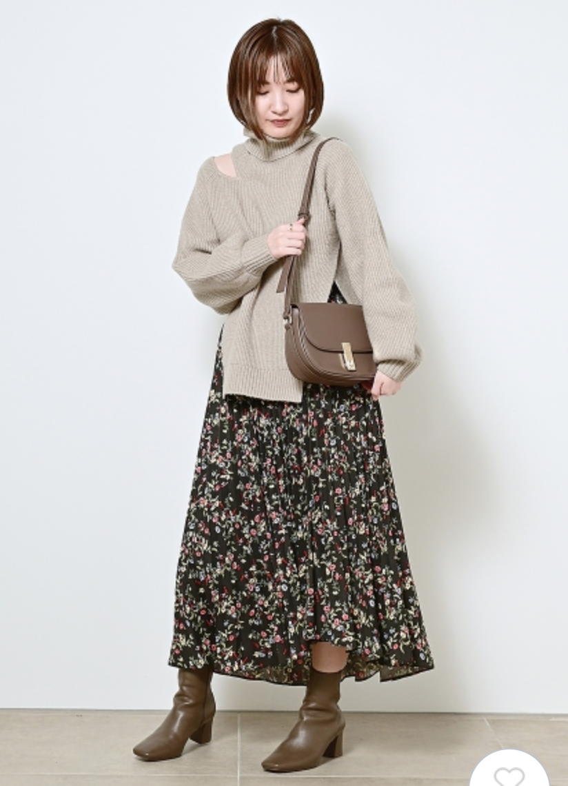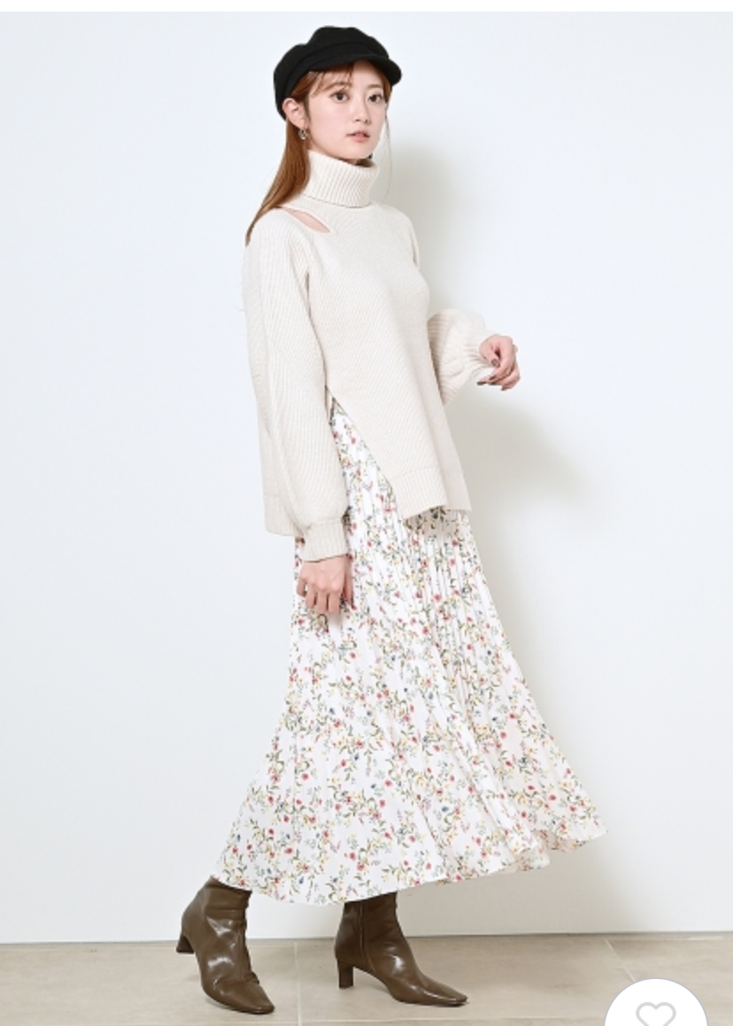 【シックな小花柄とイレギュラーヘムが印象的なプリントプリーツスカート】