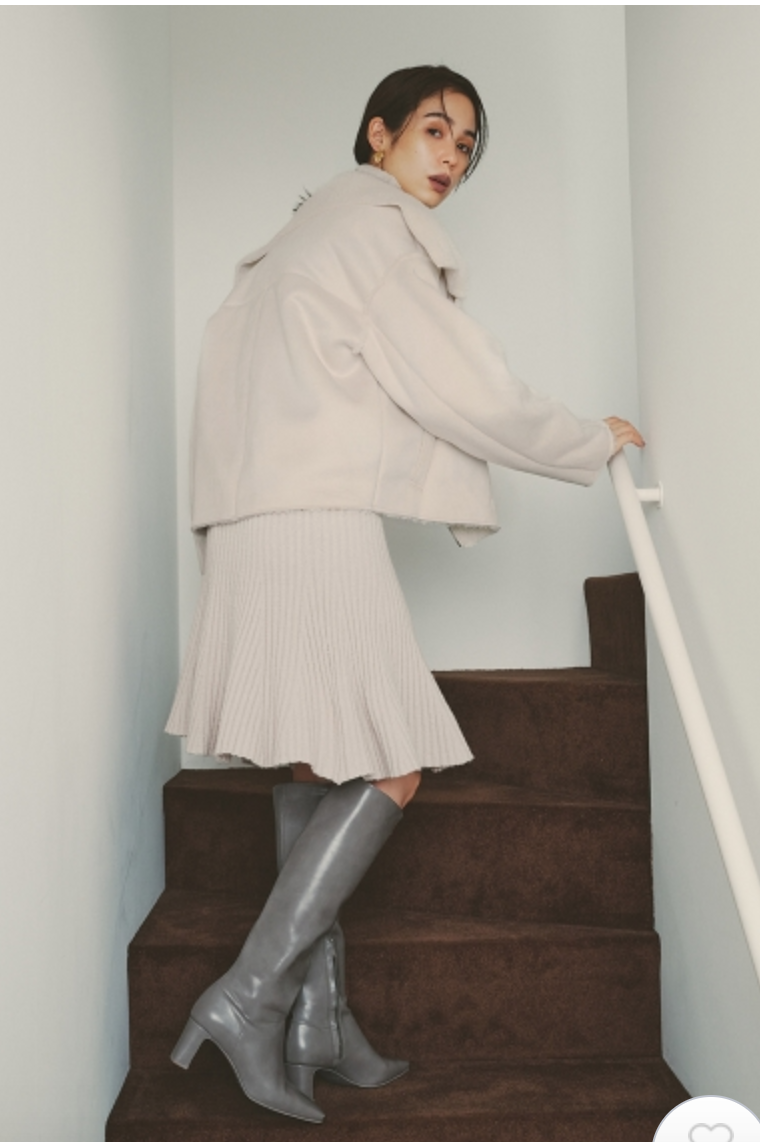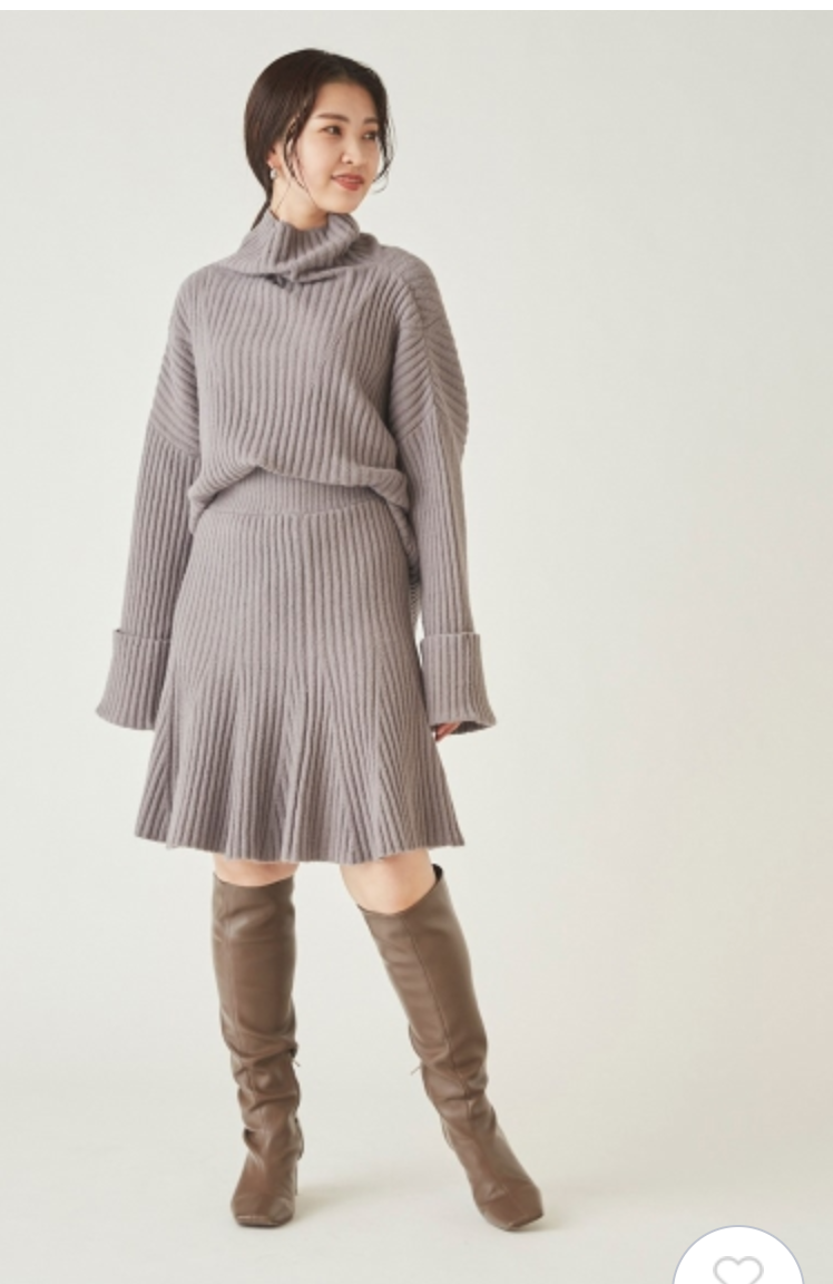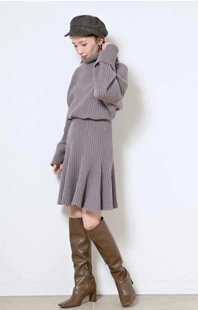 立体感のある太めのリブ編みが印象的なニットセットアップ。トップスは大きなタートルネックと折り返しのワイドスリーブで、ゆるっとラフな雰囲気に仕上げました。ロングブーツと相性の良い膝丈デザインのスカートは、裾にかけて広がるフレアシルエットでフェミニンな印象に。トップスはアウトでも前だけインでも、ミニマルに愛らしく着用いただけます。