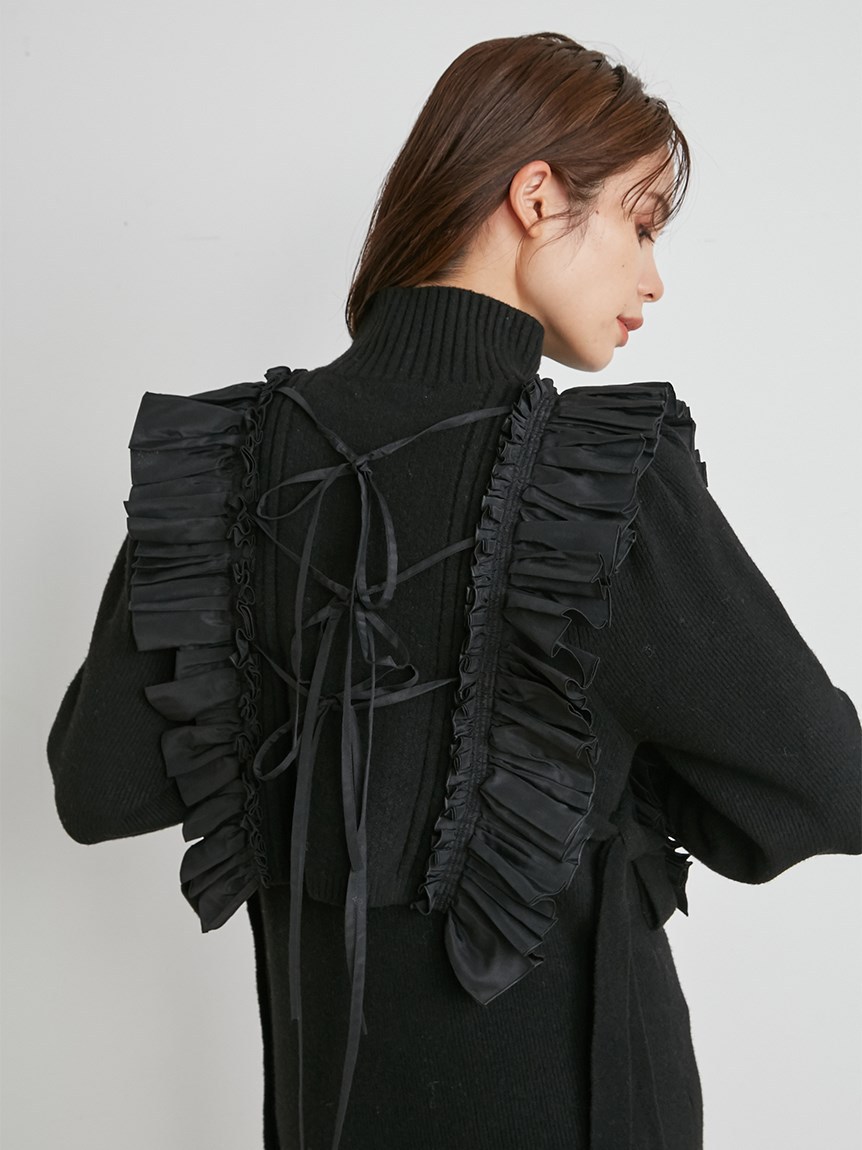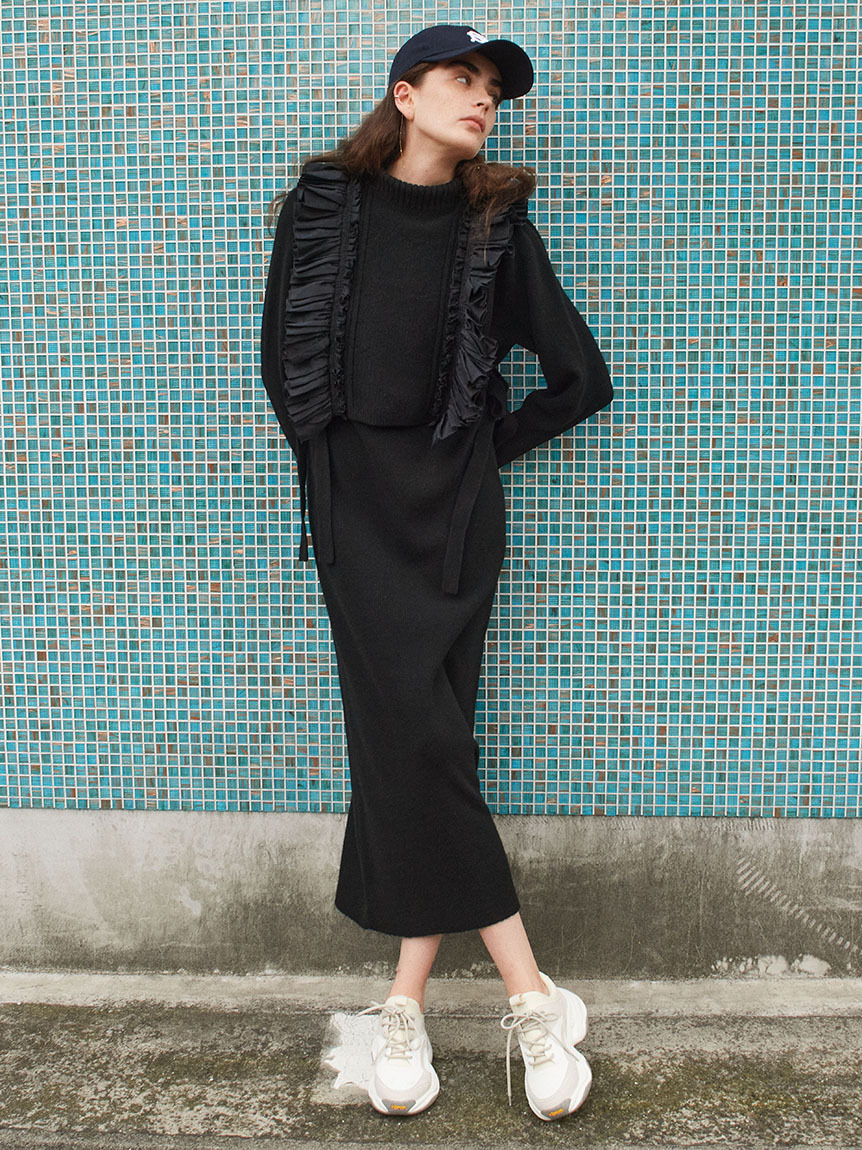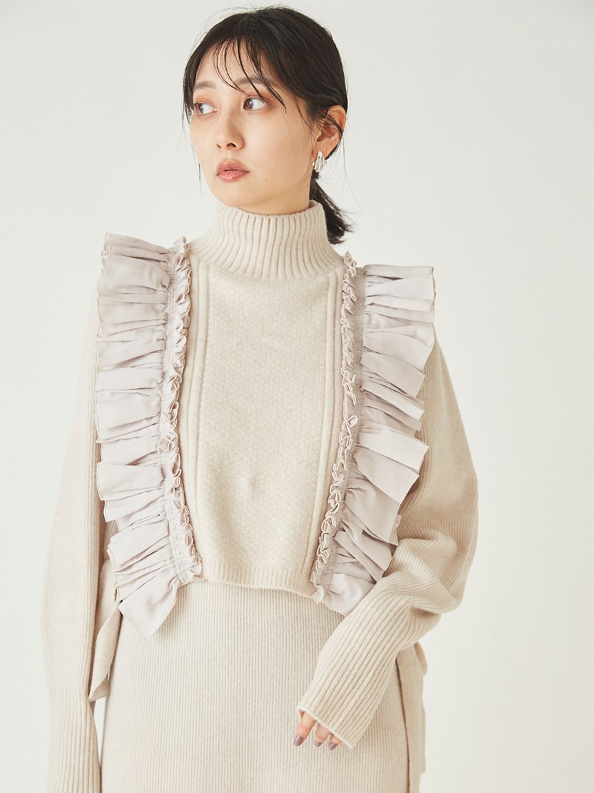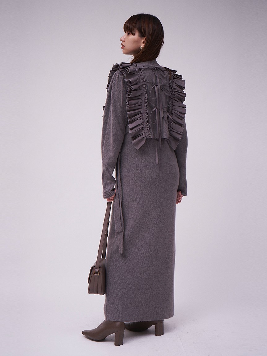 ニットワンピースとフリルベストをセットにしたレイヤードアイテム。大胆なフリルが印象的なニットベストは、大人のロマンティックを叶えた絶妙なデザインバランスが魅力。身頃部分は鹿の子編みとリブ編みを組み合わせ、微光沢の布帛フリルで華やかさをプラスしました。フリルはタックをふんだんに使っているので甘くなりすぎないのもポイント。後ろ姿まで愛らしく、3つ並べた華奢リボンもこだわりのディティールです。ニットワンピースは、Iラインシルエットとクルーネックでシンプルに。デザイン性の高いベストを引き立たせ、オフの日の1枚着としてもイージーに着用いただけます。