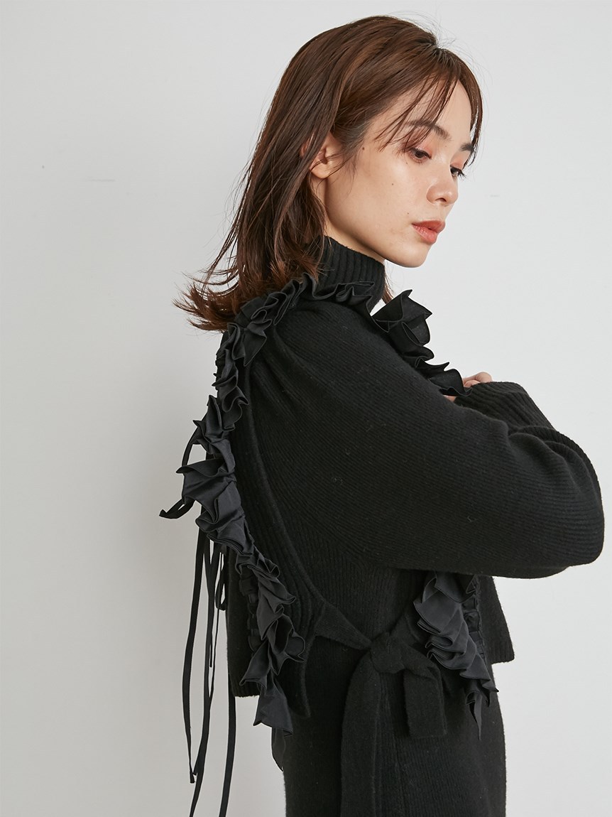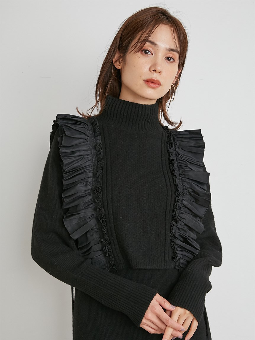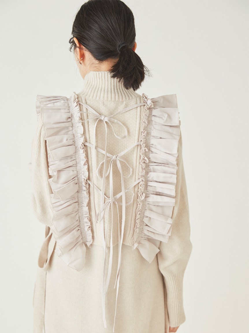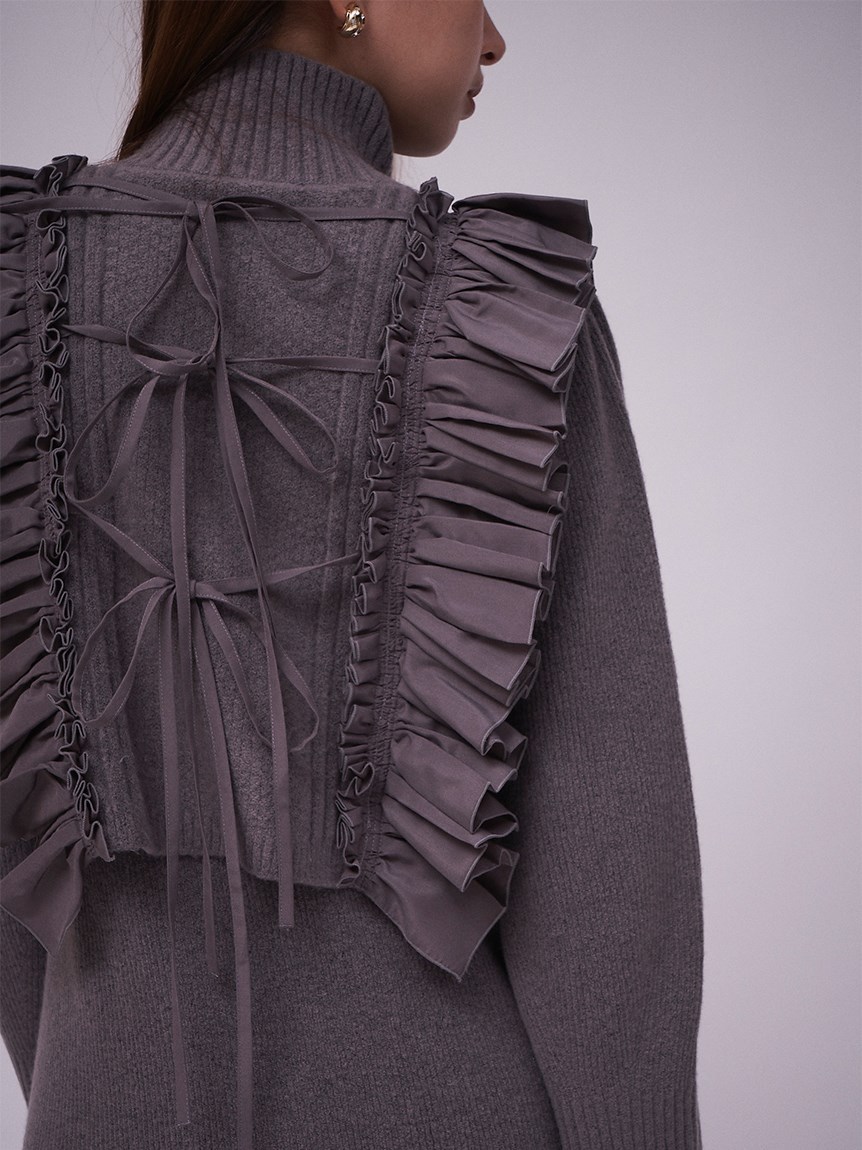 ニットワンピースとフリルベストをセットにしたレイヤードアイテム。大胆なフリルが印象的なニットベストは、大人のロマンティックを叶えた絶妙なデザインバランスが魅力。身頃部分は鹿の子編みとリブ編みを組み合わせ、微光沢の布帛フリルで華やかさをプラスしました。フリルはタックをふんだんに使っているので甘くなりすぎないのもポイント。後ろ姿まで愛らしく、3つ並べた華奢リボンもこだわりのディティールです。ニットワンピースは、Iラインシルエットとクルーネックでシンプルに。デザイン性の高いベストを引き立たせ、オフの日の1枚着としてもイージーに着用いただけます。