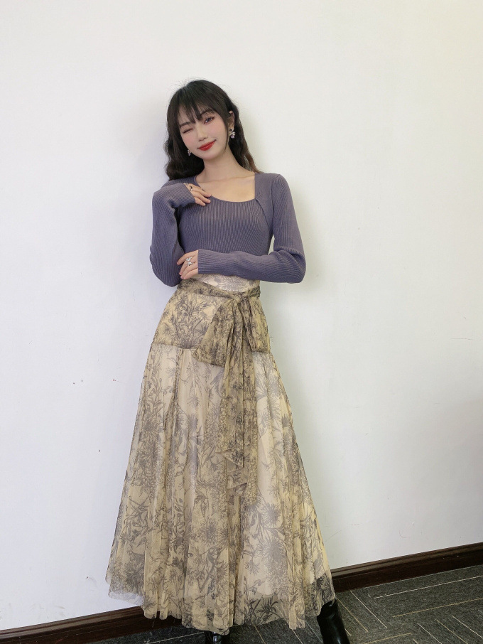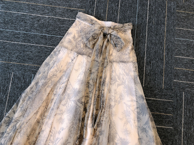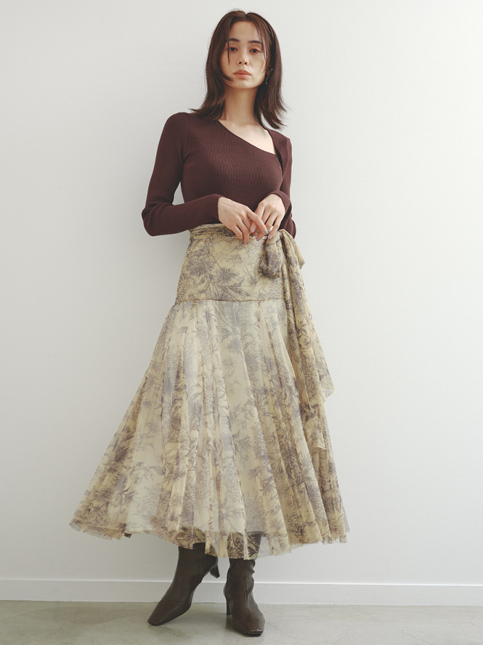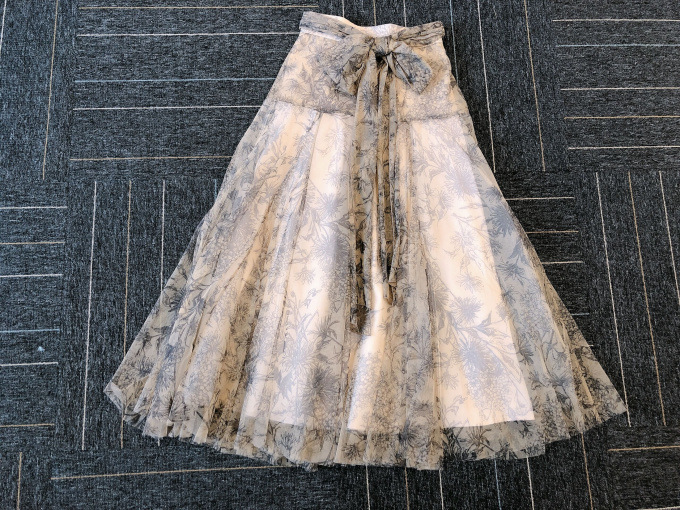 クリスマスのホリデーシーズンから春にかけ、幅広いシーンにお使いいただけるチュールスカート。ウエストからヒップにかけてすっきりと仕上げ、チュールの膨らみを抑えることで着膨れしない美しいシルエットを実現しました。ウエストには表地と同じ生地のリボンをワンポイントであしらい、取り外しが可能なのでシーンに合わせてアレンジいただけます。コーディネートに華をプラスする、ヴィンテージライクな花柄が一押しです。