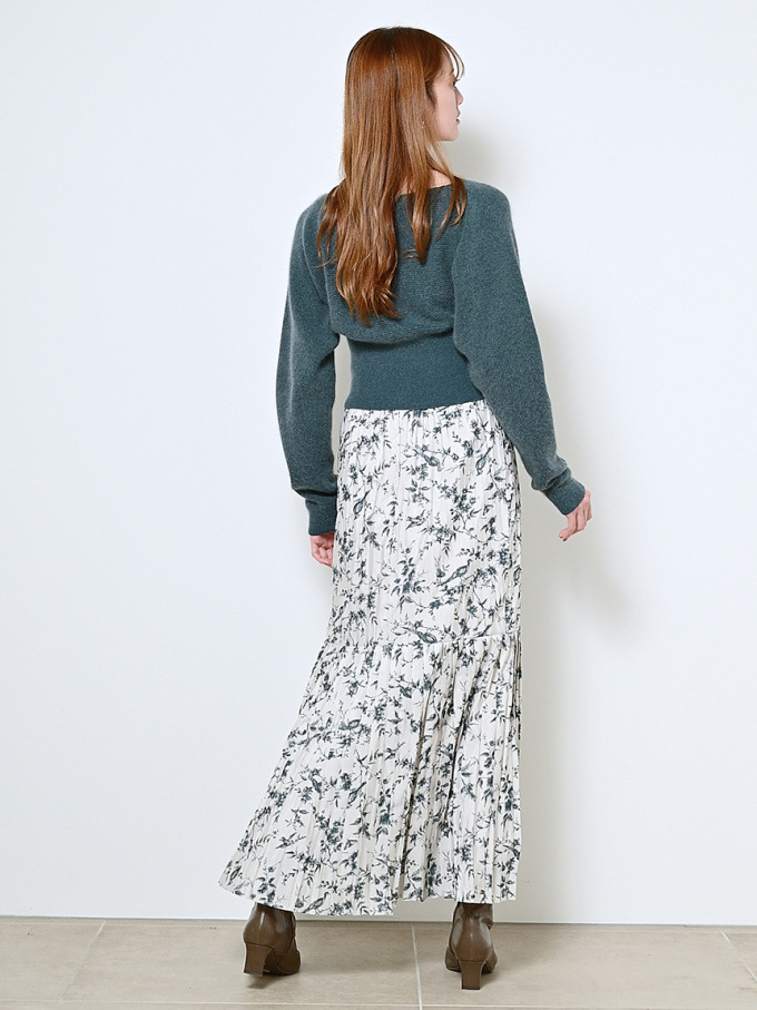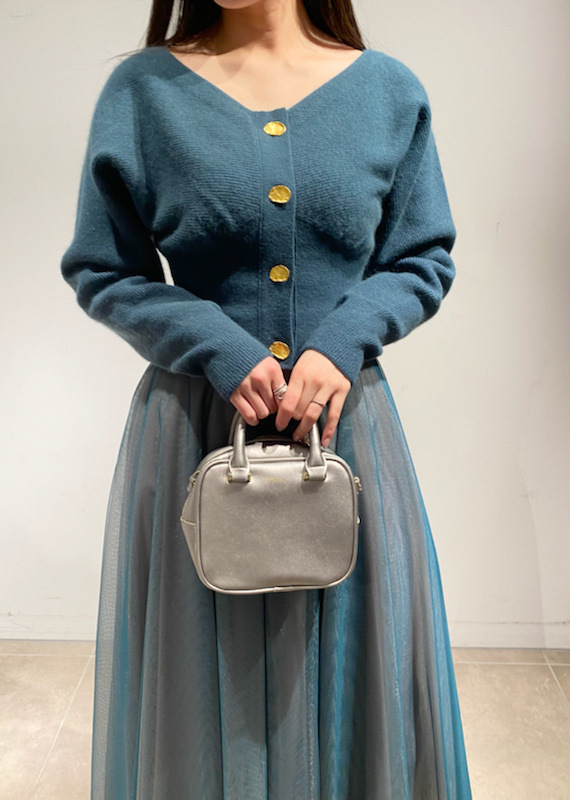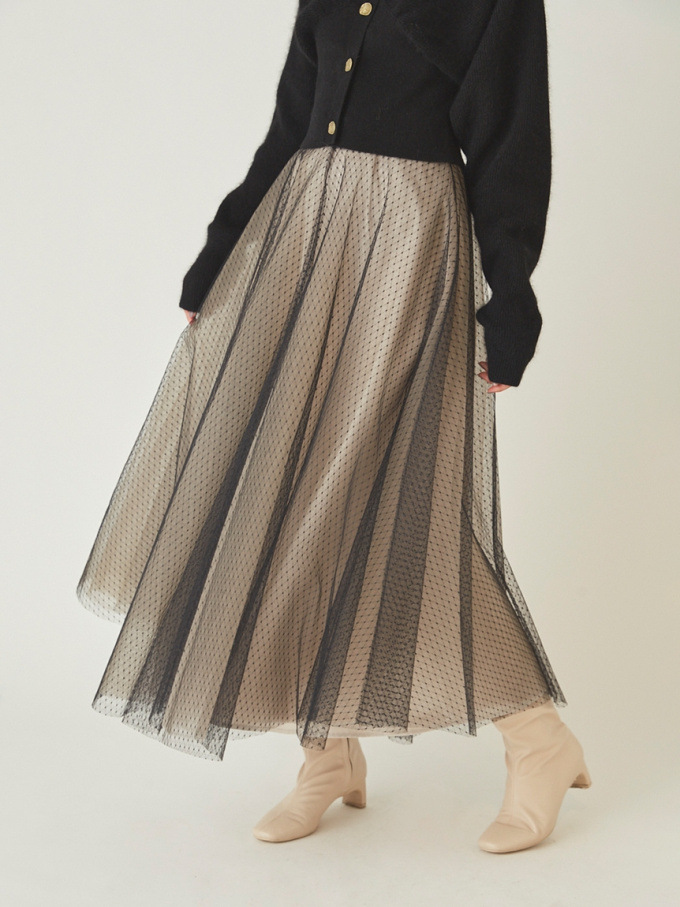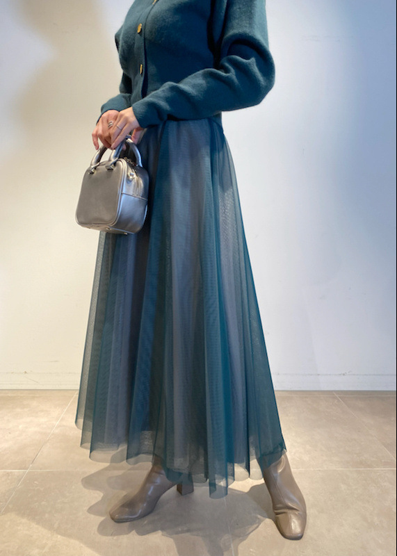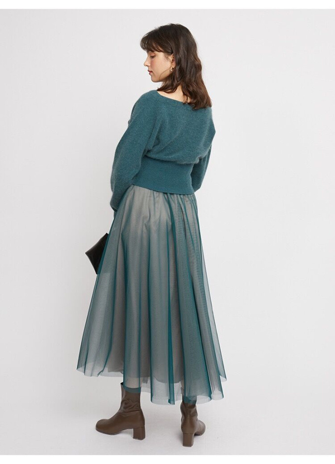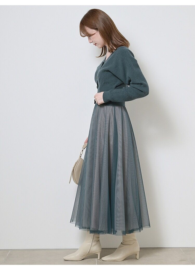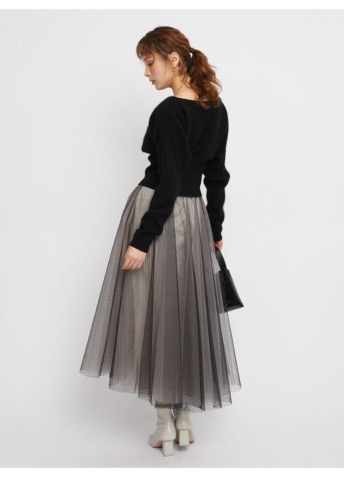 ニットにはやや起毛感のある柔らかな糸を、スカートは繊細なチュールと張りのある布帛生地を2層に重ねました。ライトピンク、グリーン、ブラックの3色展開です。