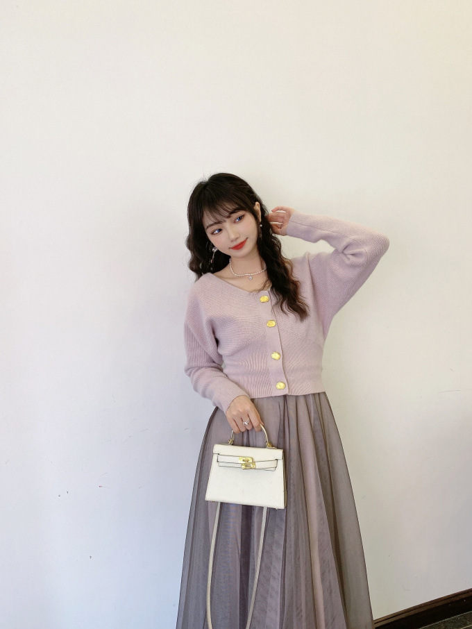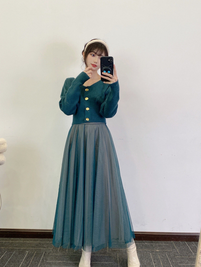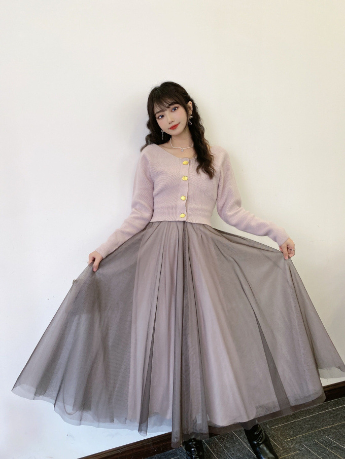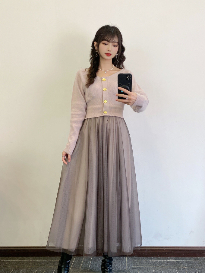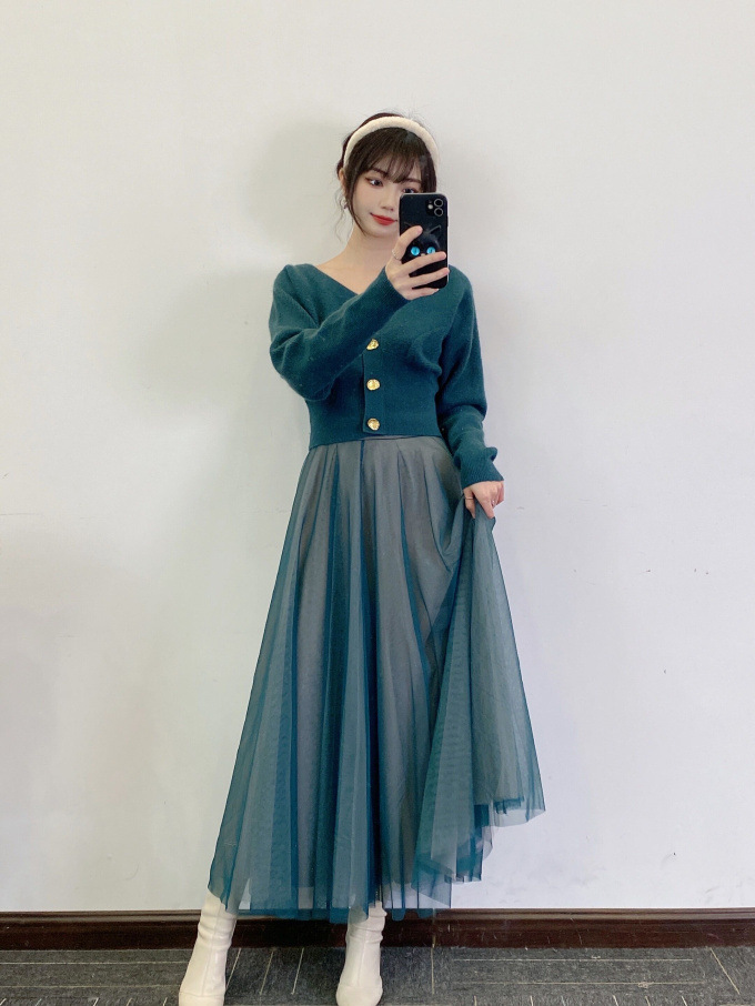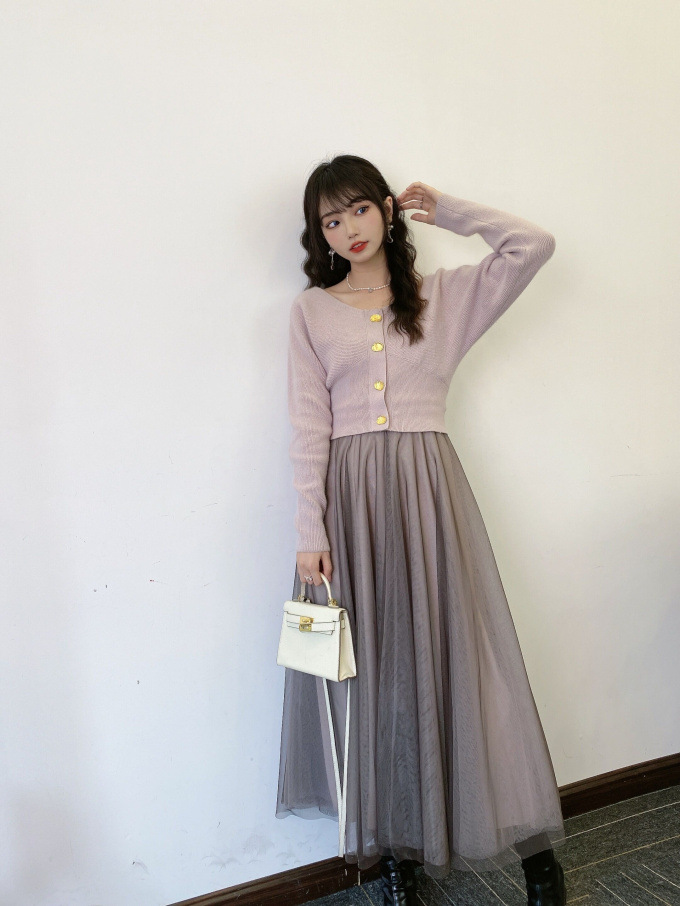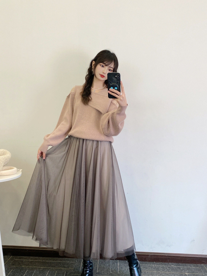 ニットにはやや起毛感のある柔らかな糸を、スカートは繊細なチュールと張りのある布帛生地を2層に重ねました。ライトピンク、グリーン、ブラックの3色展開です。