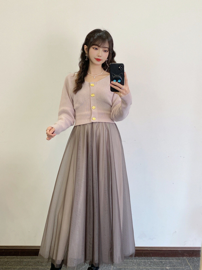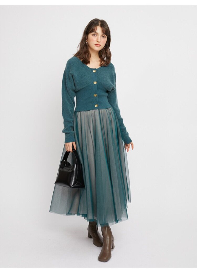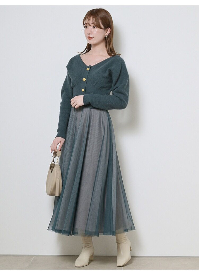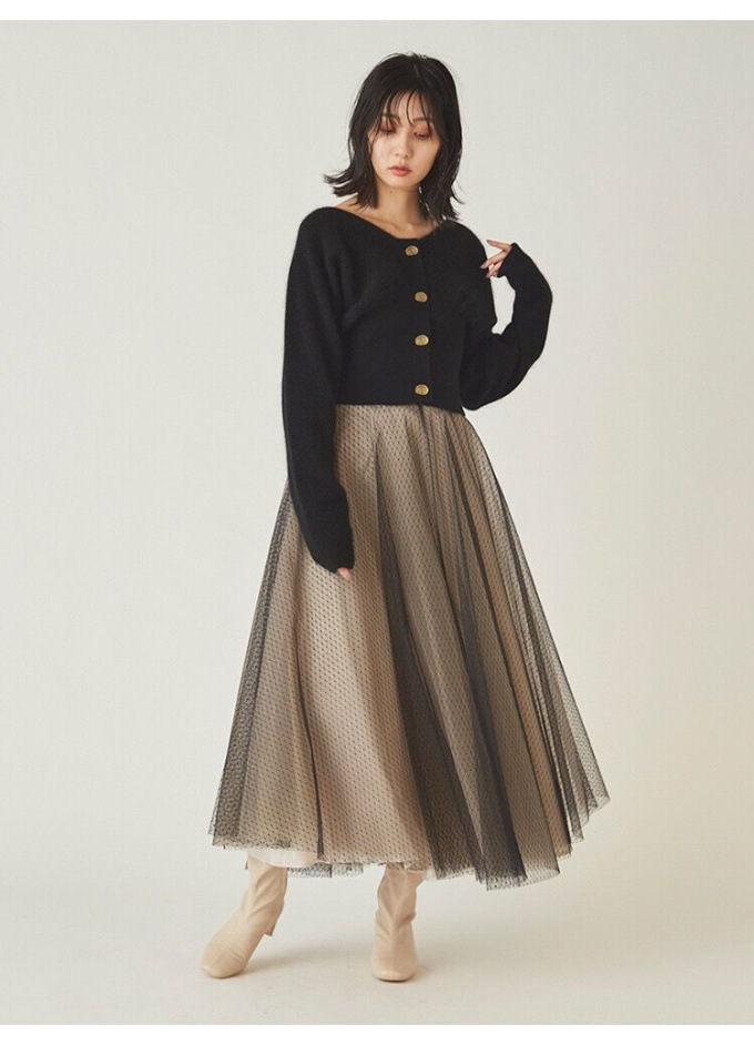 1枚で王道のフェミニンスタイルが完成する、カーディガンとワンピースのセットアイテム。「SNIDEL」人気のデザインを落とし込んだカーディガンは、女性らしいラインを強調するシルエットが特徴。胸下切替えのコルセット調ディティールで、スタイルアップとレディムードを叶えました。たっぷりのチュールを使用したスカートは、エレガントなボリューム感と計算された生地の透け感がこだわりポイント。ニットの重さとチュールの軽やかさがベストマッチし、異素材のコントラストも楽しめるよう組み合わせています。