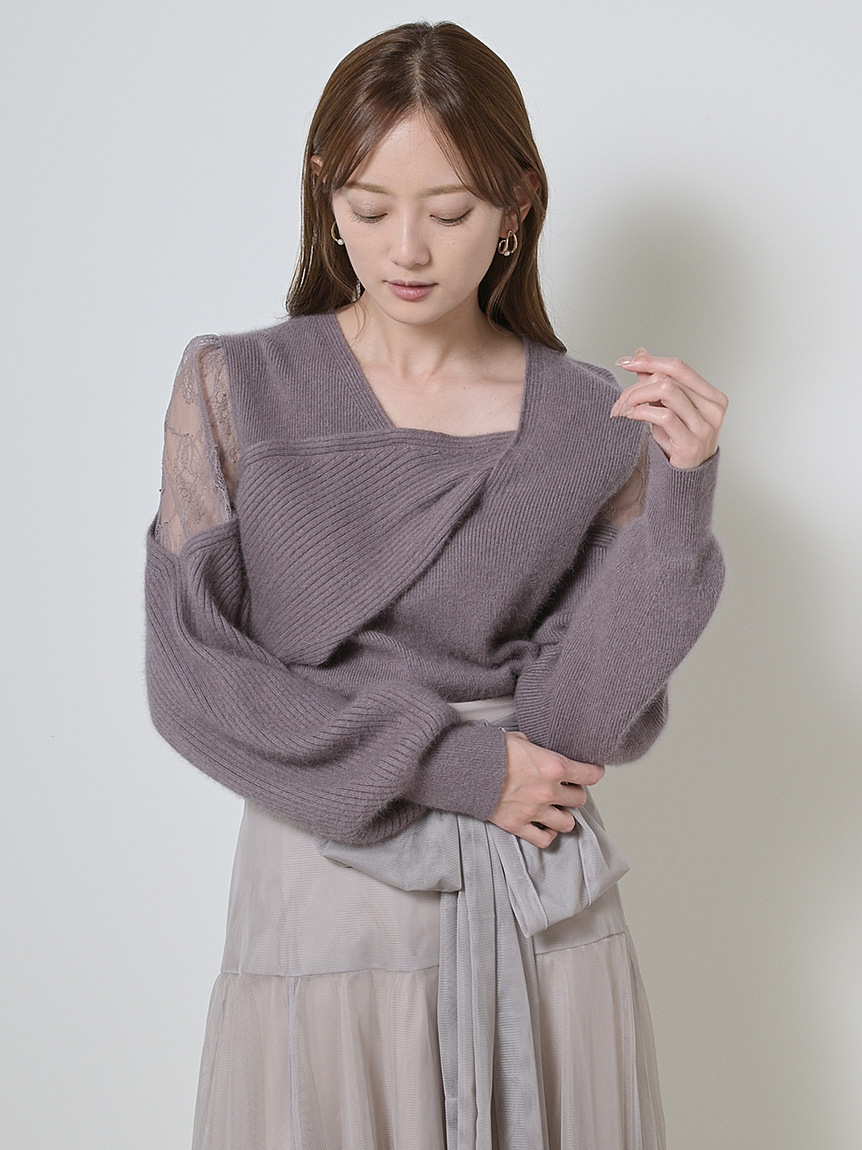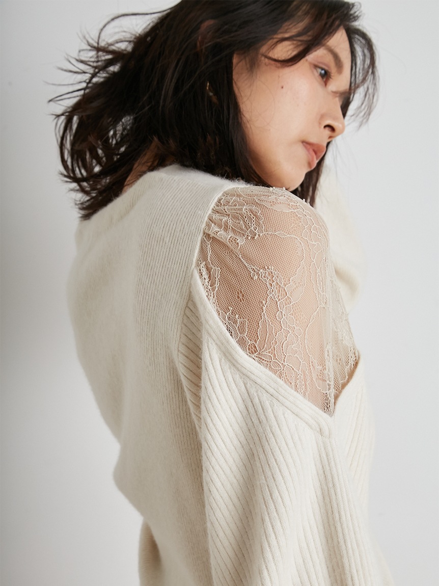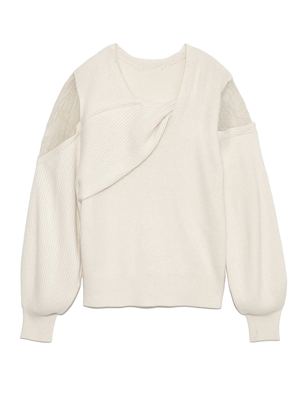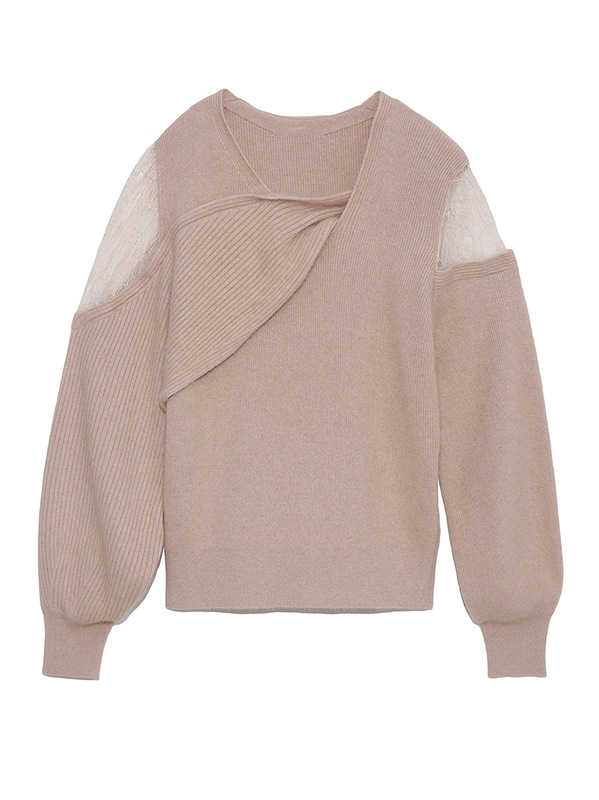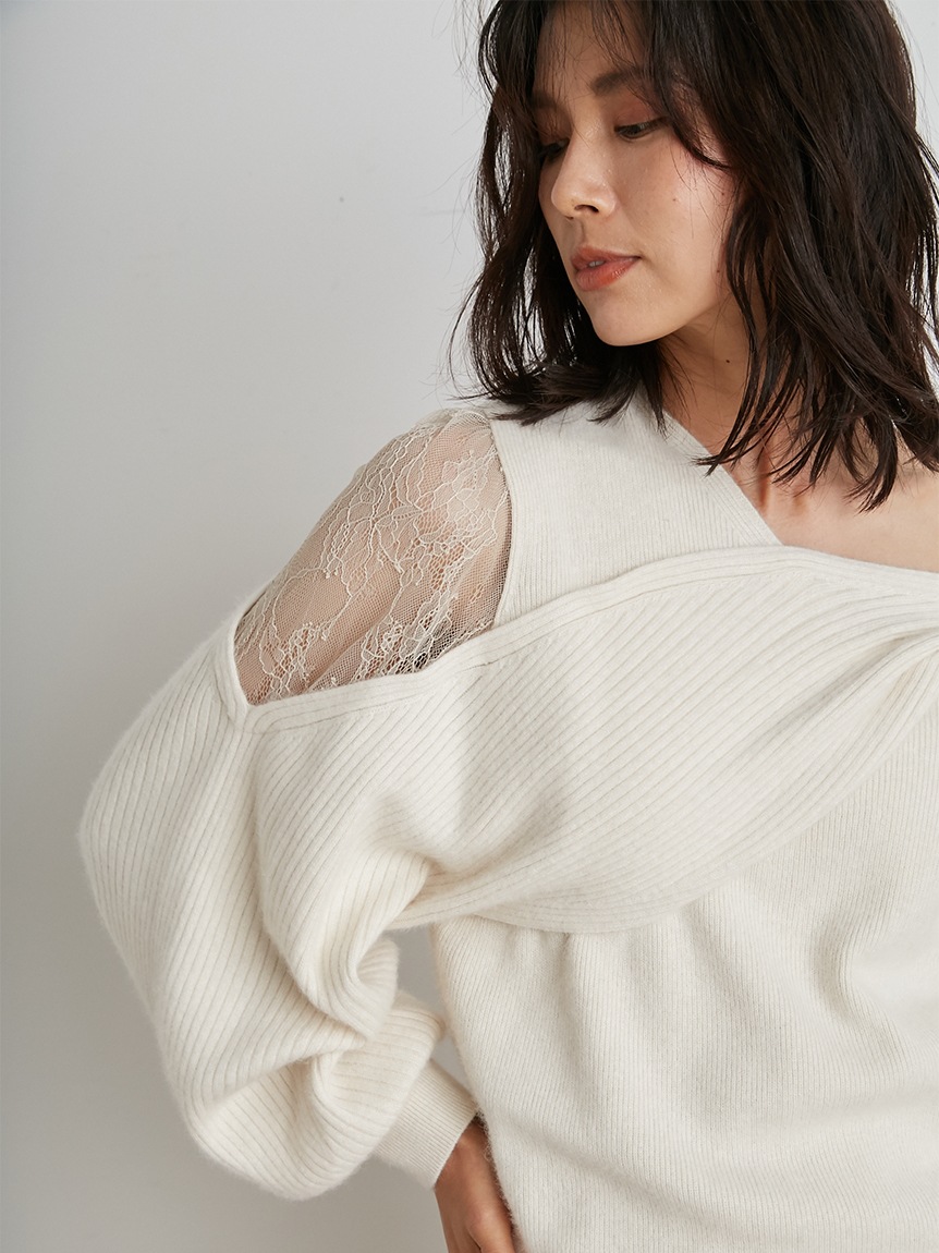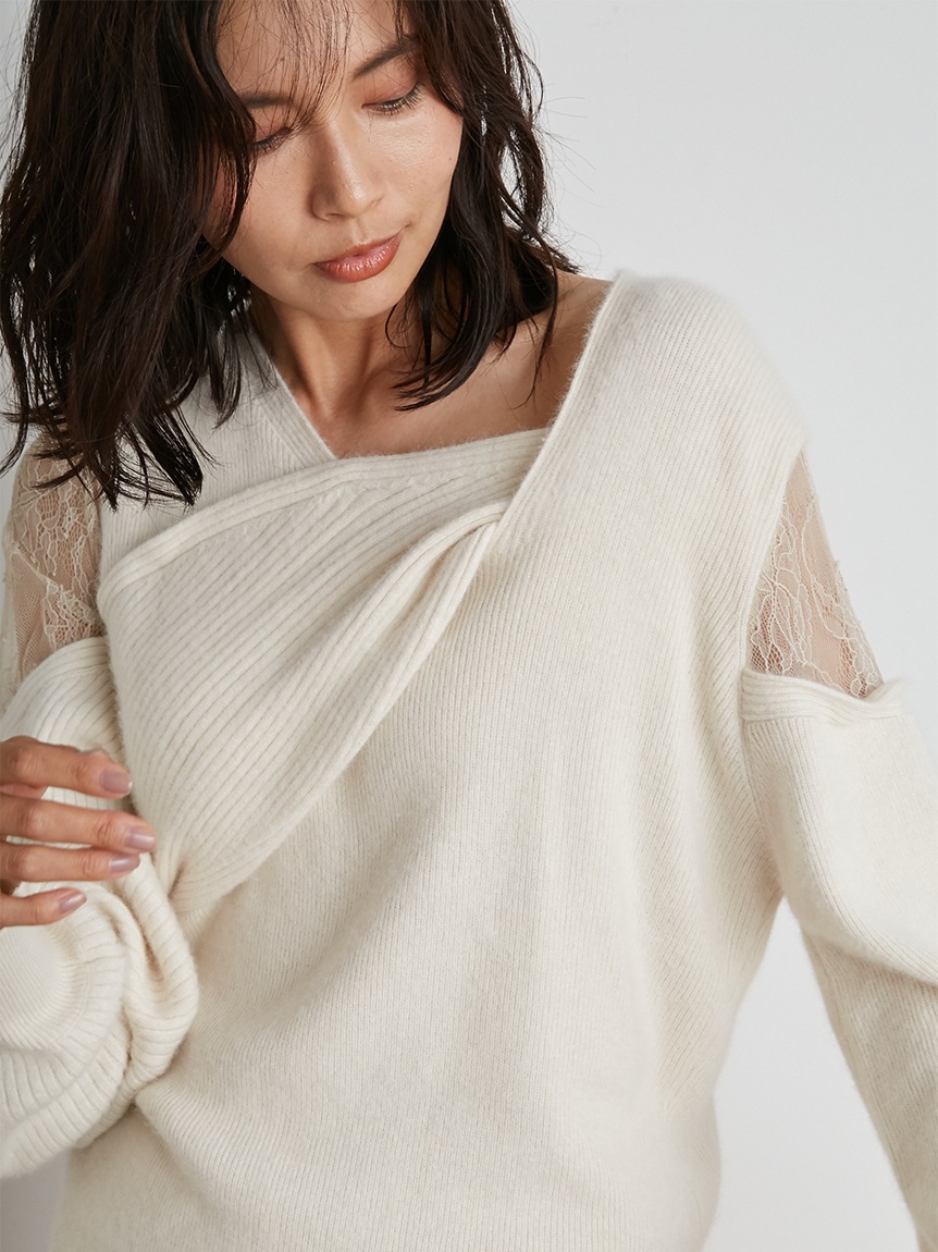 【程良い肌魅せとアシンメトリーでメリハリを効かせたレースドッキングデザインニット】