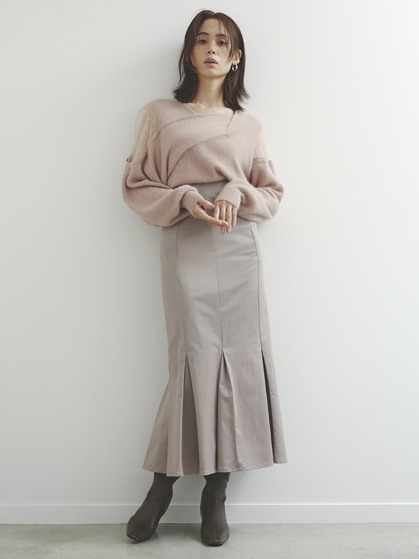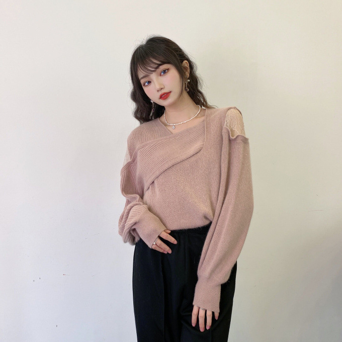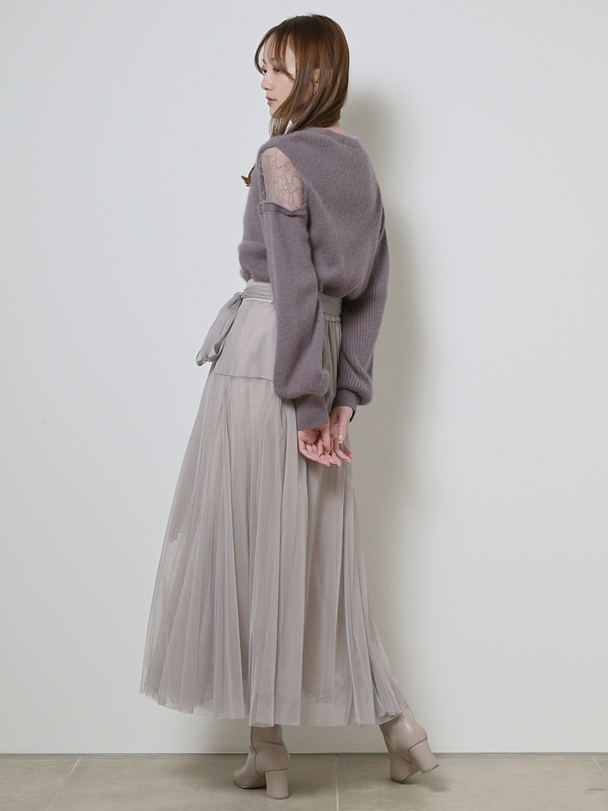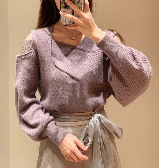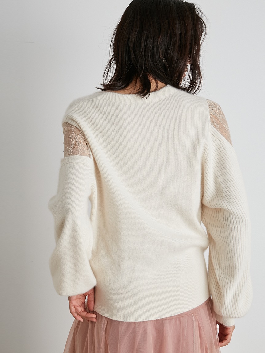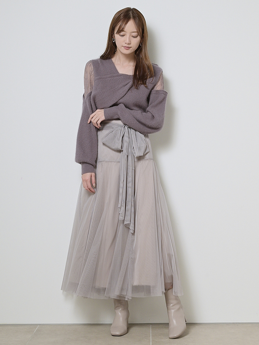 【程良い肌魅せとアシンメトリーでメリハリを効かせたレースドッキングデザインニット】