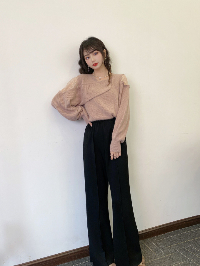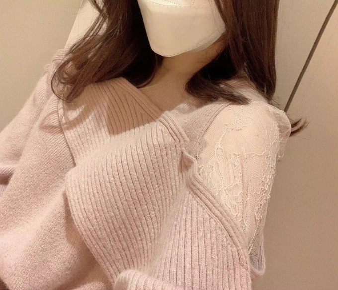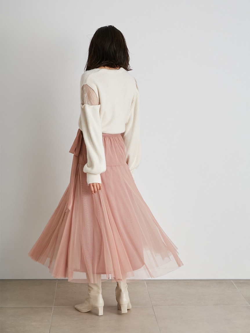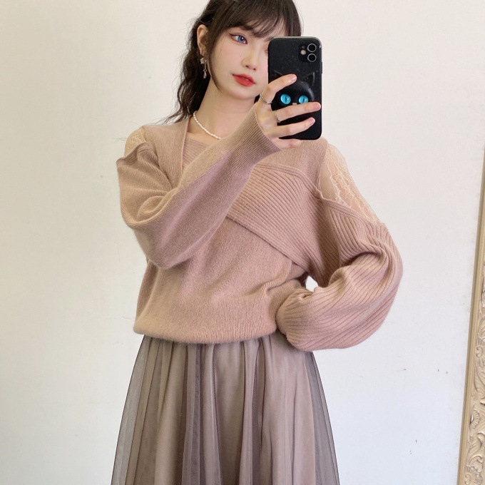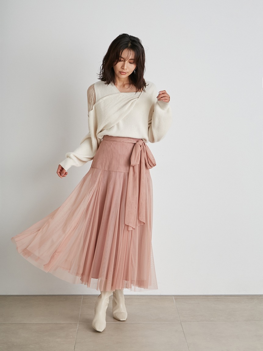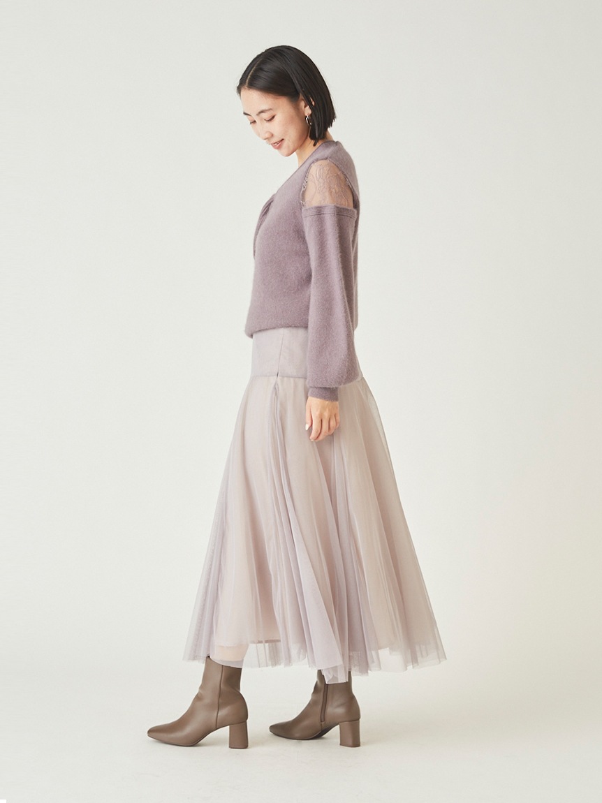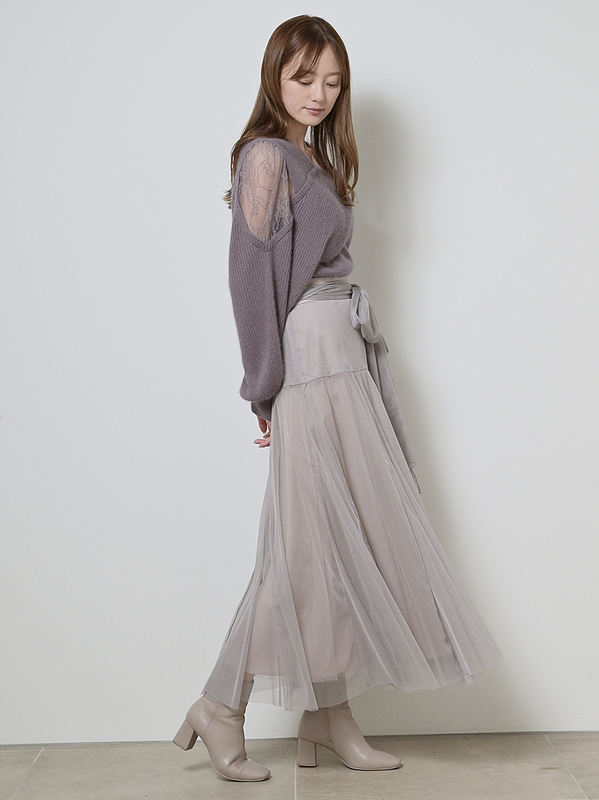 【程良い肌魅せとアシンメトリーでメリハリを効かせたレースドッキングデザインニット】