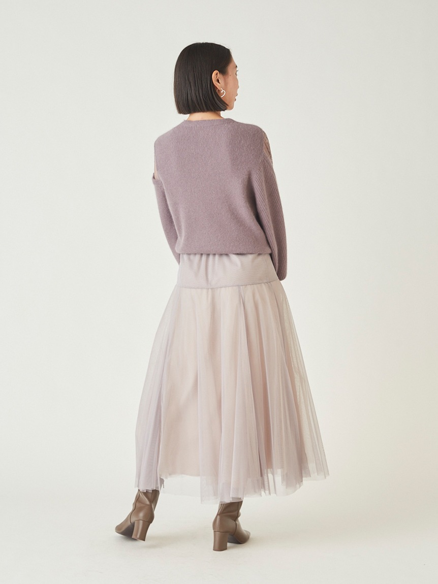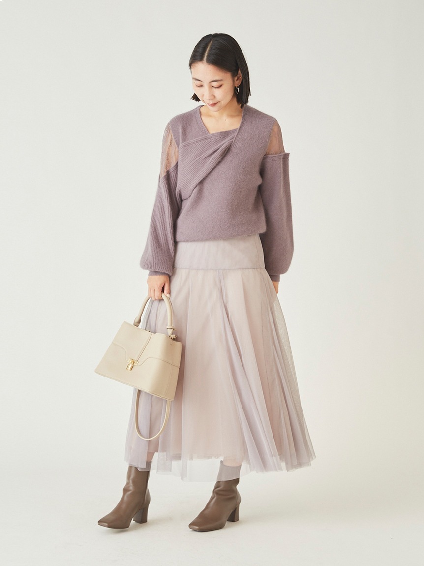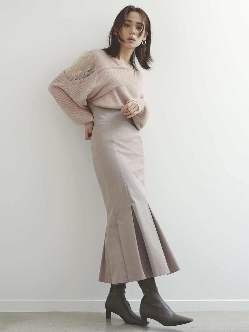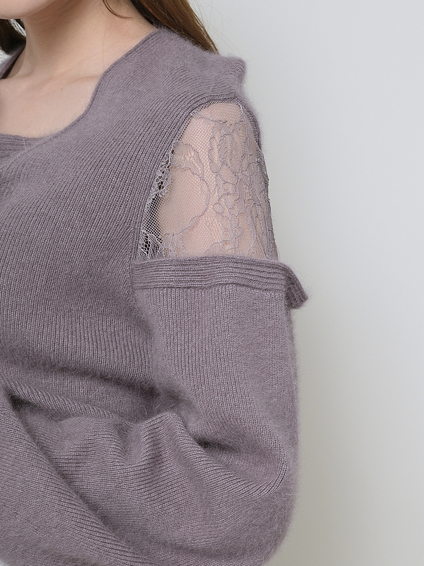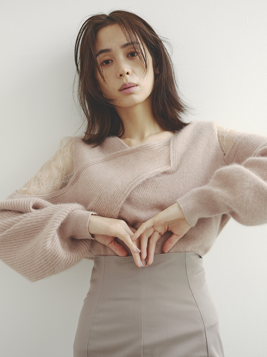 ヘルシーな肌魅せとアシンメトリーデザインで、甘さとモードをミックスしたニットプルオーバー。左袖から左肩へと続くリブを太くし変化をつけることで、メリハリのあるデザインにしました。台形のネックラインは、鎖骨が見える絶妙な開き具合で顔回りをすっきりとした印象に。切り替えた袖のレースが色香を纏い、重くなりがちなニットの引き算としても存在感を発揮します。