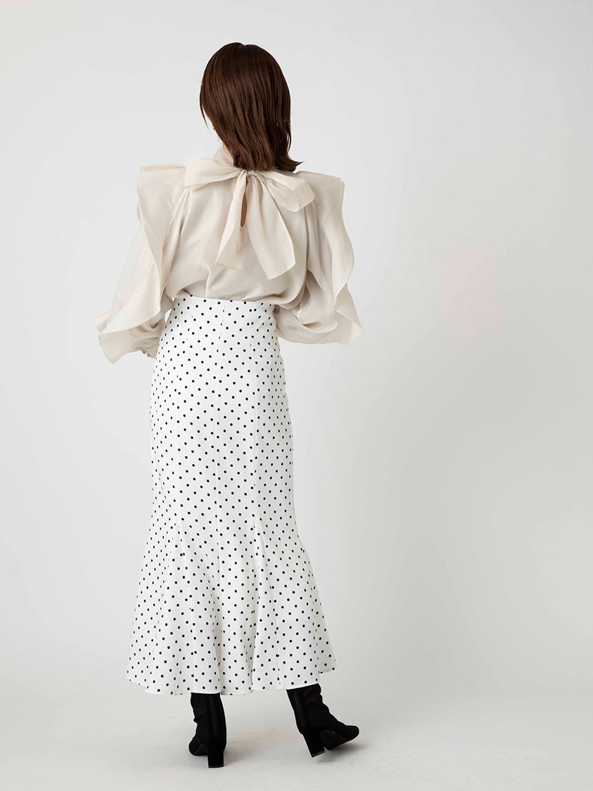 SNIDEL定番のオーガンシースルーブラウス。今シーズンはエレガントに広がるフリルがあしらわれたボリュームスリーブが印象的な、レディ度満点のブラウス。絶妙な透け感を持つオーガンジーを用いた、「SNIDEL」で毎回人気を集めるアイテムです。袖のカフス&スタンドカラーで全体を引き締めることで、ボリュームがありながらもすっきりとした印象に。バックネックには大きなリボンをあしらい、後ろ姿まで抜かりなく仕上げています。