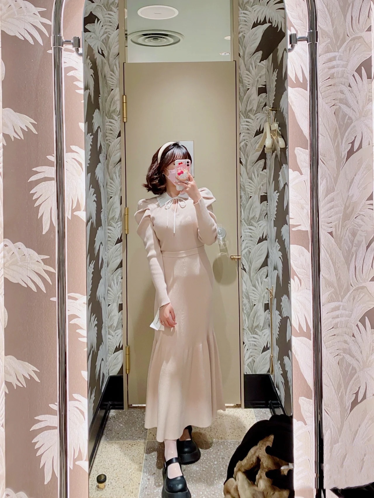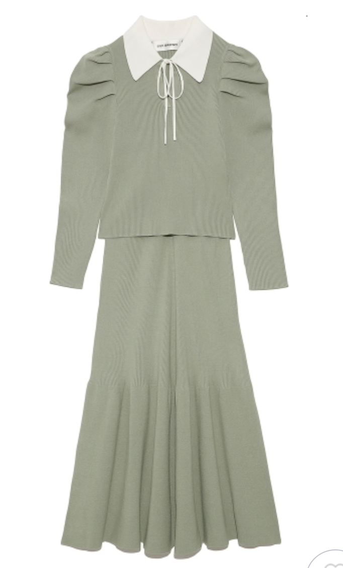 今シーズンマストなマーメイドシルエットが、スタイルアップを叶えてくれるニットアップ。ボディには着心地の良いリブ地を使用。袖は立体的なパフスリーブにしたことで、華やかさを演出してくれます。配色の襟に、とも糸の細リボンが女性らしさを引き立たせてくれます。