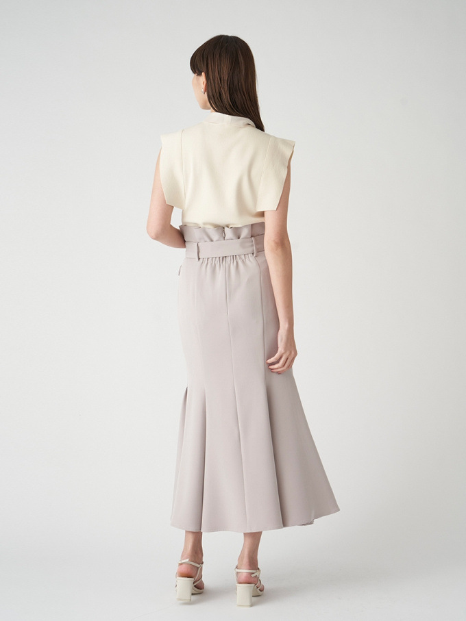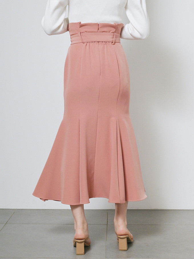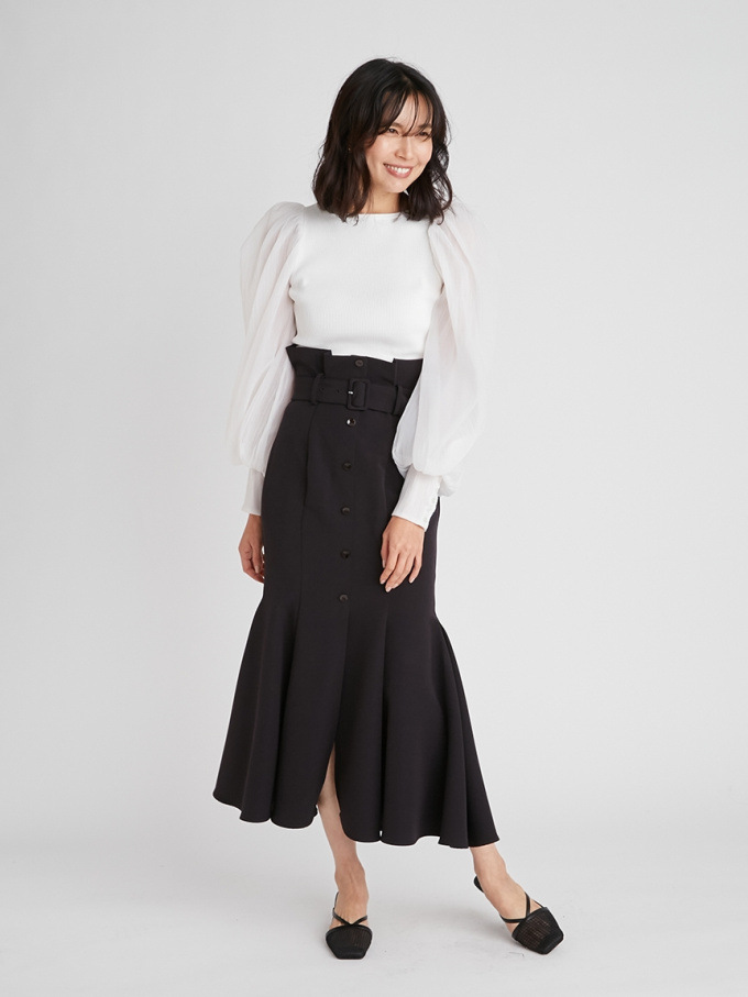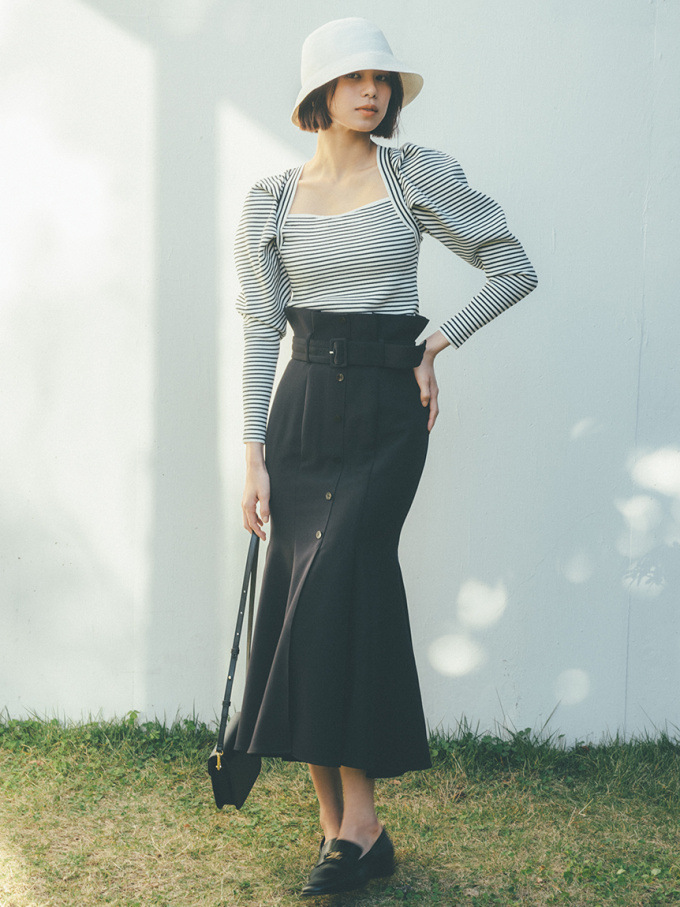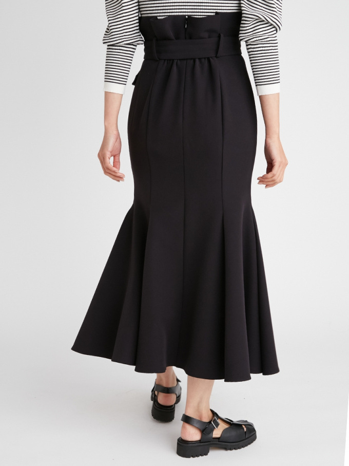 女性らしいラインを綺麗に魅せる美しいマーメイドシルエットが印象的なスカート。フロントにあしらわれたボタンが縦のラインを強調し、スタイルアップ効果をさらに高めてくれます。付属のベルトでマークしたハイウエストデザインはトレンド感◎。後ろファスナーを備えているので簡単に着脱でき、穿き心地も快適です。