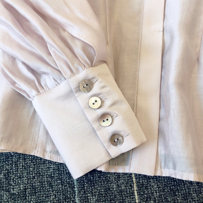 カラーごとに異なる素材でバリエーション豊かに仕上げました。着まわしやすいシャツ地を使用したホワイト、トレンドのストライプ、シアー素材でフェミニンな色合いのライトピンクの3色展開です。