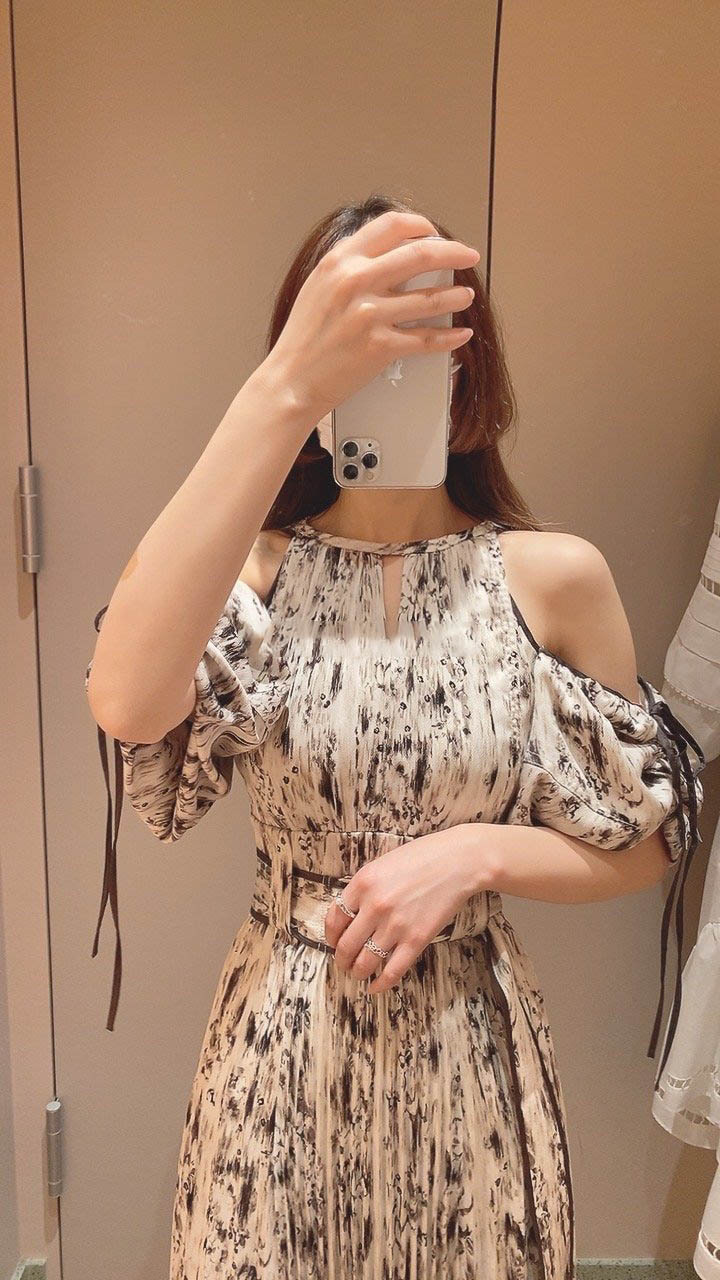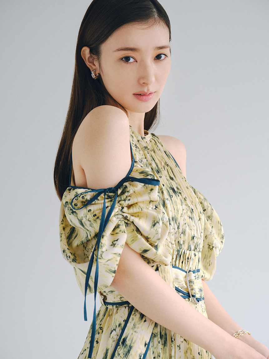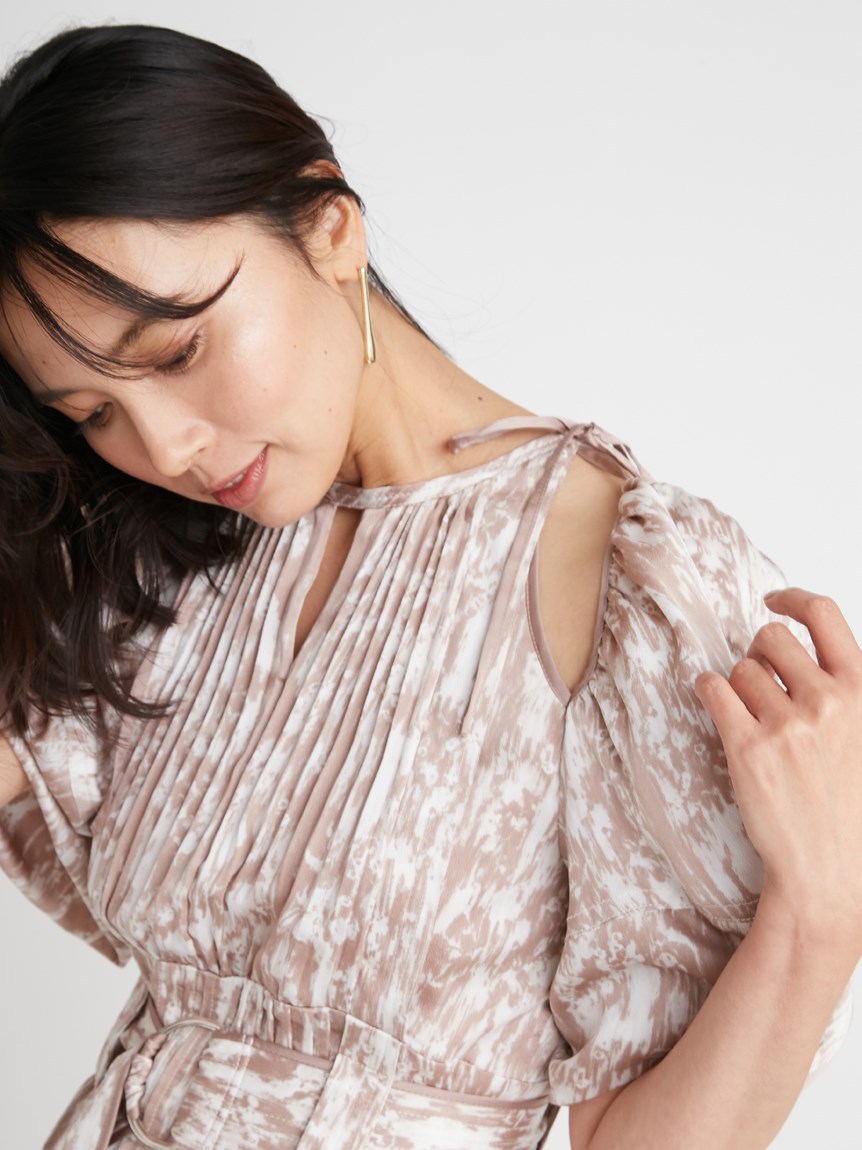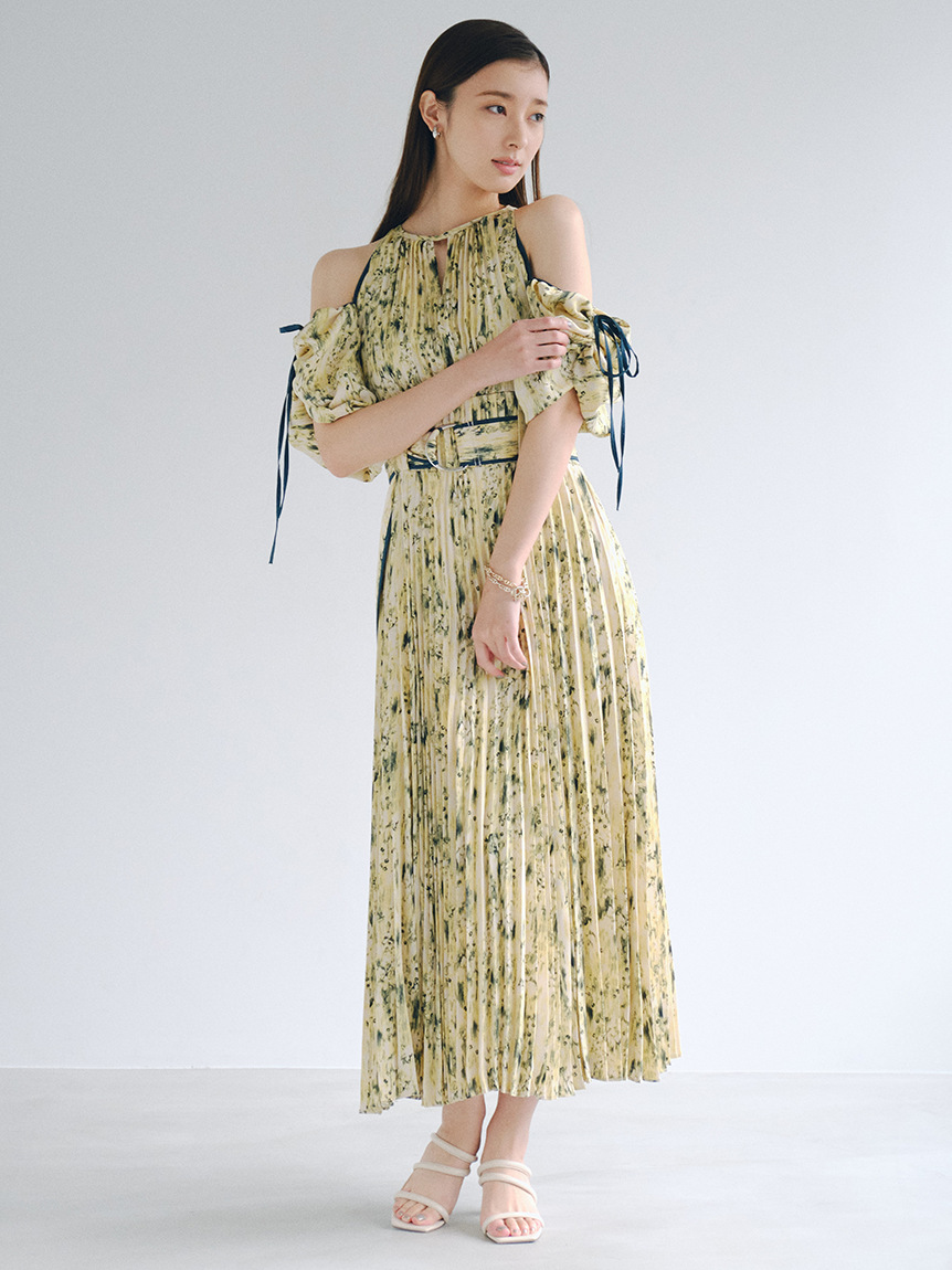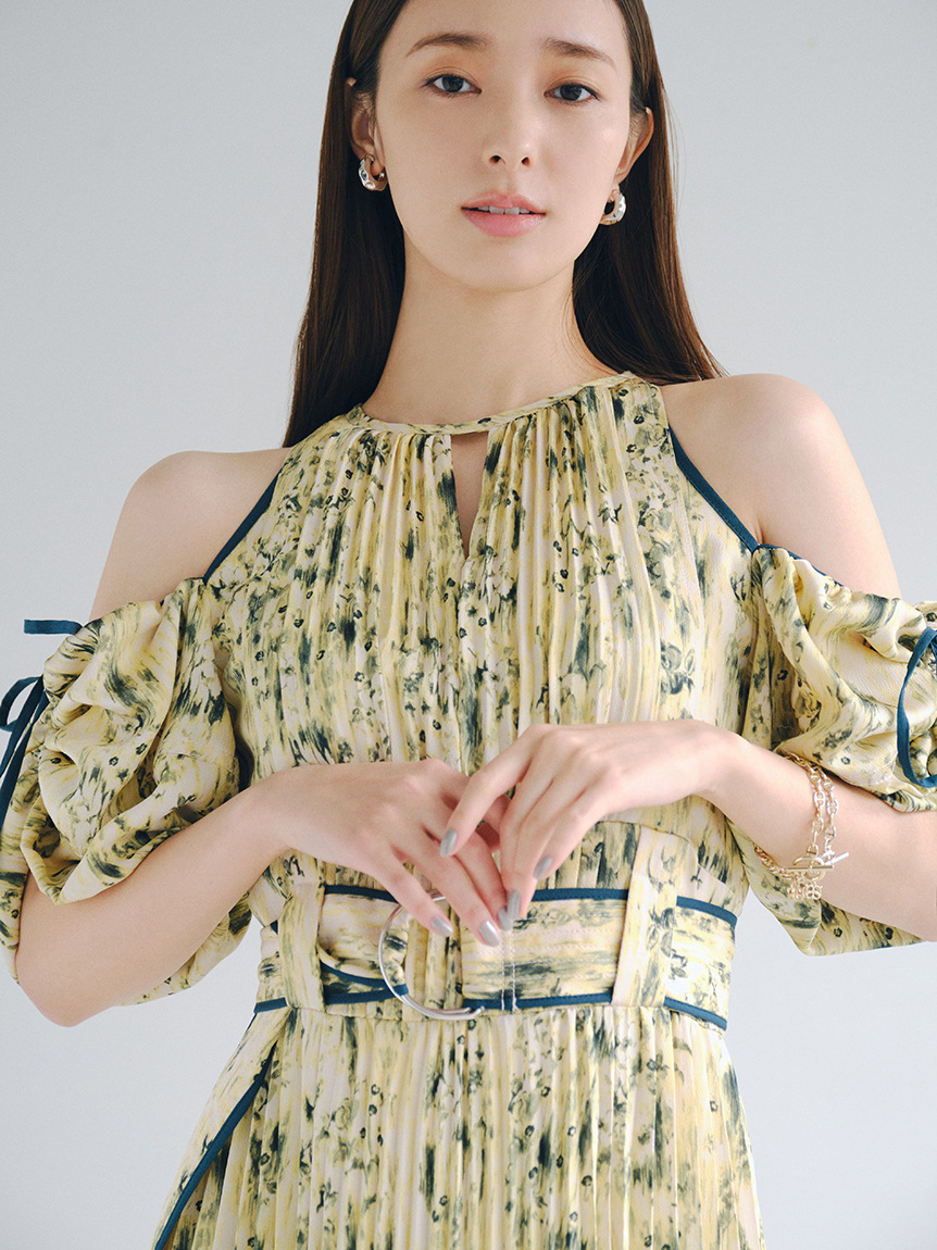 一面に存在感のある抽象フラワー柄をプリントした、春らしく華やかな雰囲気のワンピース。全体に細やかなプリーツを畳むことでエレガントなルックスに仕上げました。袖の紐を外せばさり気ない肩見せからオフショルにアレンジできる便利な2WAYデザイン。ハイウエストの位置でベルトをマークしたメリハリのあるシルエットは脚長効果があり、スタイルアップを存分に期待できます。