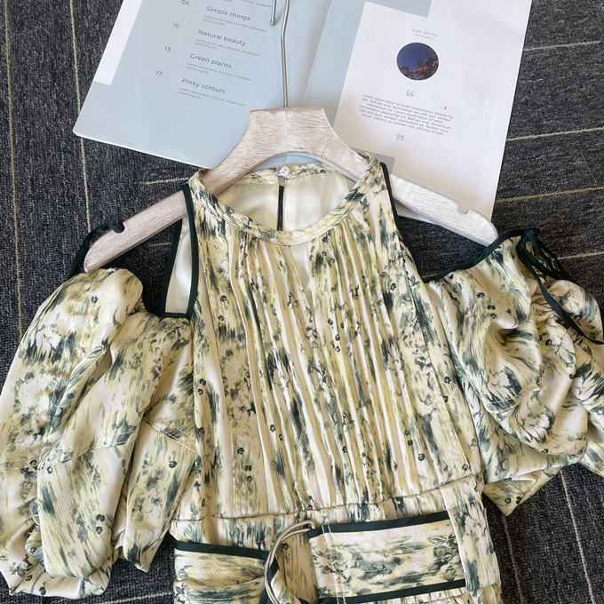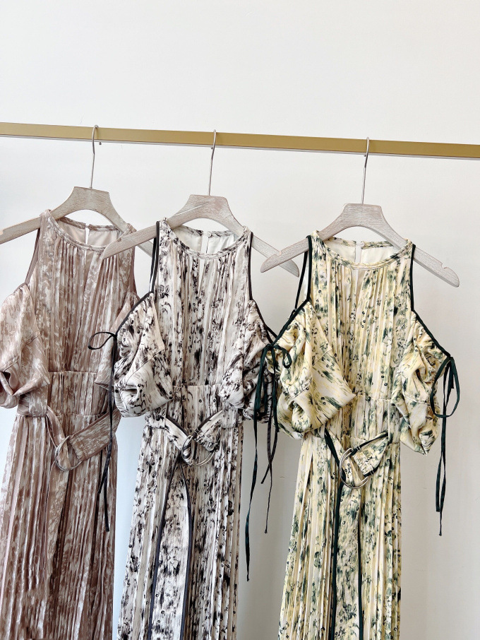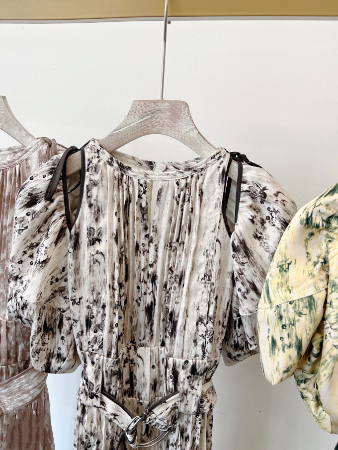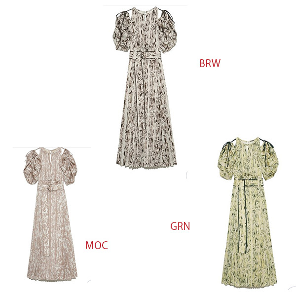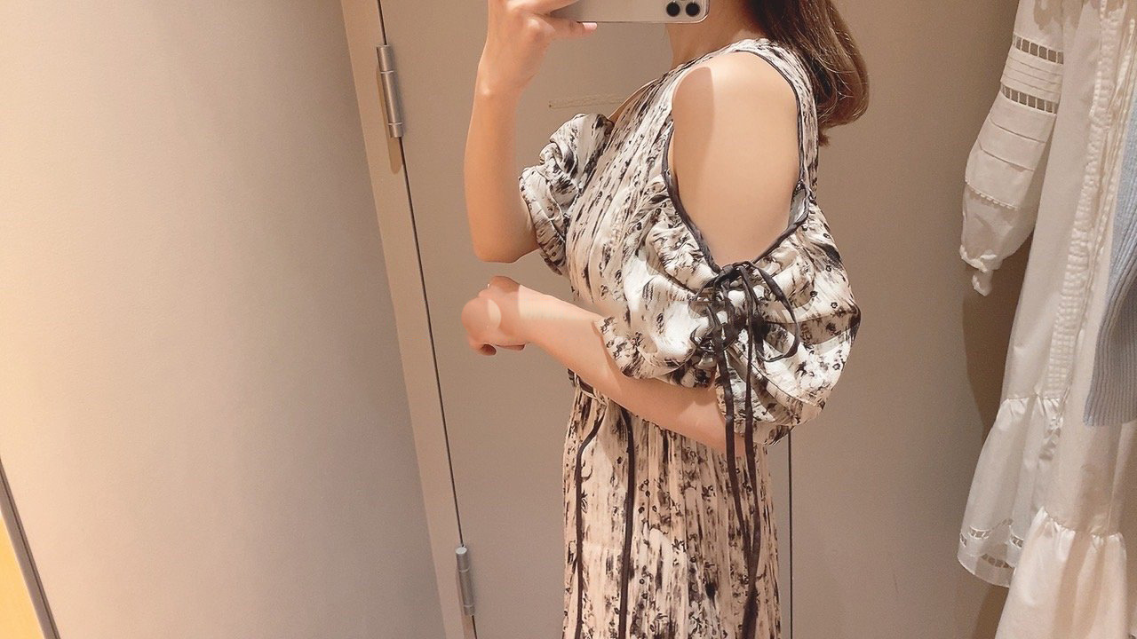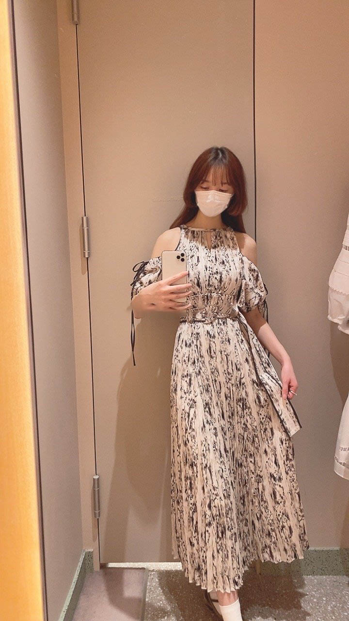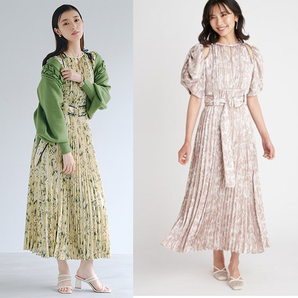 一面に存在感のある抽象フラワー柄をプリントした、春らしく華やかな雰囲気のワンピース。全体に細やかなプリーツを畳むことでエレガントなルックスに仕上げました。袖の紐を外せばさり気ない肩見せからオフショルにアレンジできる便利な2WAYデザイン。ハイウエストの位置でベルトをマークしたメリハリのあるシルエットは脚長効果があり、スタイルアップを存分に期待できます。