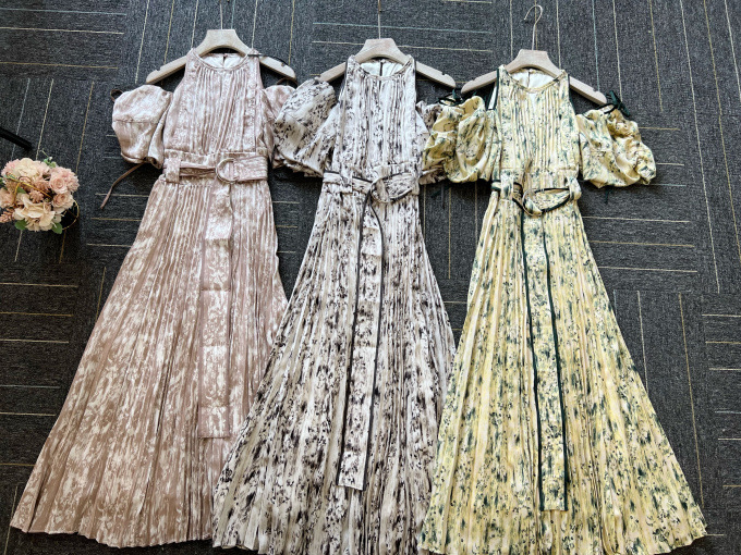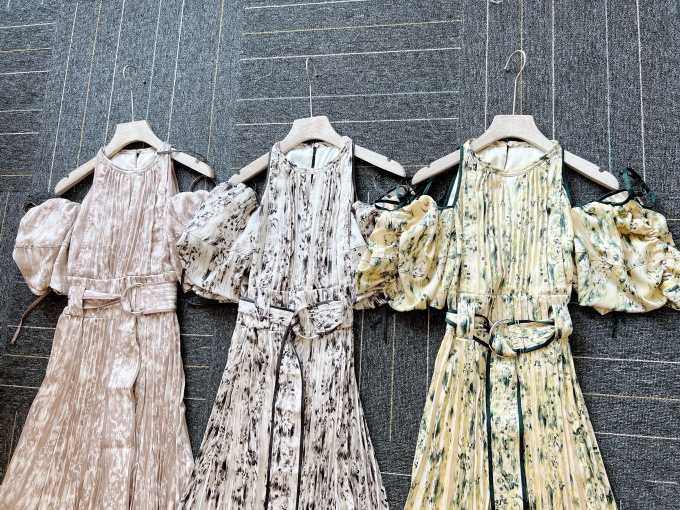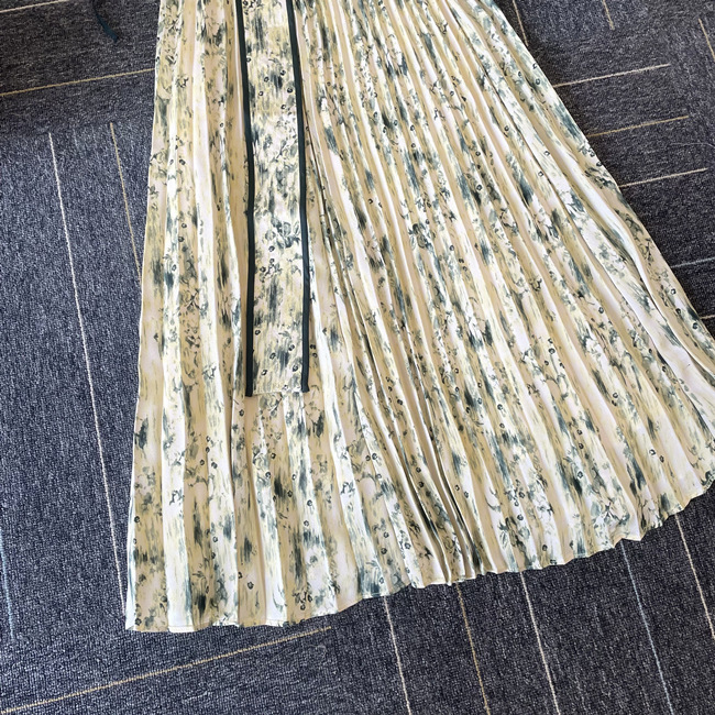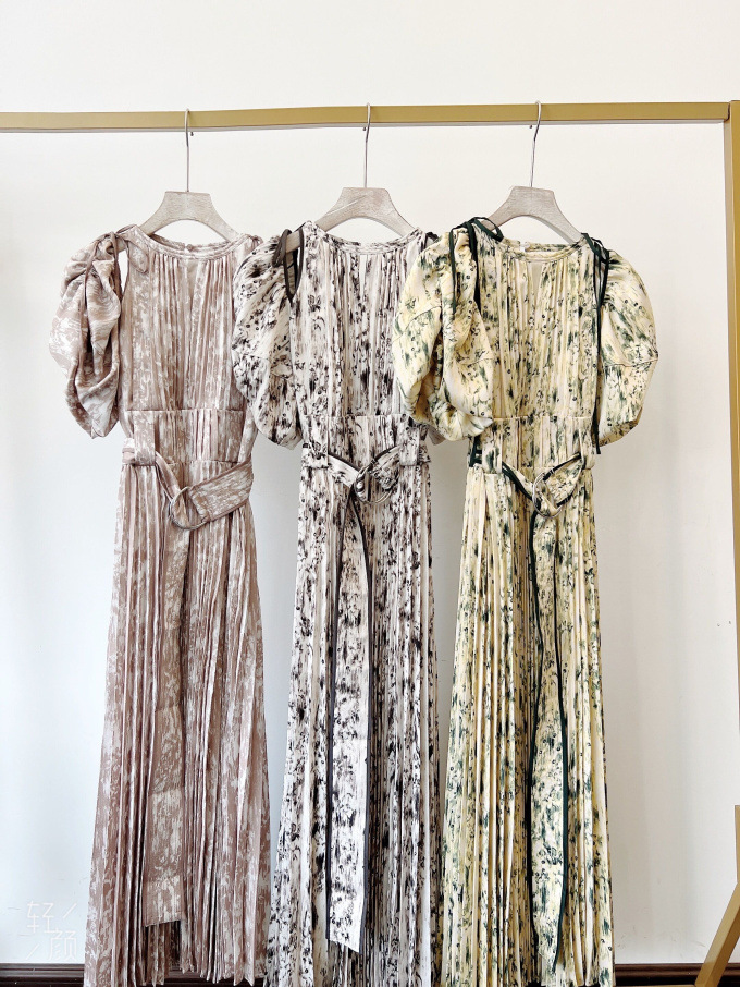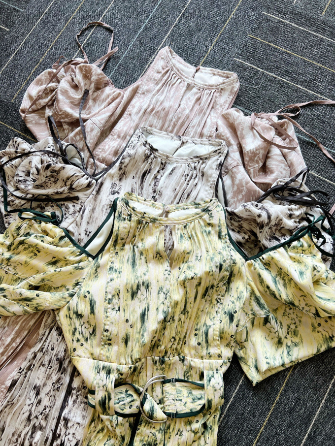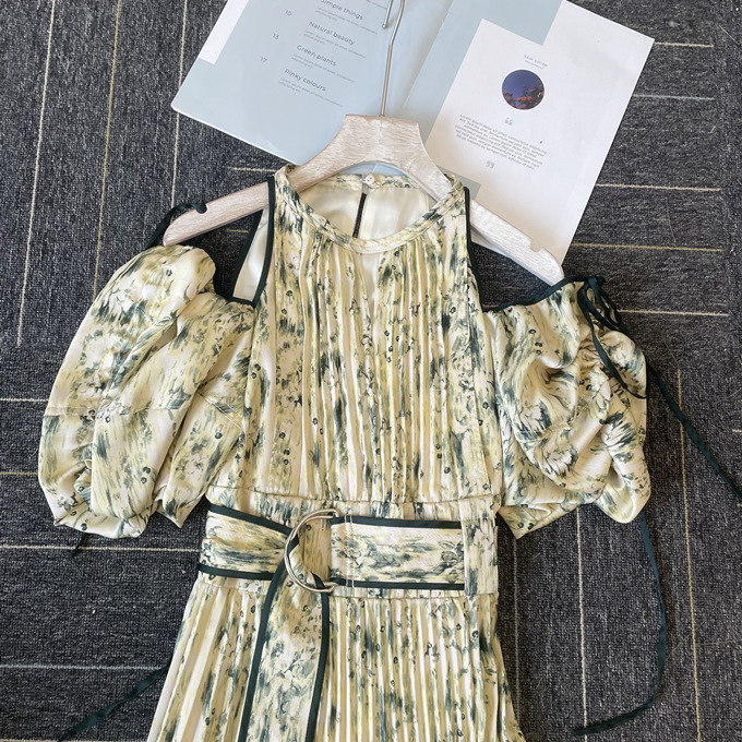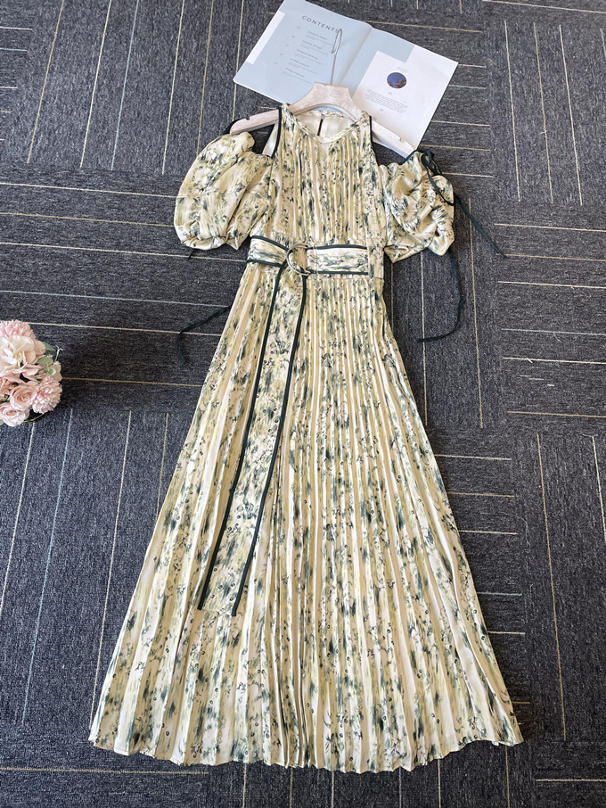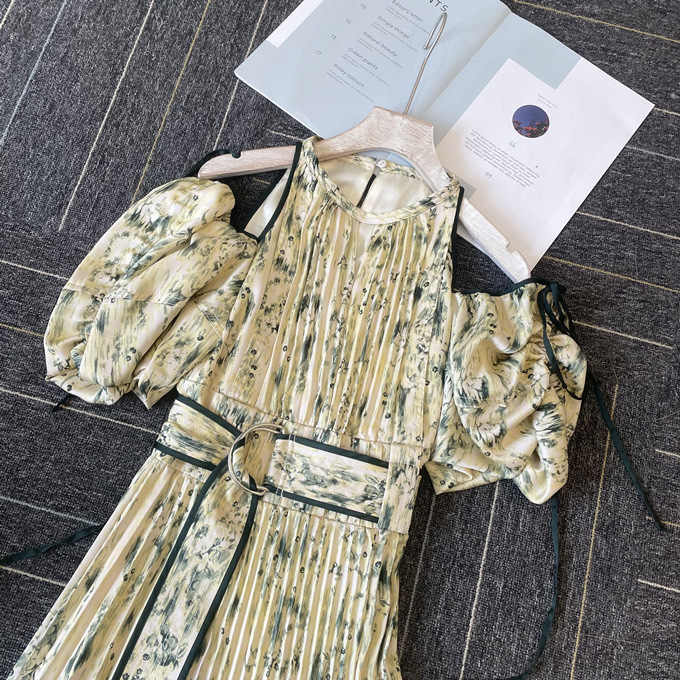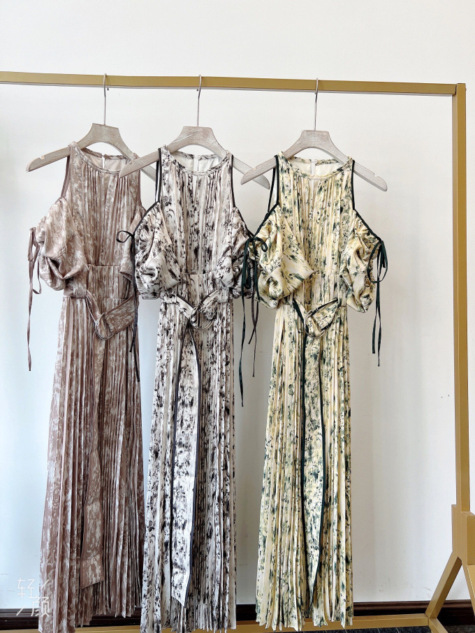 一面に存在感のある抽象フラワー柄をプリントした、春らしく華やかな雰囲気のワンピース。全体に細やかなプリーツを畳むことでエレガントなルックスに仕上げました。袖の紐を外せばさり気ない肩見せからオフショルにアレンジできる便利な2WAYデザイン。ハイウエストの位置でベルトをマークしたメリハリのあるシルエットは脚長効果があり、スタイルアップを存分に期待できます。