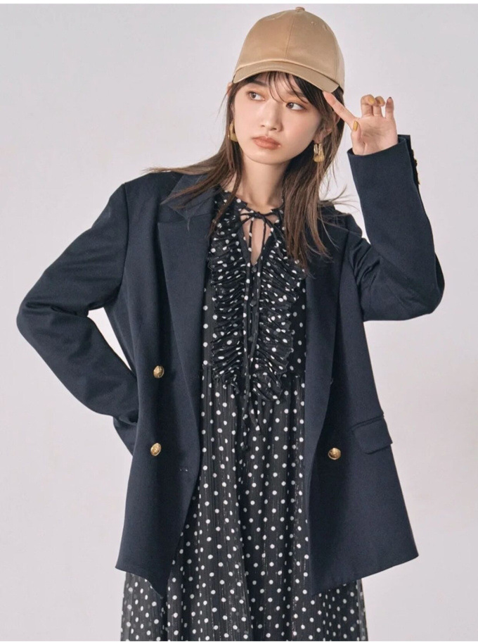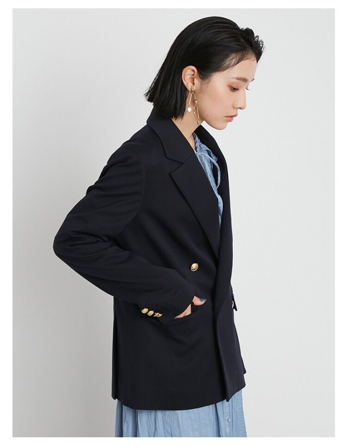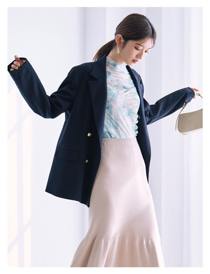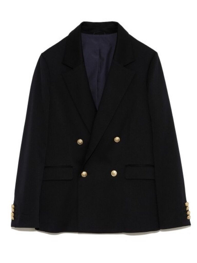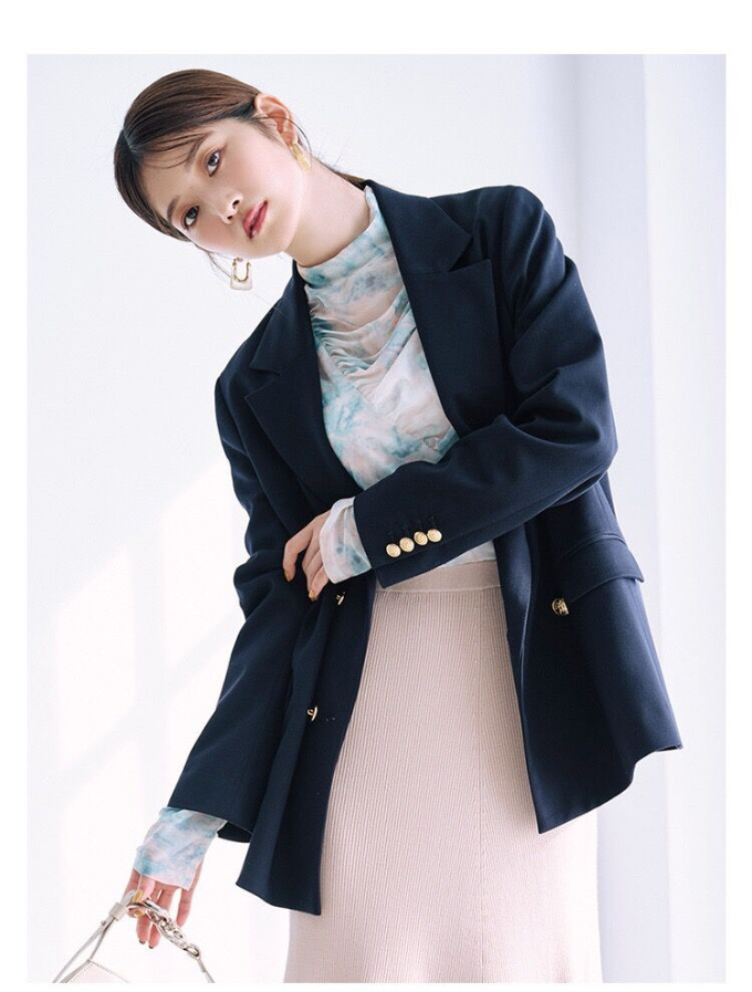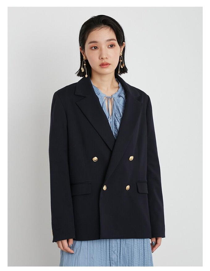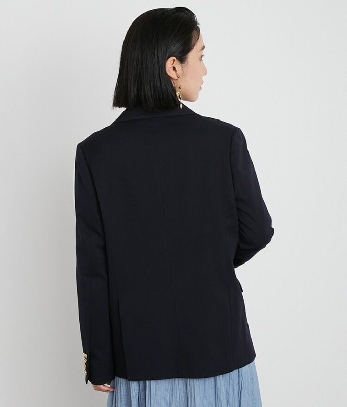 王道クラシカルなルックスがスタイリングの鮮度を高めるダブルブレストのジャケット。コーディネートしやすくスタンダードなシルエットが魅力。ベージュとピンクは水牛調ボタンをあしらい、ネイビーにはクラシカルな金ボタンをあしらいました。パンツともスカートとも相性が良く、女性らしい軽やかなワンピースと合わせていただくと、少しマニッシュな要素が加わって素敵です。¥