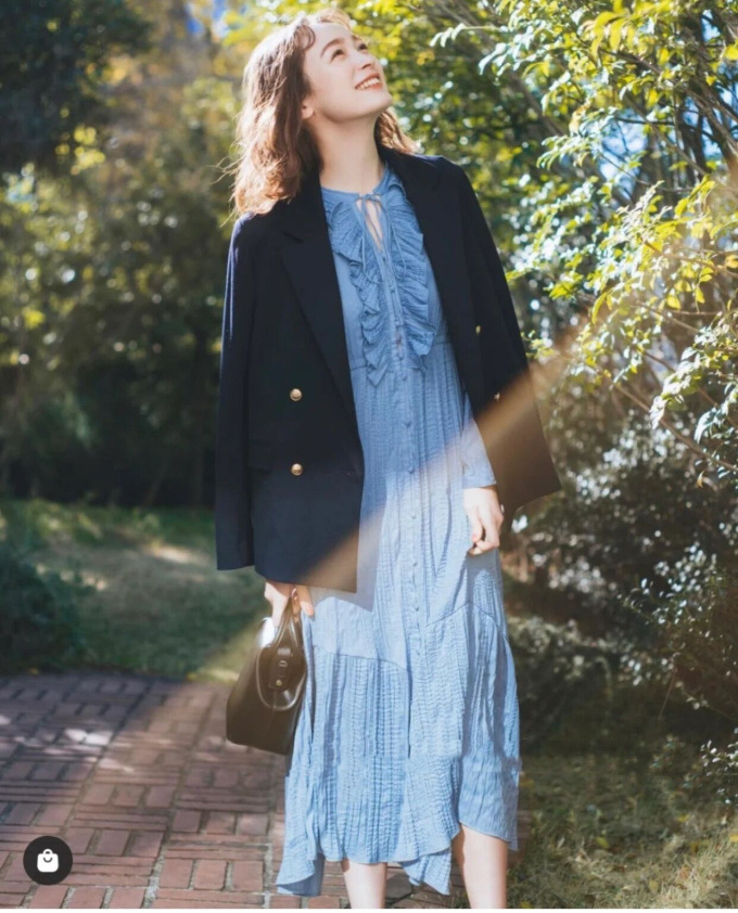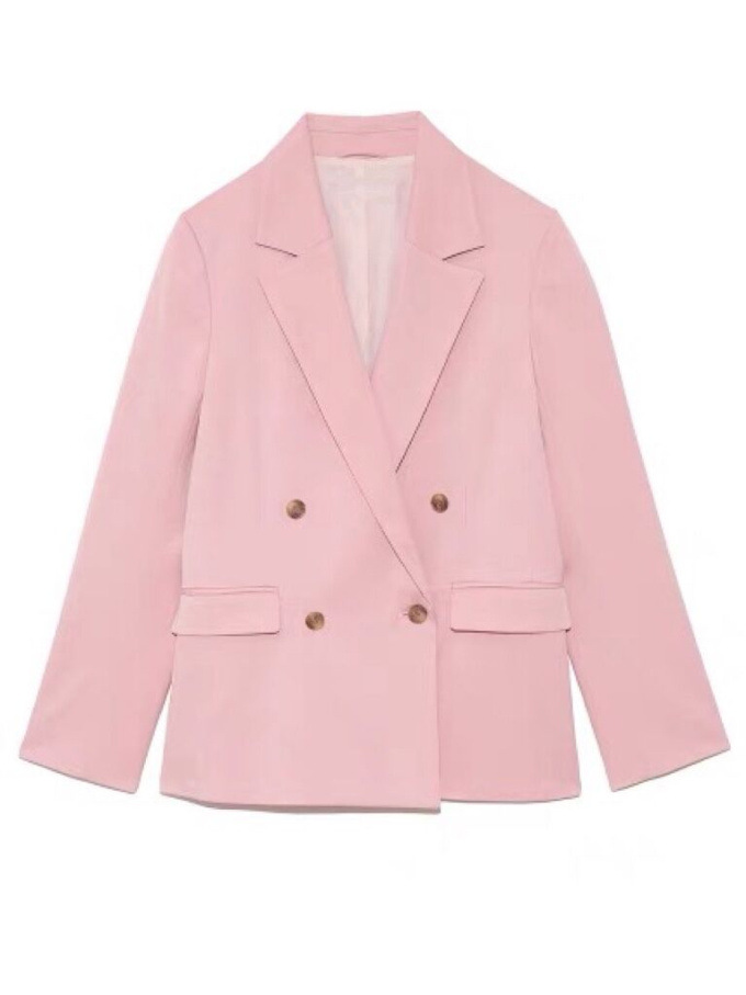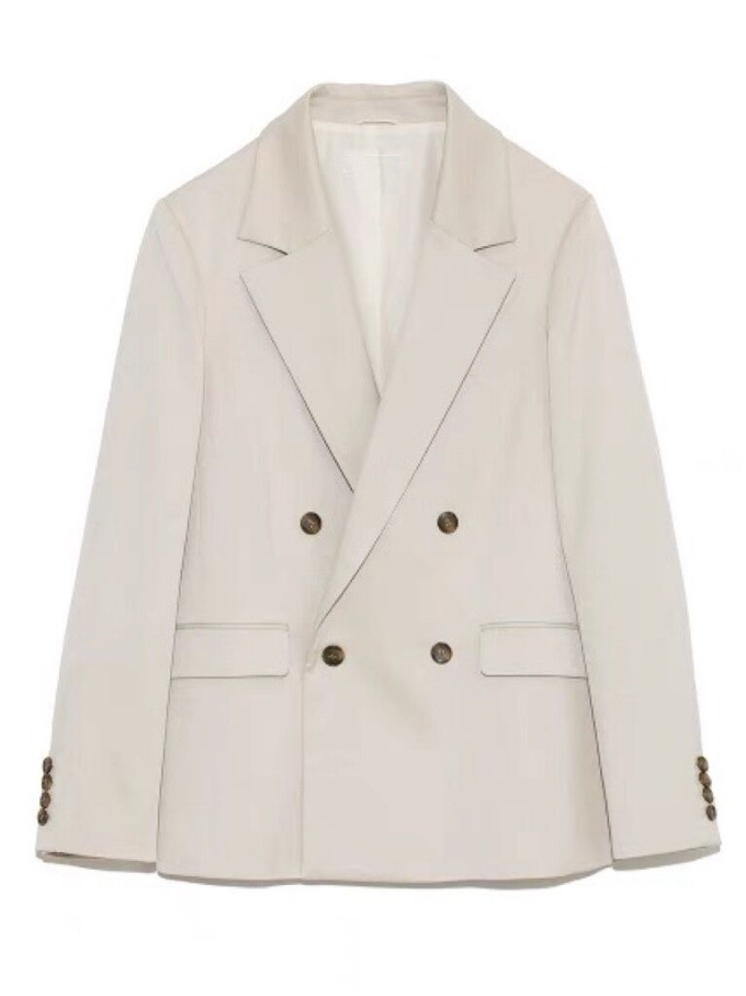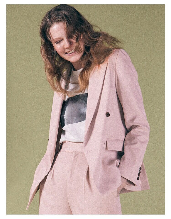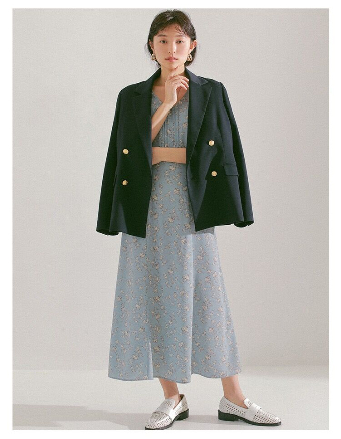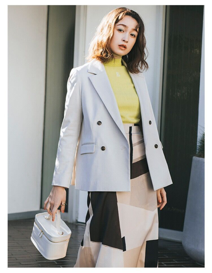 王道クラシカルなルックスがスタイリングの鮮度を高めるダブルブレストのジャケット。コーディネートしやすくスタンダードなシルエットが魅力。ベージュとピンクは水牛調ボタンをあしらい、ネイビーにはクラシカルな金ボタンをあしらいました。パンツともスカートとも相性が良く、女性らしい軽やかなワンピースと合わせていただくと、少しマニッシュな要素が加わって素敵です。¥