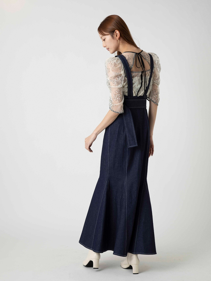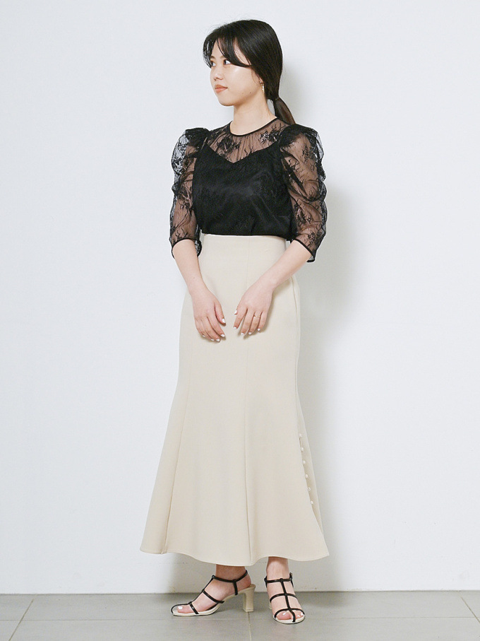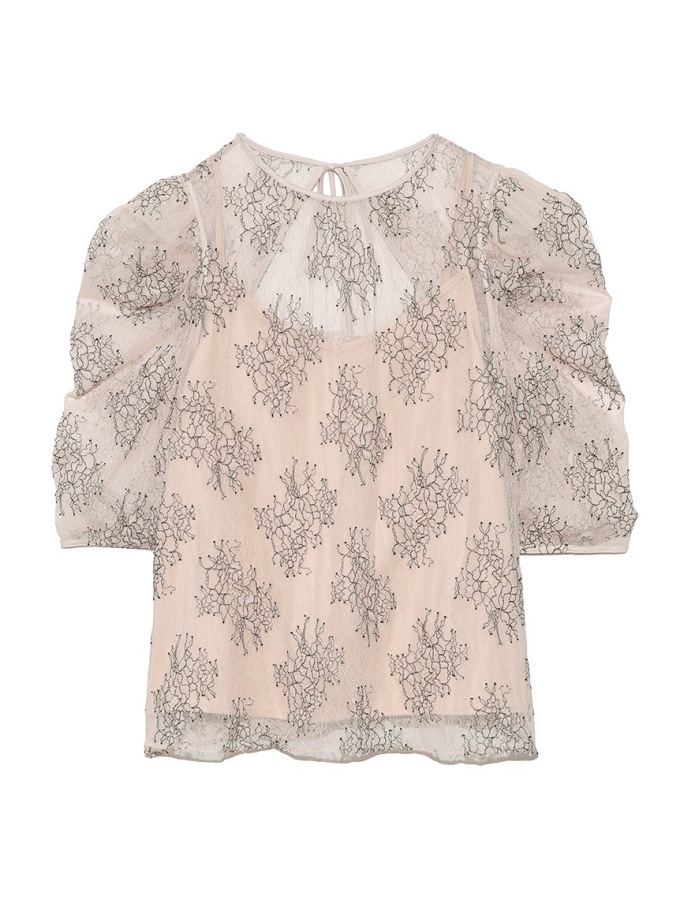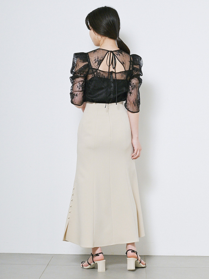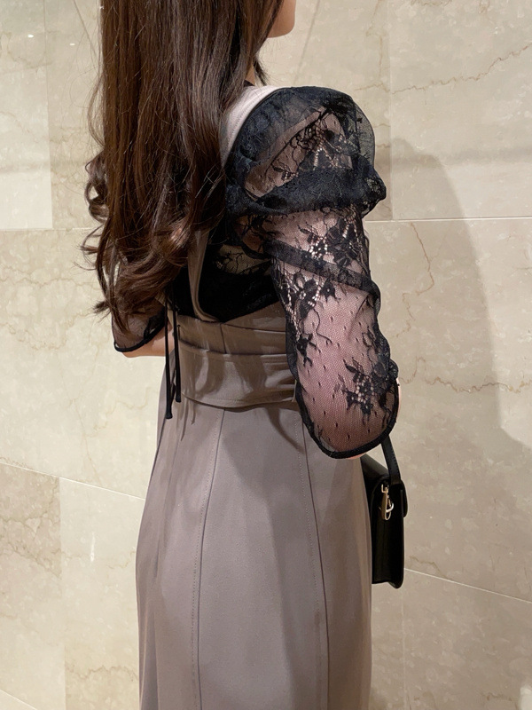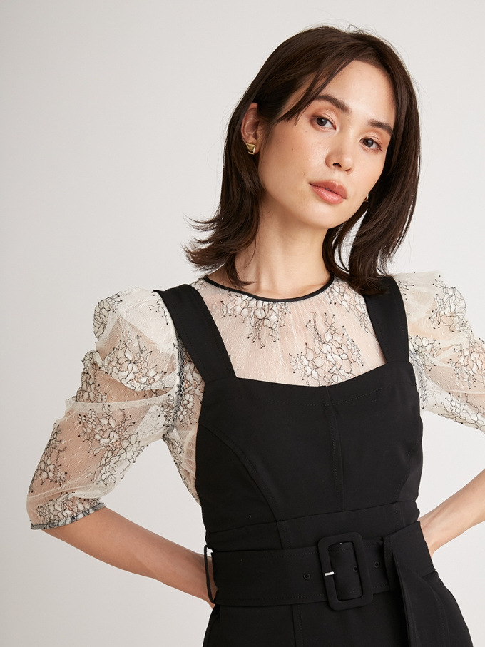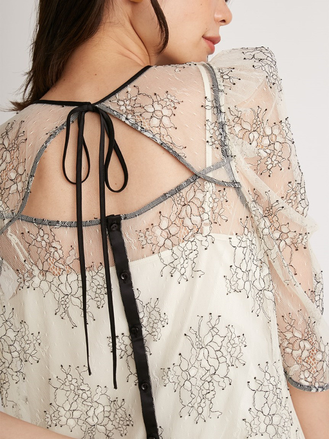 シアーで繊細なレース素材を使用した、センシュアルな雰囲気のブラウス。袖はタックとギャザーを入れ、尖がっているようなトレンド感のあるパフスリーブに仕上げました。バックネックには大胆なカッティングを施し、大人レディな表情を演出。1枚で着るのはもちろん、レイヤードスタイルのインに重ねてちらりと覗かせれば今年らしさがぐっと高まります。