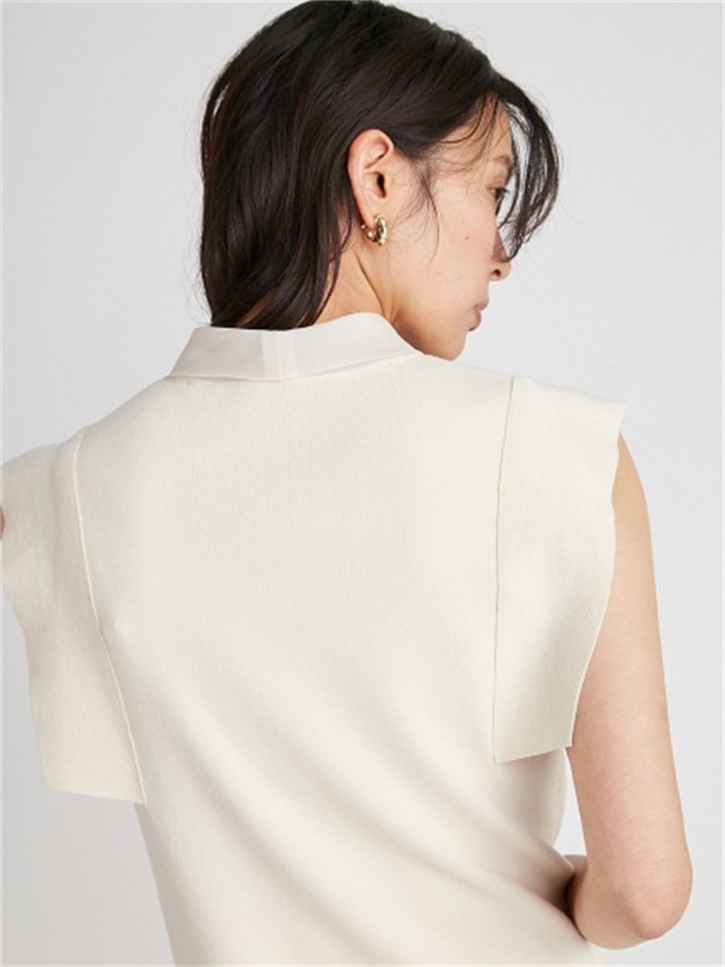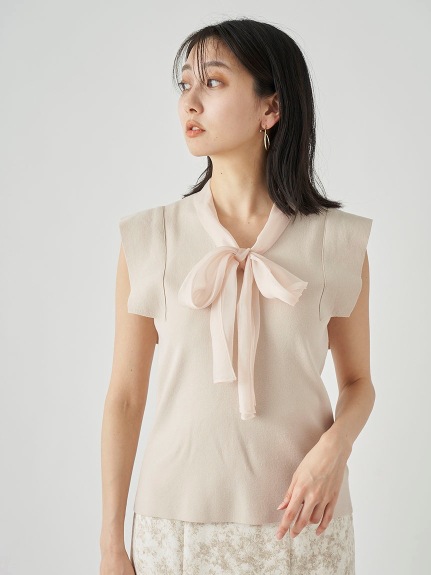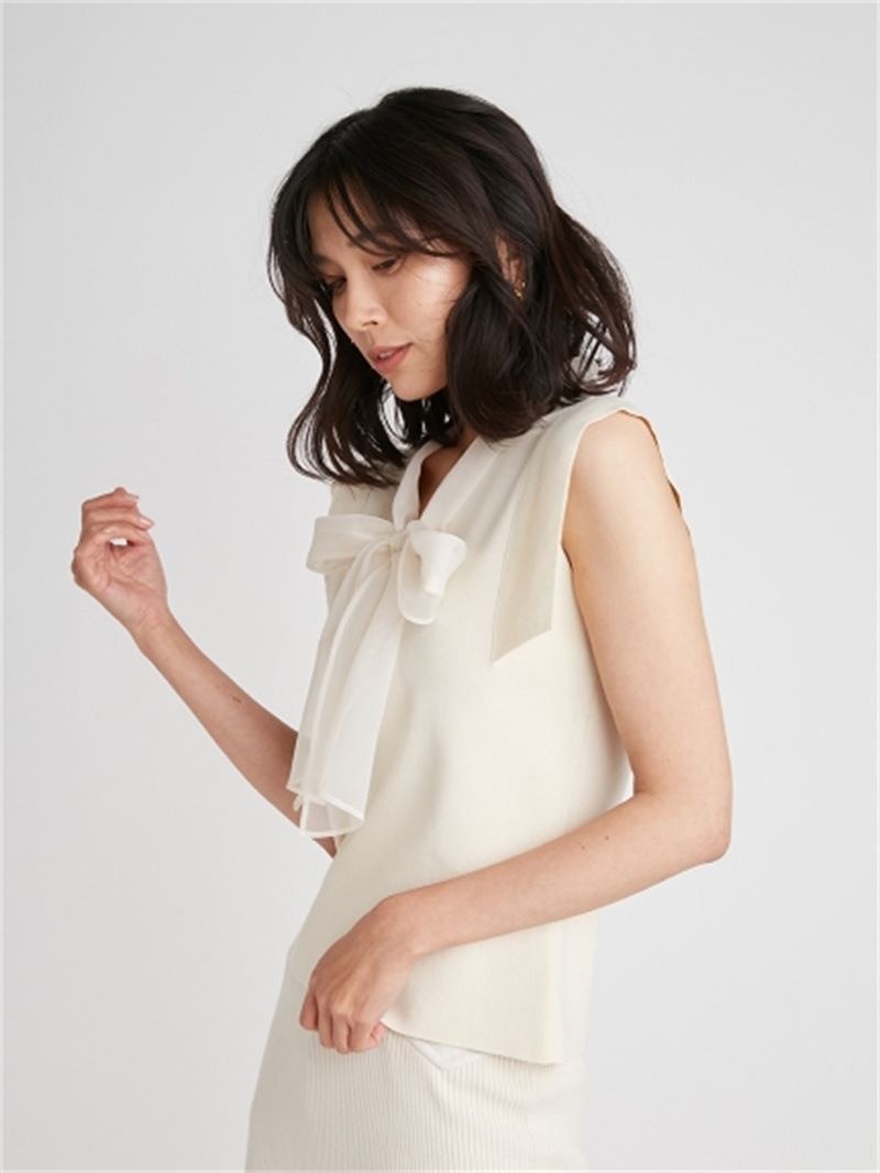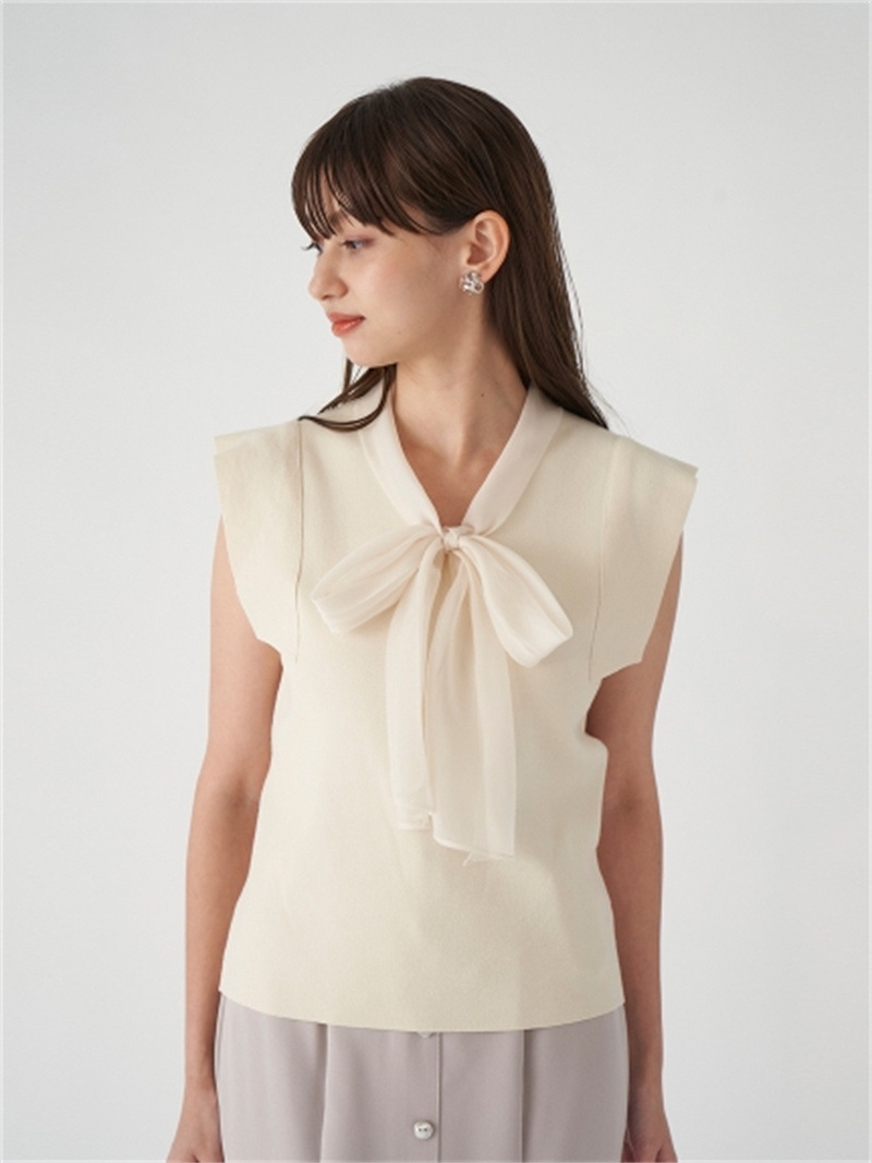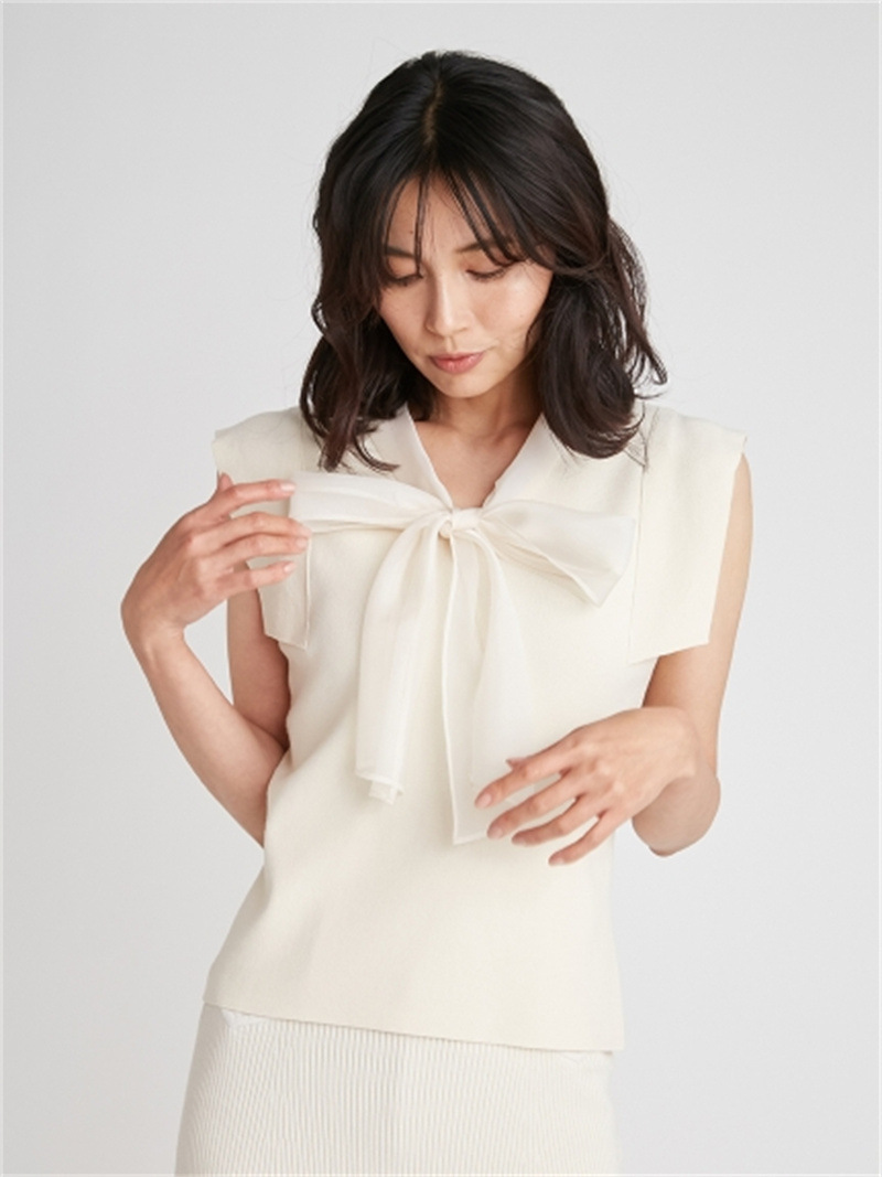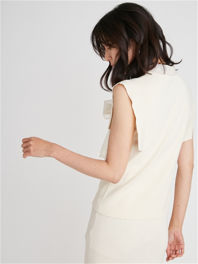 品の良い総針ニットに、シアーなオーガンジーの襟をドッキングし表情豊かに仕上げたプルオーバー。胸元で結んだボウタイリボンやフリリーなスリーブで、女性らしくエレガントなルックスにまとめています。ボディラインに優しく沿うすっきりとしたシルエットは様々なアイテムと好相性。タックインしてももたつかないので旬のハイウエストボトムともバランス良く決まります。