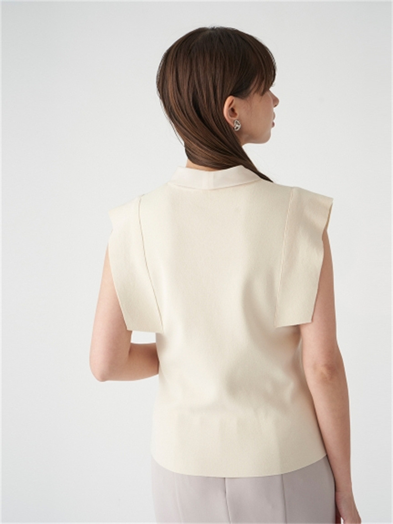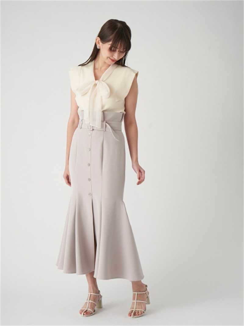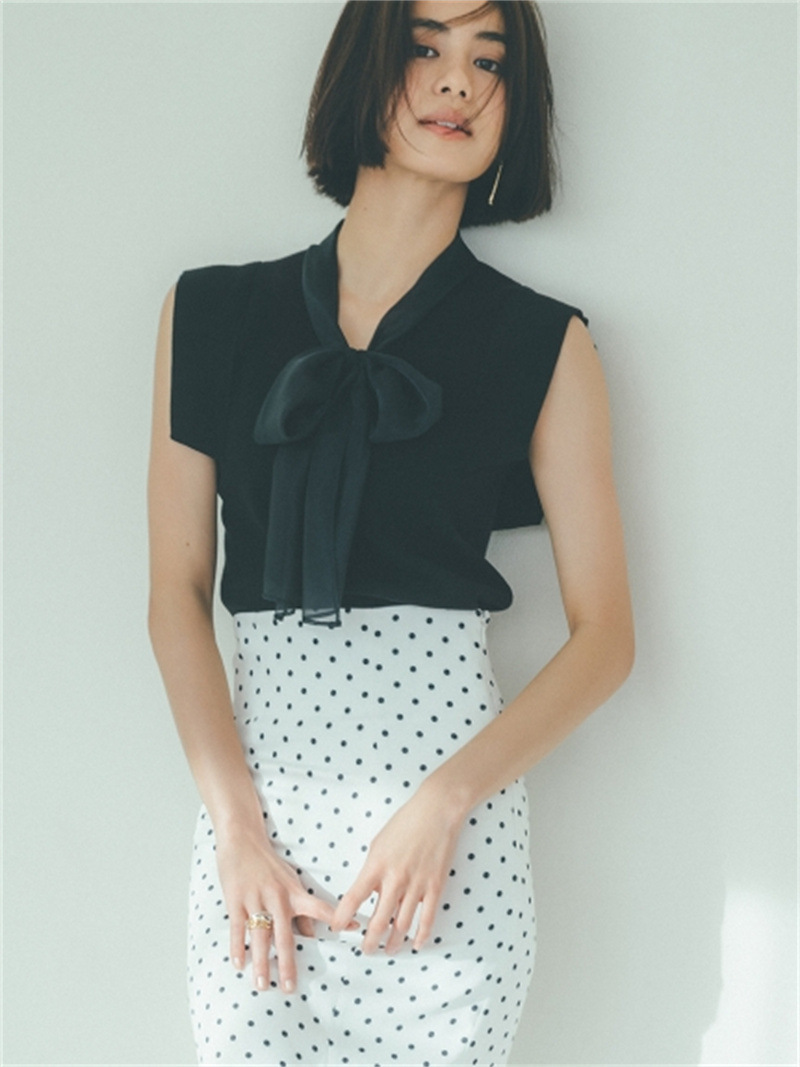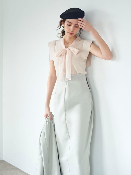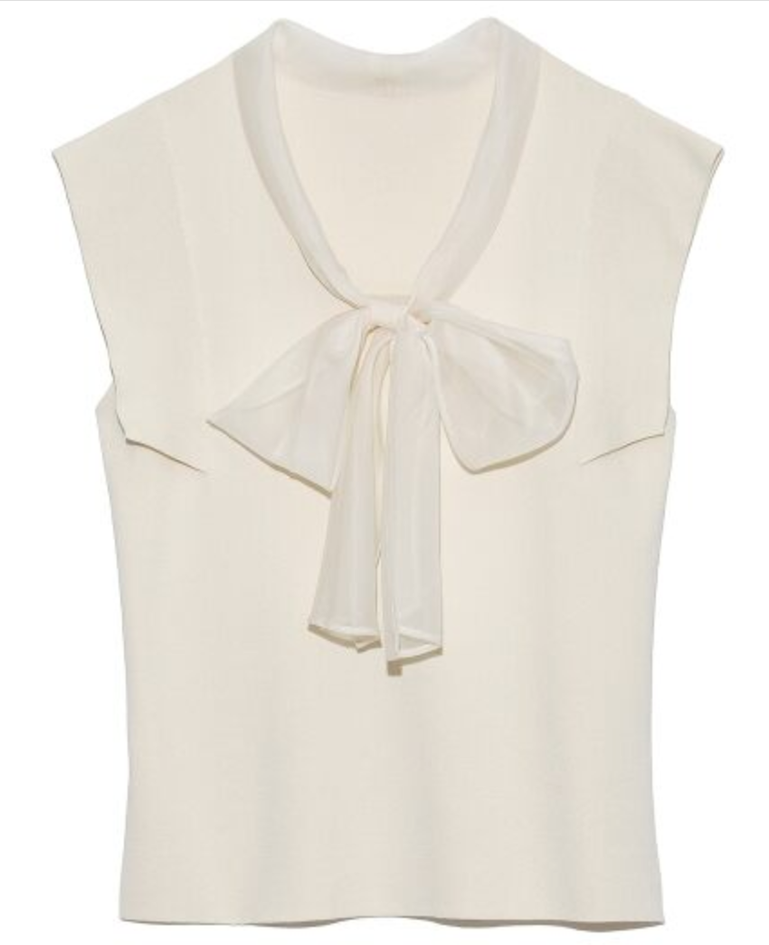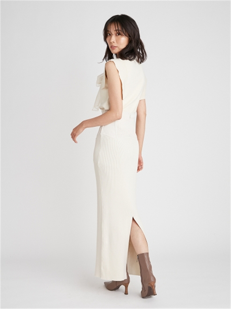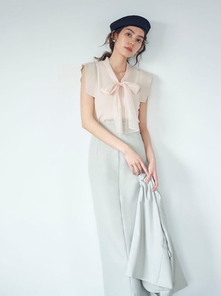 品の良い総針ニットに、シアーなオーガンジーの襟をドッキングし表情豊かに仕上げたプルオーバー。胸元で結んだボウタイリボンやフリリーなスリーブで、女性らしくエレガントなルックスにまとめています。ボディラインに優しく沿うすっきりとしたシルエットは様々なアイテムと好相性。タックインしてももたつかないので旬のハイウエストボトムともバランス良く決まります。