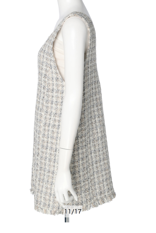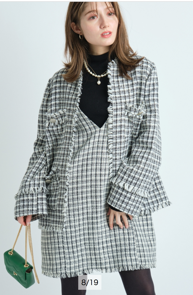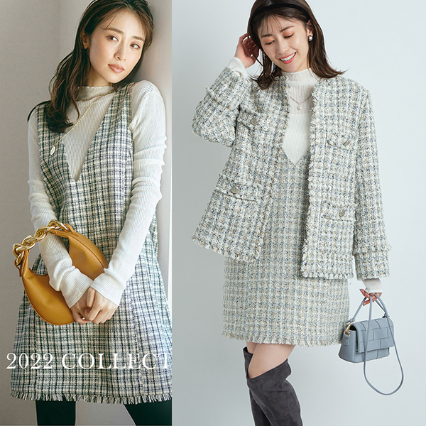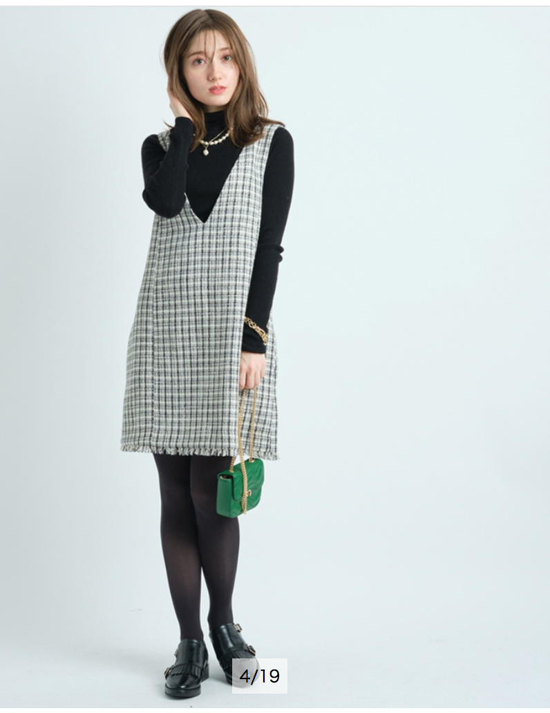 多色使いと立体感のあるツイード生地で、華やかな印象に仕上げたジャンパースカート。
