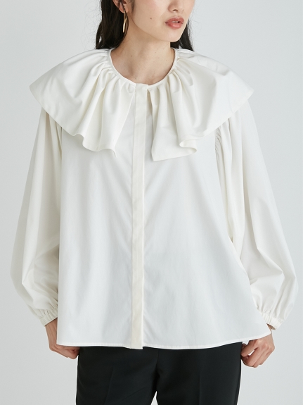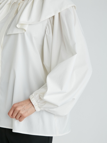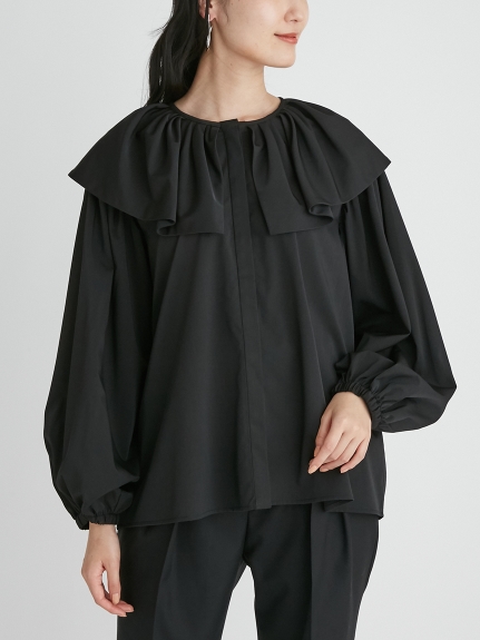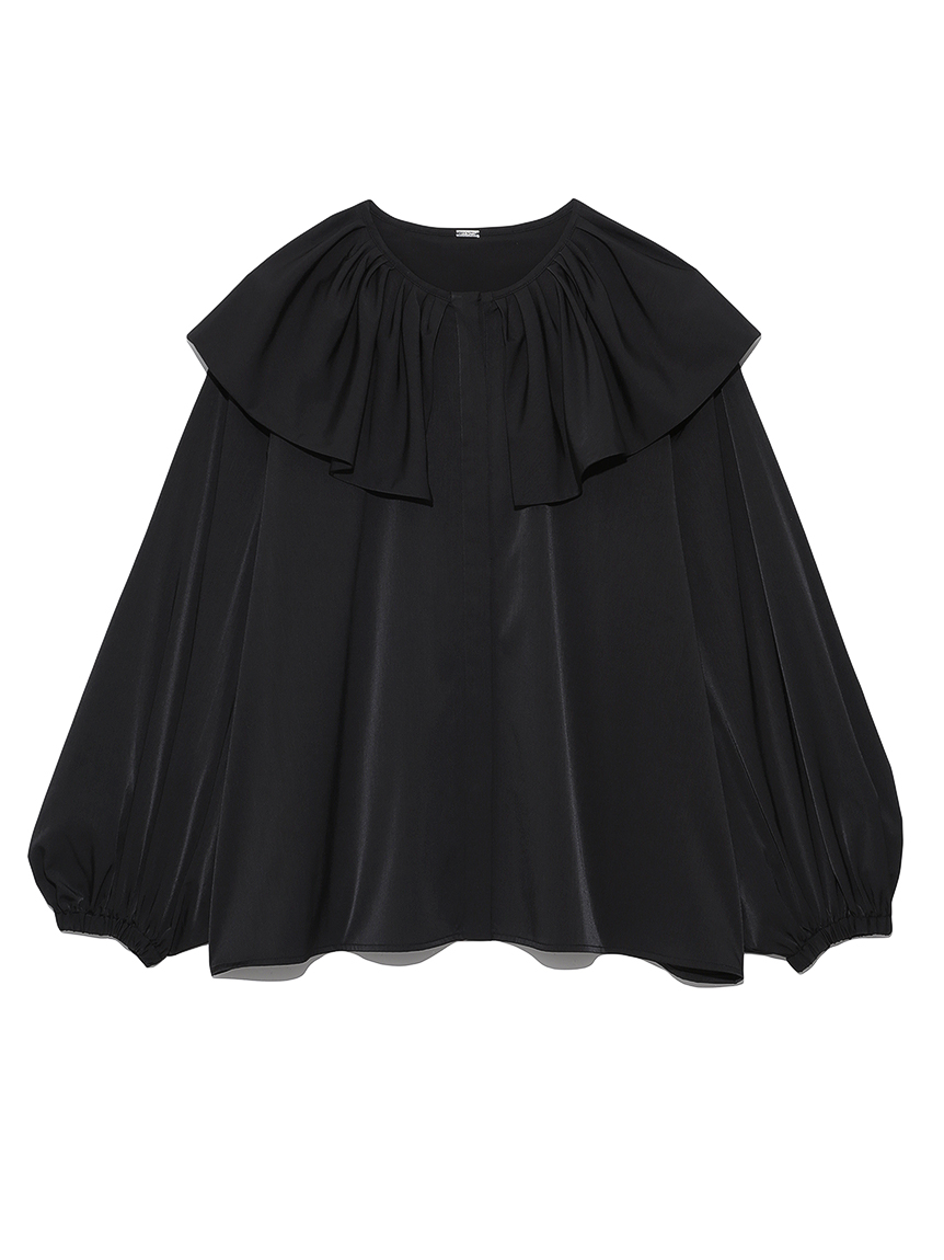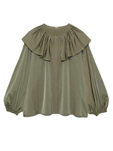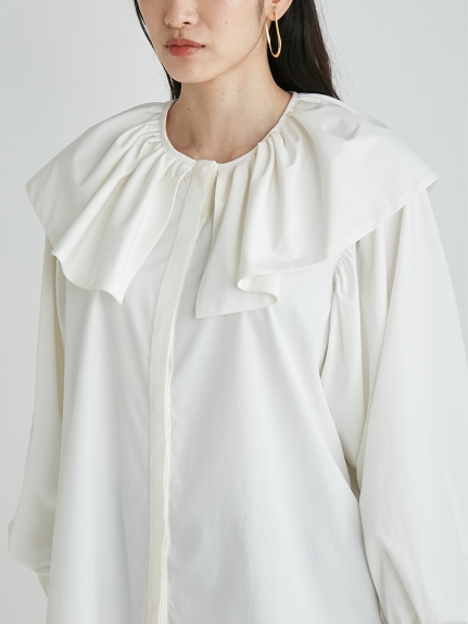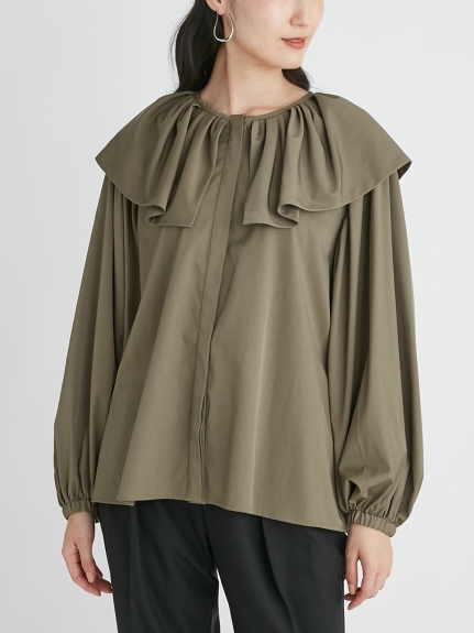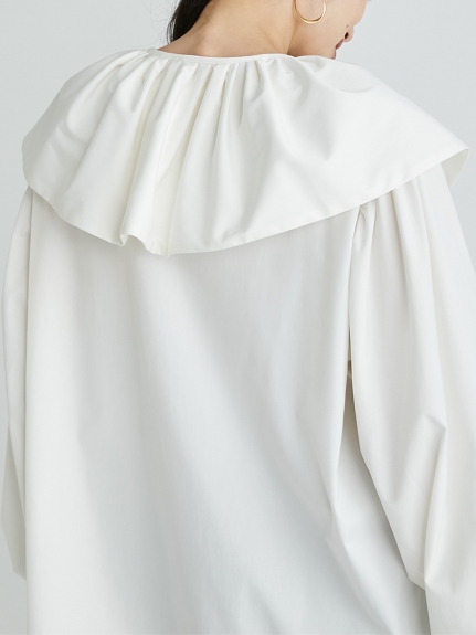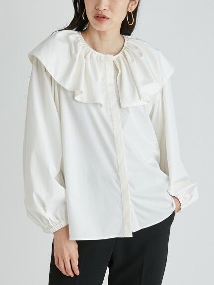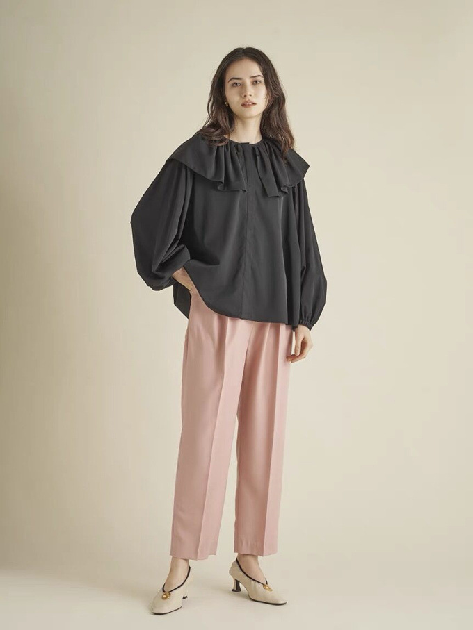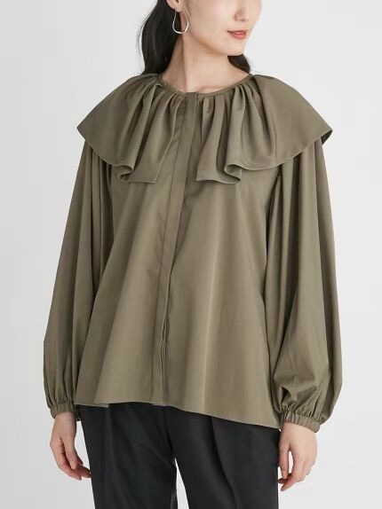 大胆にあしらったラッフルカラーがトレンド感たっぷり。大振りフリルが際立つように、フロントは比翼仕立てにし、スッキリ仕上げました。フリルから繋がるように、身幅はワイドなフレシルエットに。袖口に平ゴムを入れたボリューム袖も、フェミニン気分を盛り上げます。全体的にゆったりしているので、体型カバー効果も上々。一枚ではもちろん、冬本番はざっくりニットカーデなどとレイヤードして楽しんでも◎。