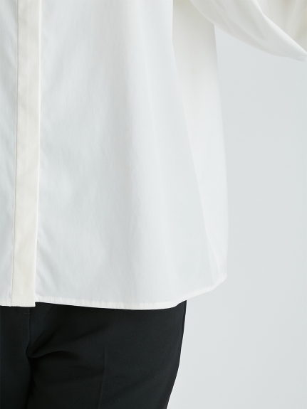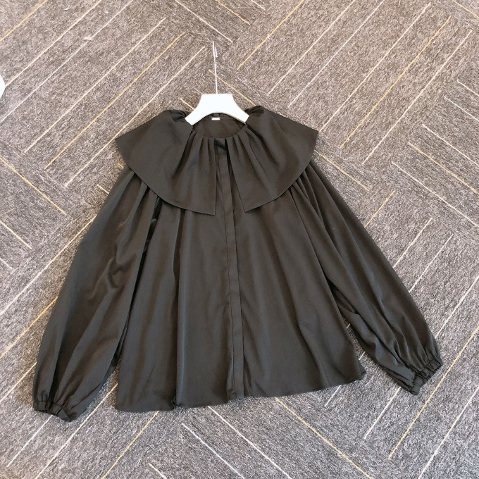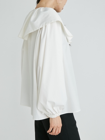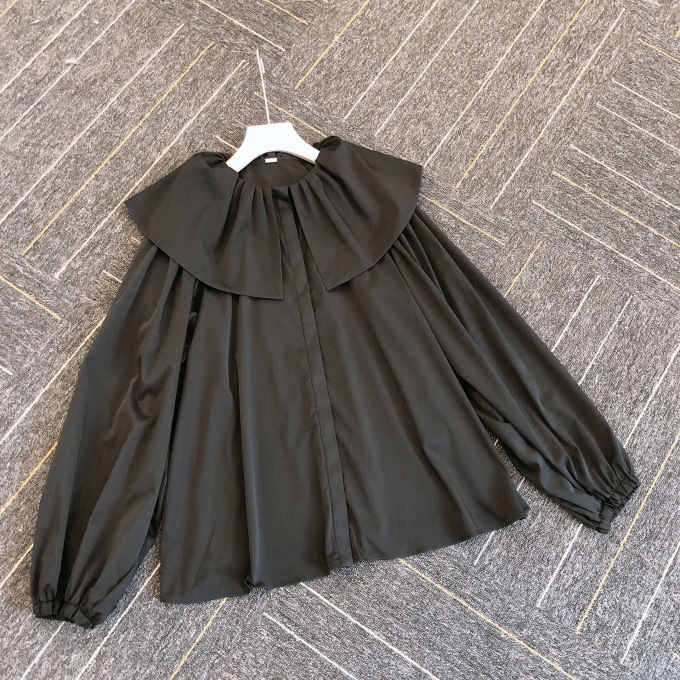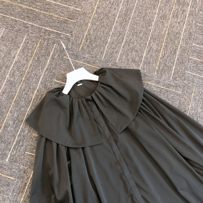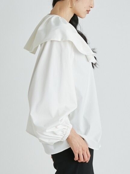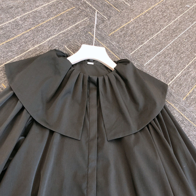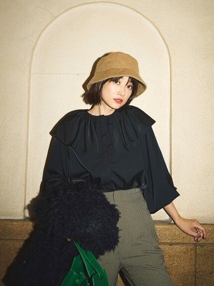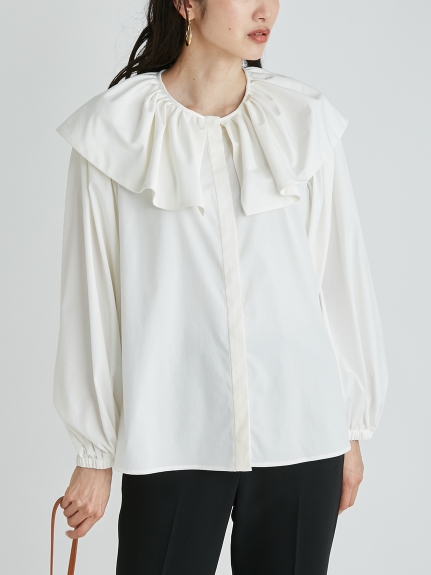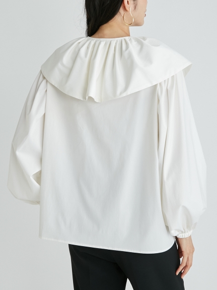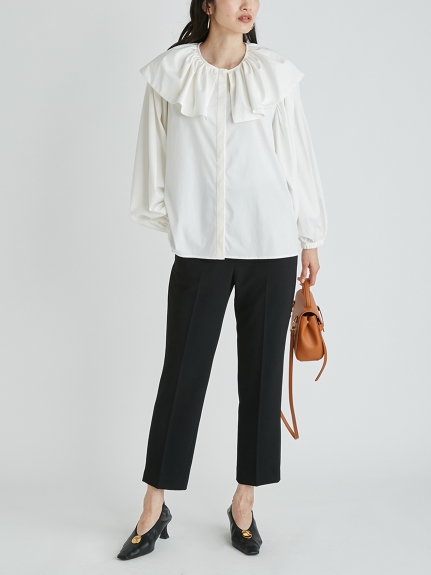大胆にあしらったラッフルカラーがトレンド感たっぷり。大振りフリルが際立つように、フロントは比翼仕立てにし、スッキリ仕上げました。フリルから繋がるように、身幅はワイドなフレシルエットに。袖口に平ゴムを入れたボリューム袖も、フェミニン気分を盛り上げます。全体的にゆったりしているので、体型カバー効果も上々。一枚ではもちろん、冬本番はざっくりニットカーデなどとレイヤードして楽しんでも◎。