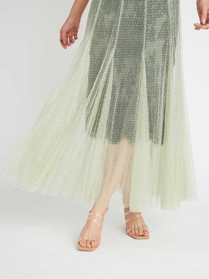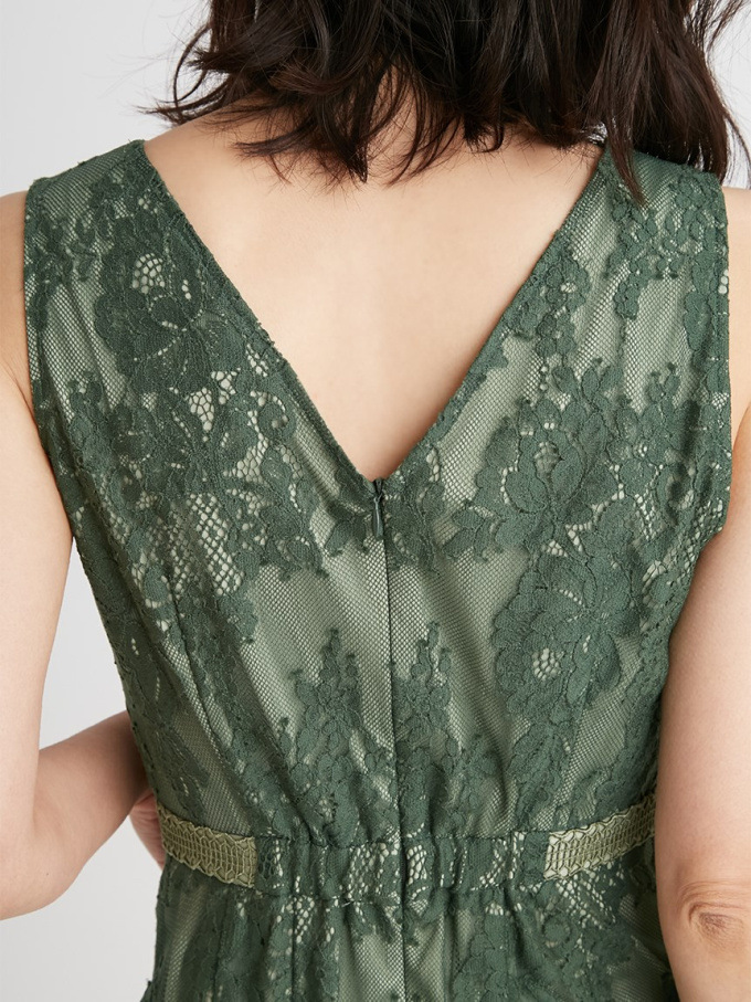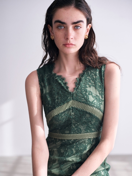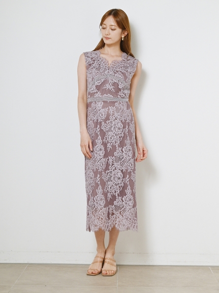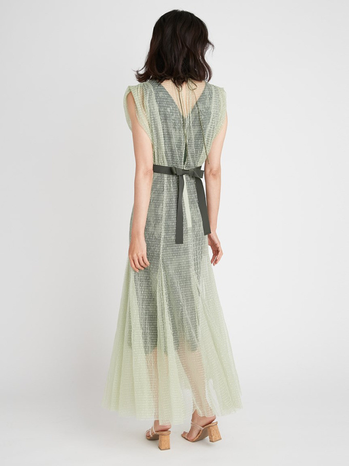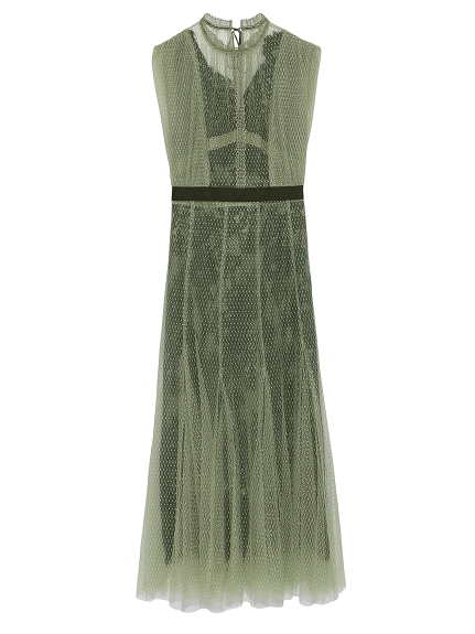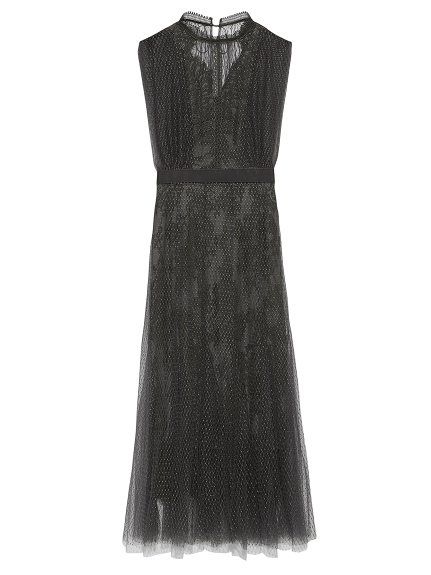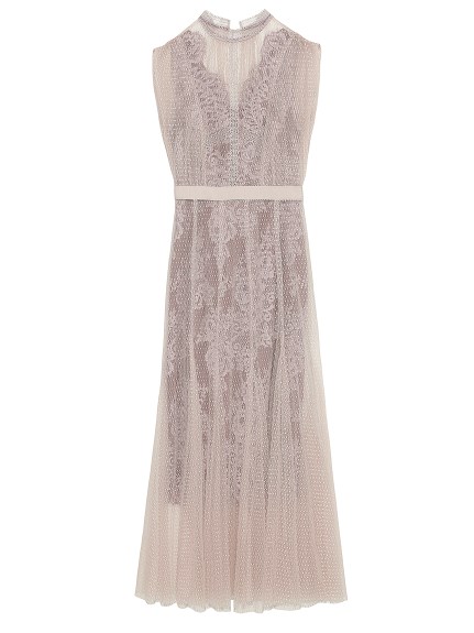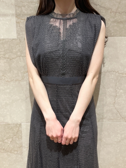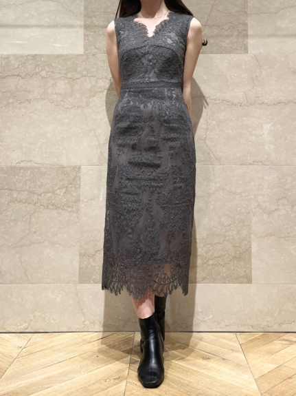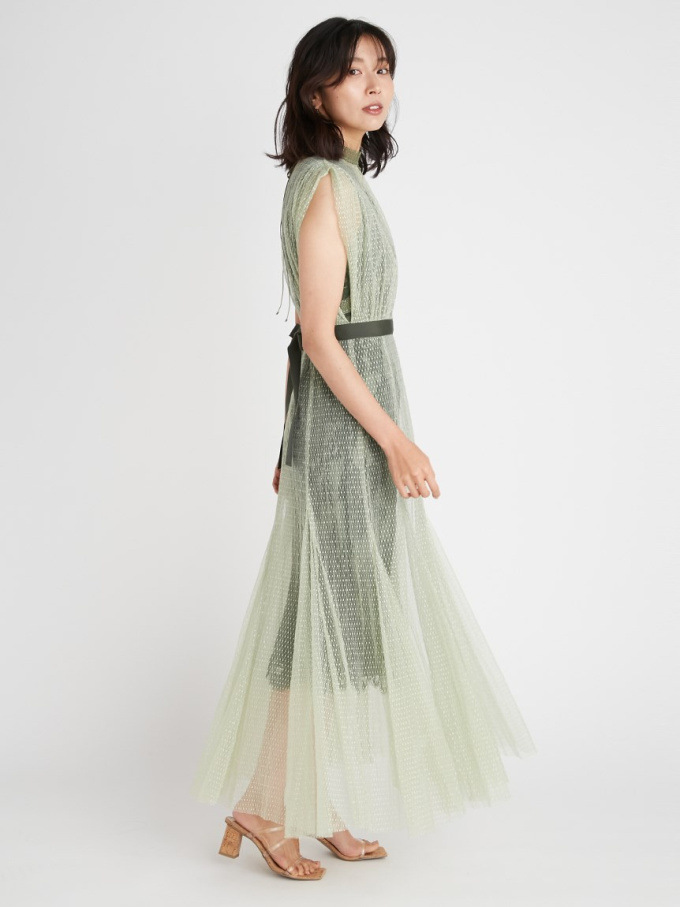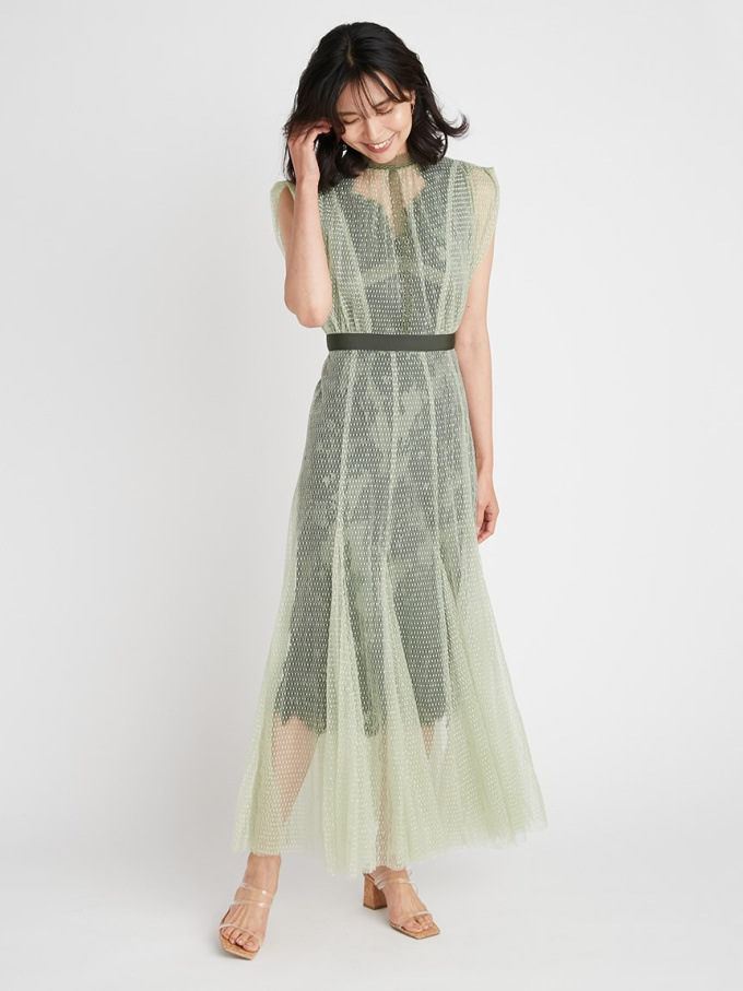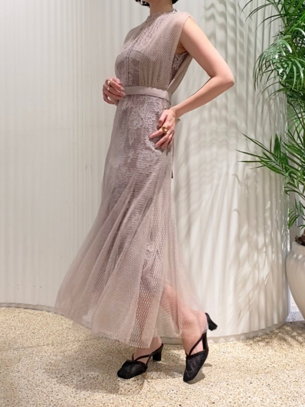 シアーなドットチュールとフラワーレースを重ね合わせた、エレガント&モードなオケージョンドレス。それぞれのマテリアルの色を変えることで、奥行のある美しい表情を演出しています。分量感たっぷりに広がるマーメイドシルエットでトレンド感もしっかりとKEEP。それぞれ別々にして他のアイテムとも組み合わせられるので、これだけでコーディネートの幅は一気に広がります。