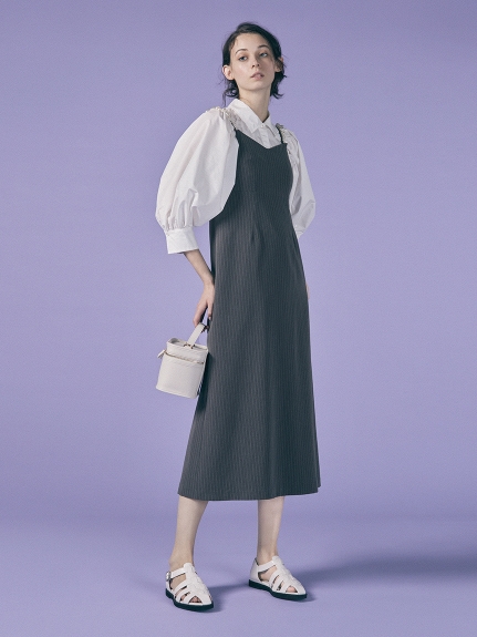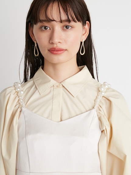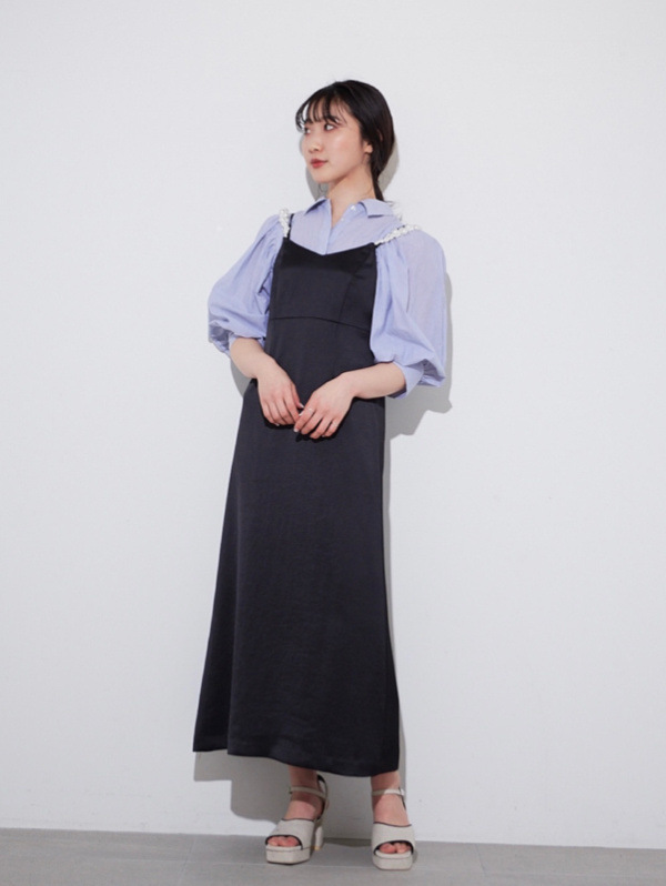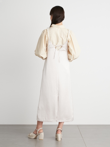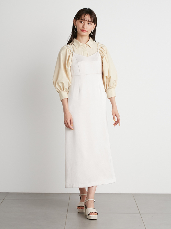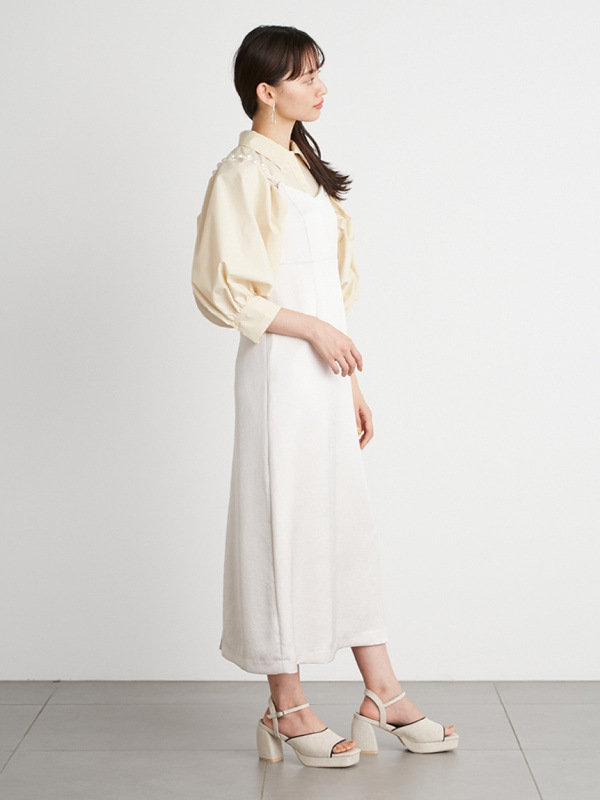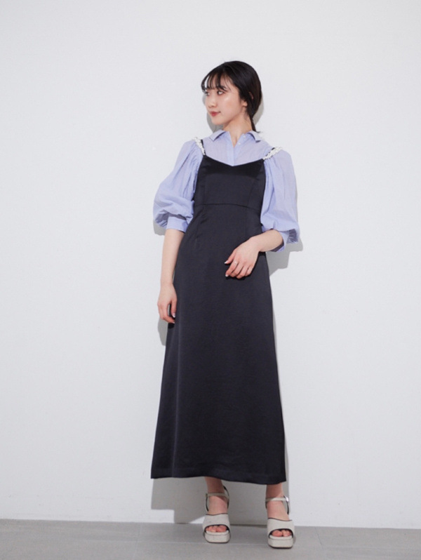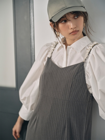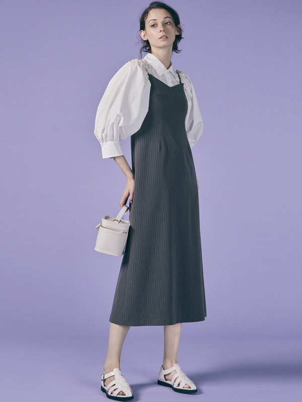 ふっくらとしたボリュームスリーブのシャツとパールストラップを採用したキャミワンピースのセットアイテム。コンビでもそれぞれ単品でも活躍してくれる便利なアイテムで、スタイリングの幅は一気に広がります。パールのストラップは取り外しができ、その日の気分アレンジ可能。足元はモードなサンダルなどをプラスしこなれ感たっぷりに決めるのがオススメです。