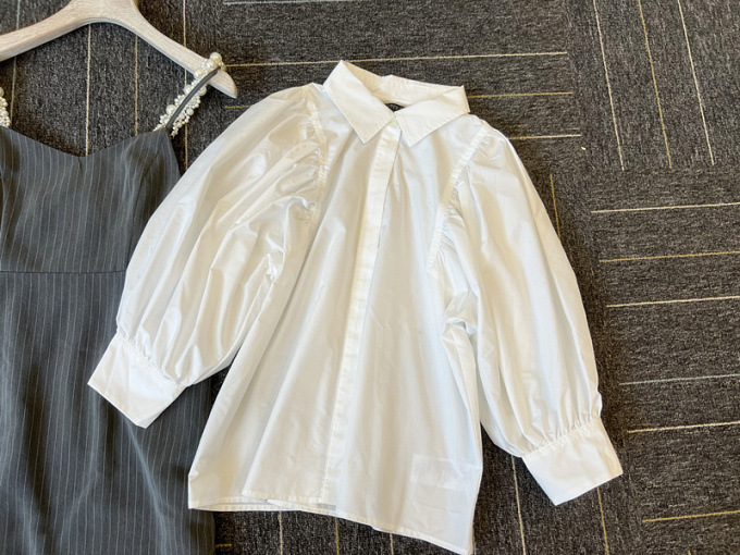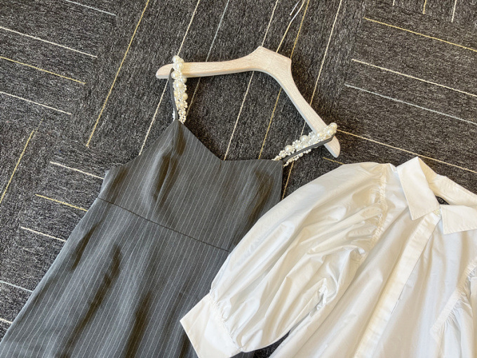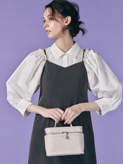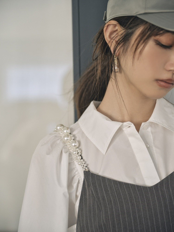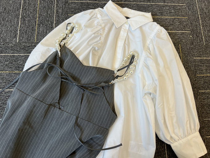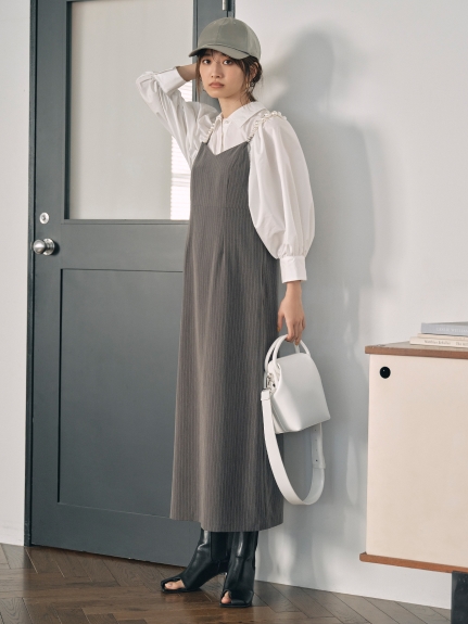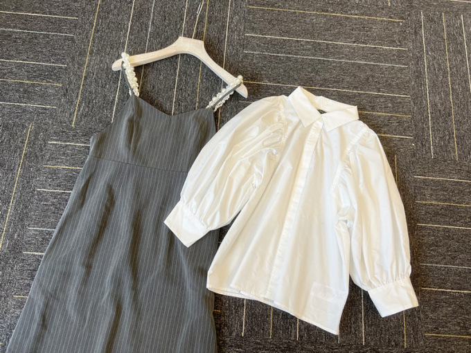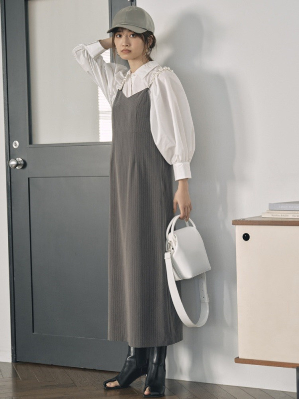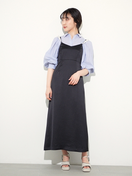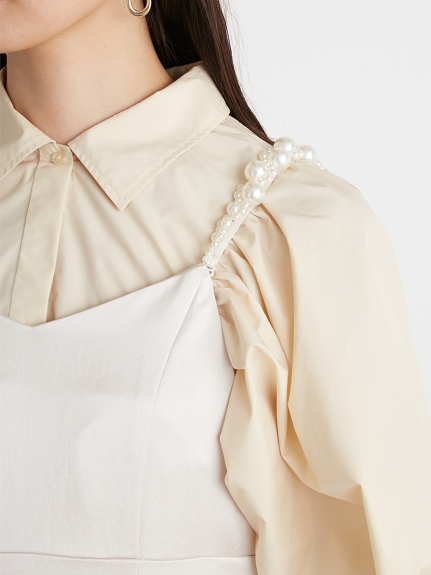 ふっくらとしたボリュームスリーブのシャツとパールストラップを採用したキャミワンピースのセットアイテム。コンビでもそれぞれ単品でも活躍してくれる便利なアイテムで、スタイリングの幅は一気に広がります。パールのストラップは取り外しができ、その日の気分アレンジ可能。足元はモードなサンダルなどをプラスしこなれ感たっぷりに決めるのがオススメです。