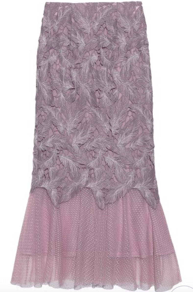 繊細なレース使いで人気を集める「SNIDEL」定番のスカートが登場。今シーズンはフェザーをモチーフにしたオリジナルレースで存在感たっぷりに仕上げました。裾部分はドットチュールで切り替え、軽やかさと華やかさをプラス。チュール部分にたっぷりとギャザーを入れたメリハリのあるシルエットは甘くなり過ぎず、品の良いスタイリングを叶えてくれます。ウエストはすっきりとしたデザインなのでトップスINでもアウトでも◎。同素材のトップス(SWFB221133)とセットアップでワンピース風に着こなすのもオススメです。
