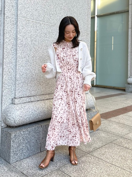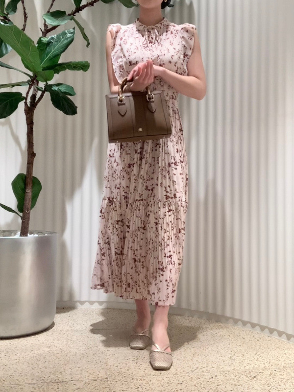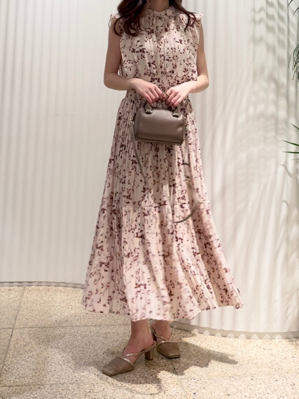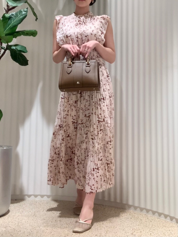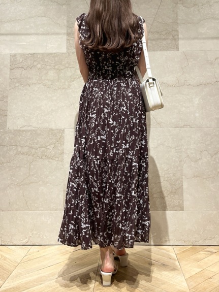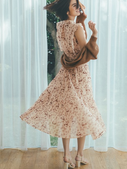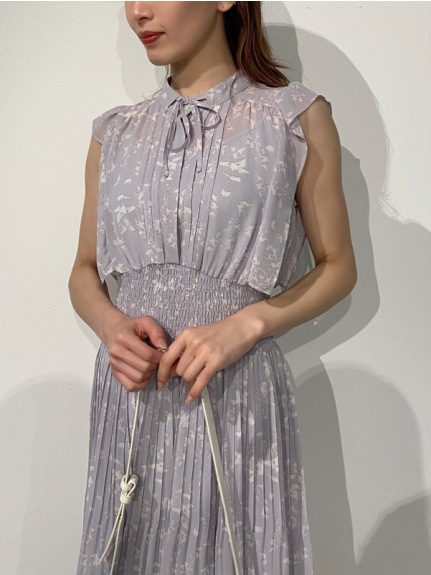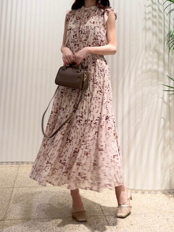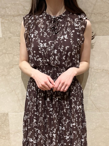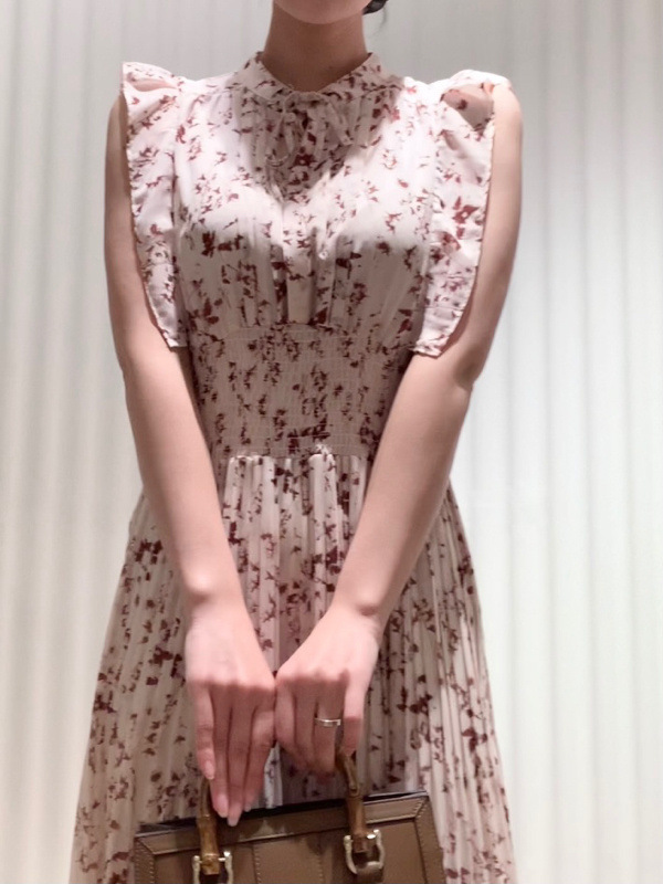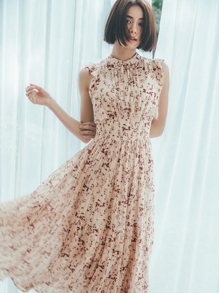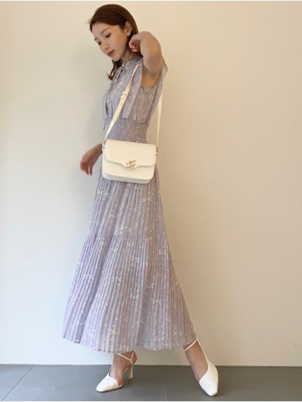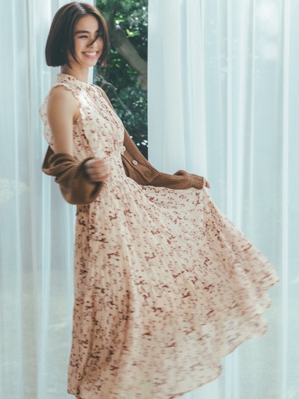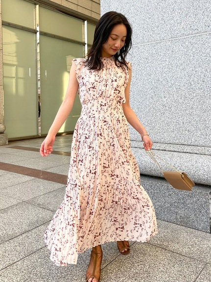 「SNIDEL」ならではの上品で愛らしいオリジナルプリントを浮かべたワンピース。胸元でキュッと結んだリボンやボリュームのあるフリルでとことんレディに仕上げています。シャーリングを効かせたウエストから裾に向かってひらりと広がるフレアシルエットでスタイルアップ効果は抜群。全体に細かく畳んだプリーツが表情にきちんと感を与え、洗練ムードを高めてくれます。インナーキャミソール付きで透け感を気にせず着られるのも嬉しいポイント。