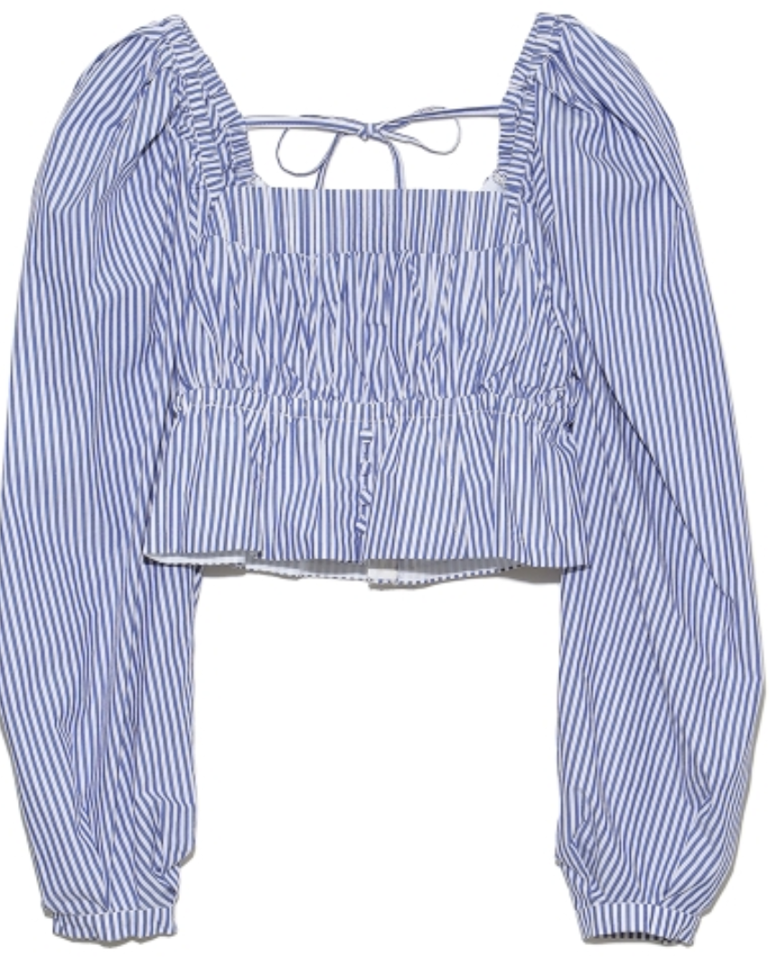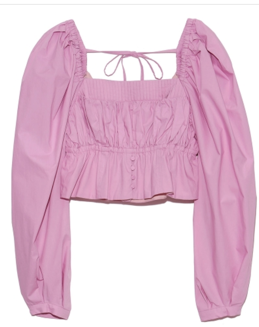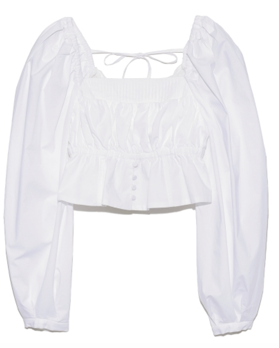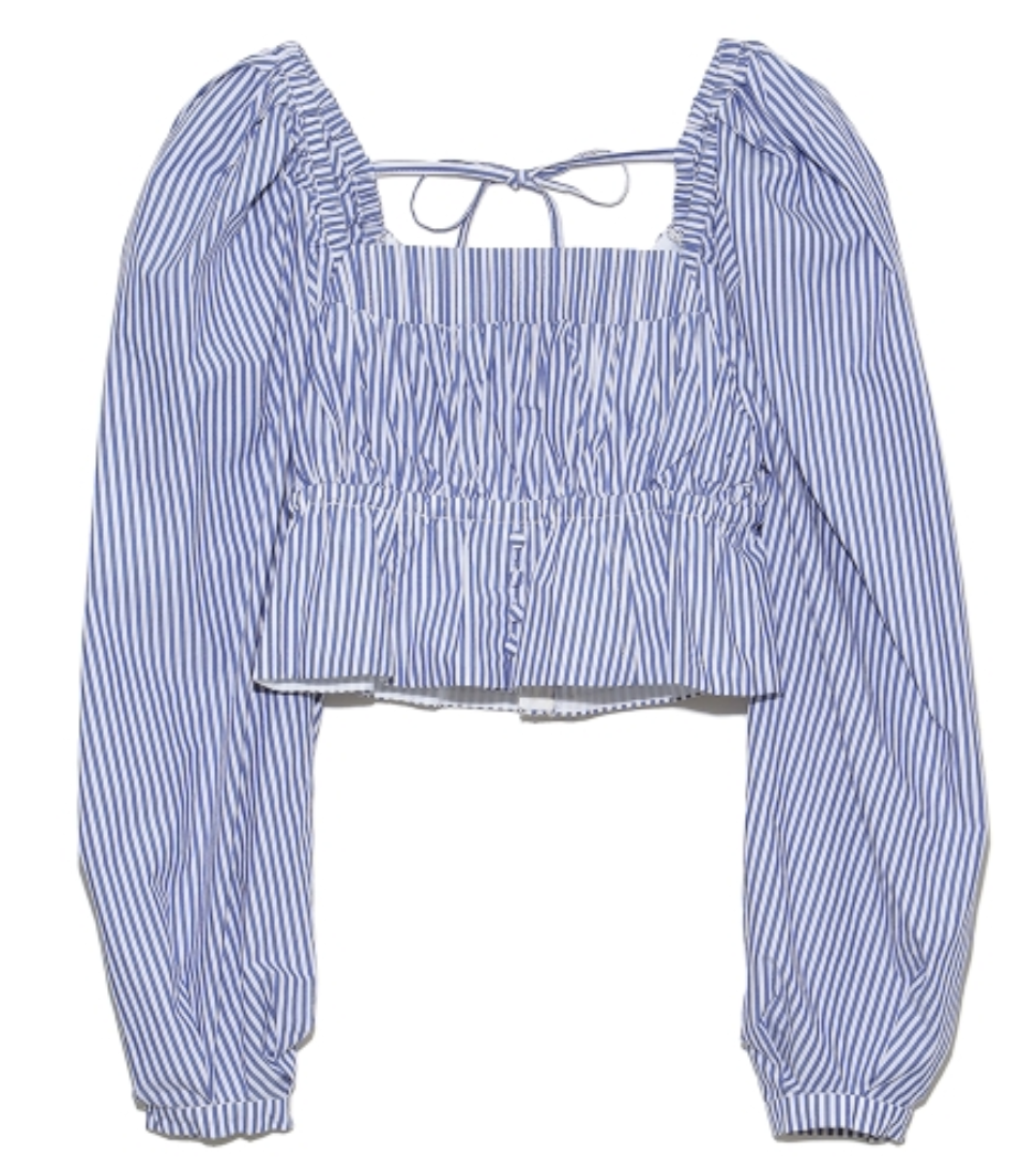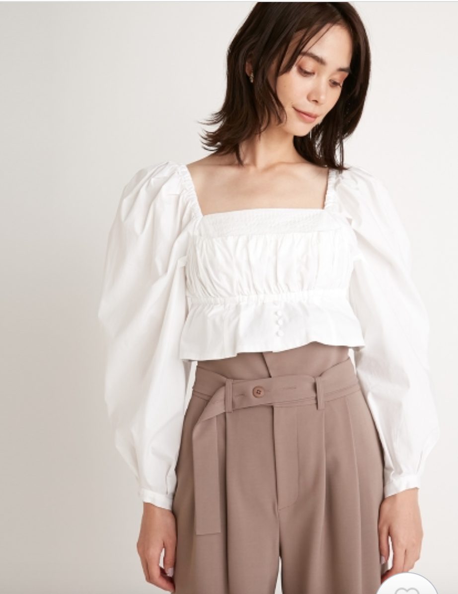 ビスチェを思わせるクラシカルなデザインが印象的なブラウス。胸元にはギャザーとピンタックを施し、ボリュームたっぷりの袖もプラスしてレディ度満点に仕上げました。クロップド丈のペプラム風シルエットが今季らしいデザインに。マニッシュなハイウエストパンツと合わせて、甘さ控えめに着こなすのがおすすめです。