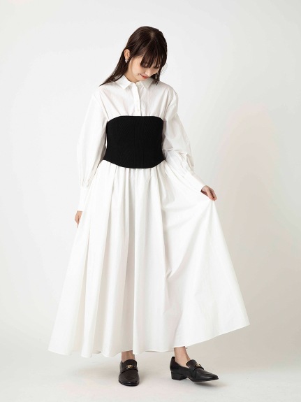 まるでシャツワンピースにニットビスチェを合わせたような技ありのドッキングデザインが魅力の1着。表面加工が施されたコットン生地を用いているので、分量感がありながらも軽い印象を与えてくれます。ドッキングされたビスチェ部分は適度にカーブを描く切り替えを施すことで、女性らしさを感じさせる表情に。フィット&フレアのメリハリシルエットだからスタイルアップ効果も存分に期待できます。