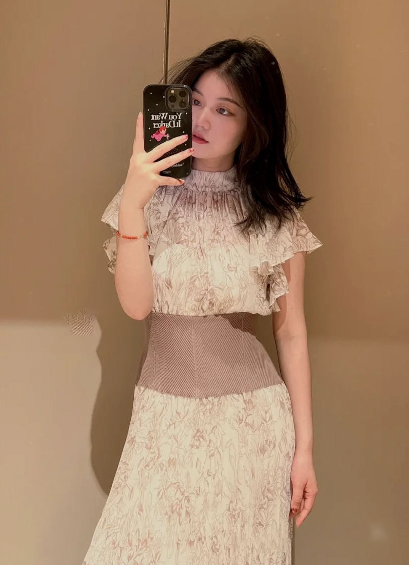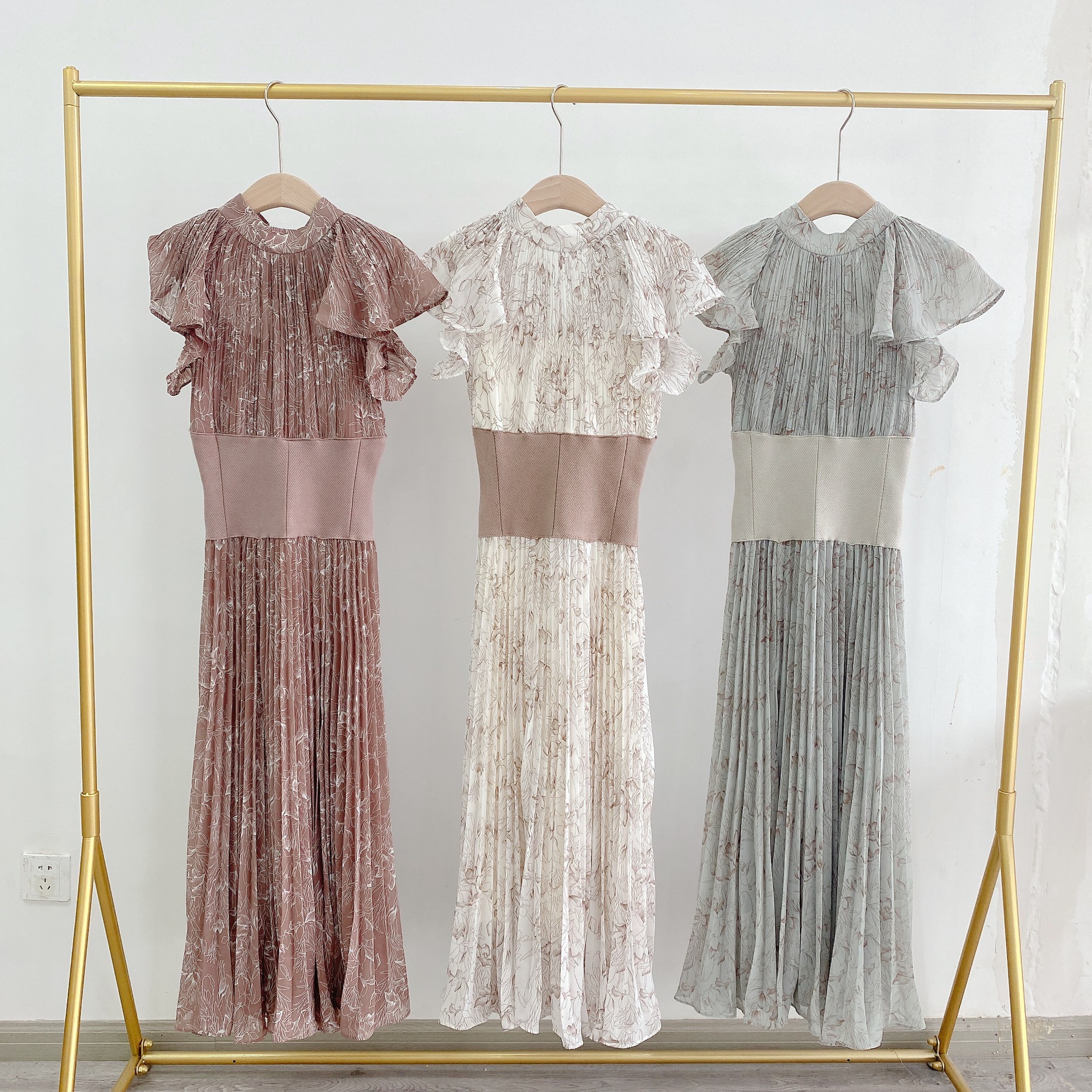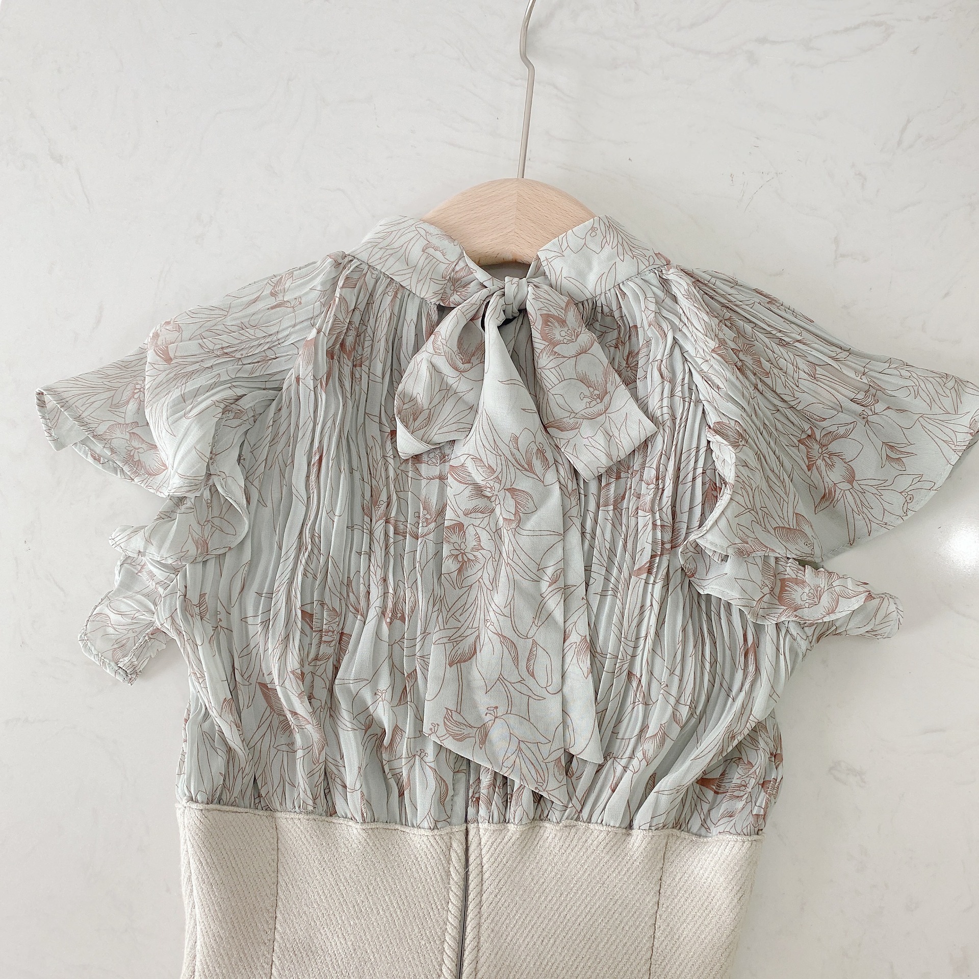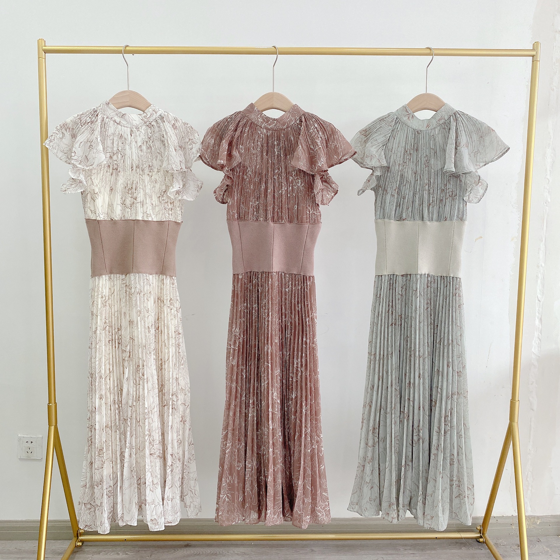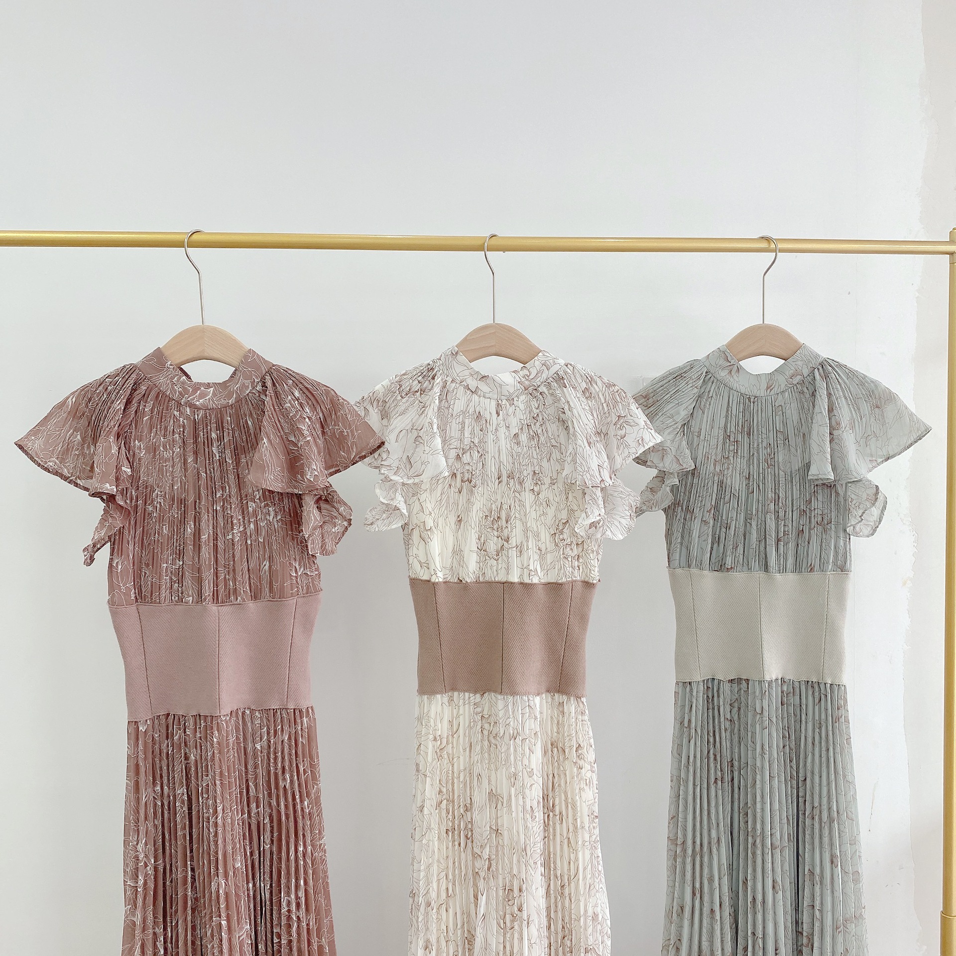 前シーズン人気を集めたワンピースが今季も登場。女性らしい華やかさを演出するシアーなシフォンに線画で表現した花柄を浮かべ大人っぽくまとめました。異素材の絶妙なバランスがモード感を演出するウエストのリブ切り替えは、身体のカーブを強調しスタイルアップ効果は絶大。エレガントに波打つフレアスリーブや品の良いスタンドカラーなど「SNIDEL」らしいディテールは継承し、どこまでも女性らしく仕上げています。