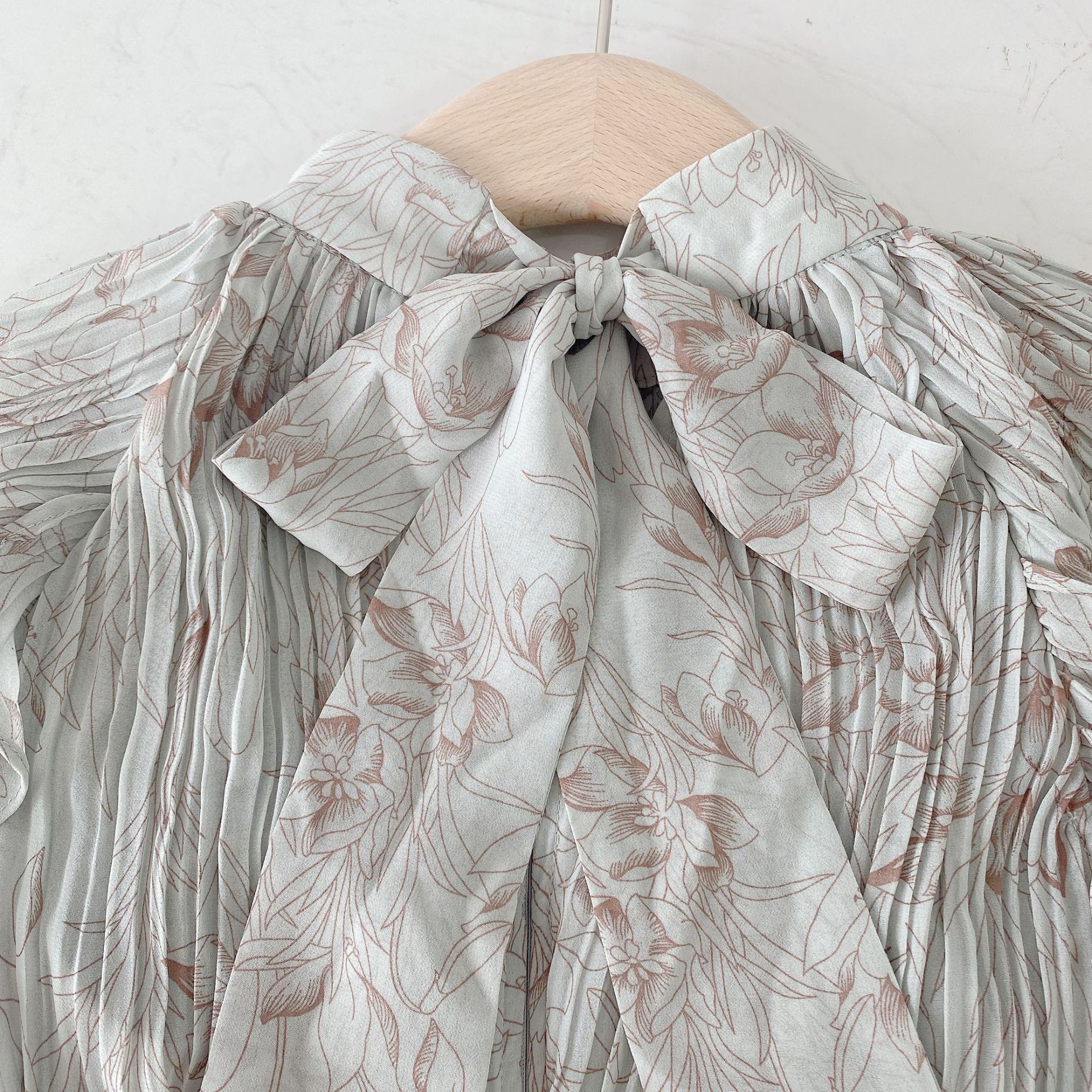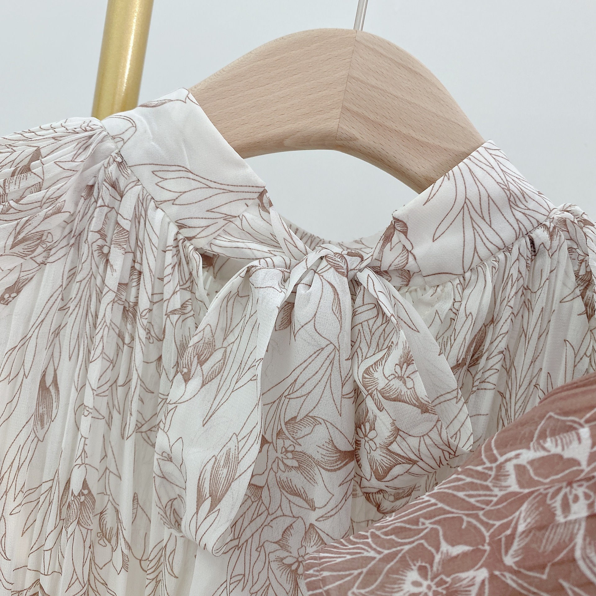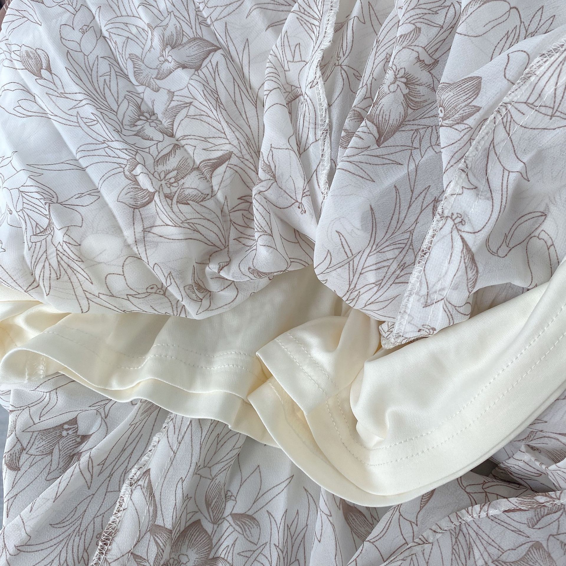 柔らかく透けるシフォンに、トレンド感のある線画タッチの花柄を描きました。アイボリー、グレー、モカの3色展開です。