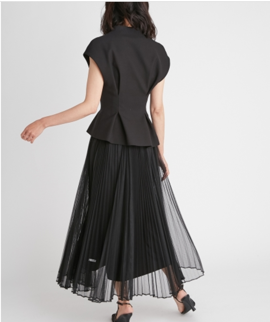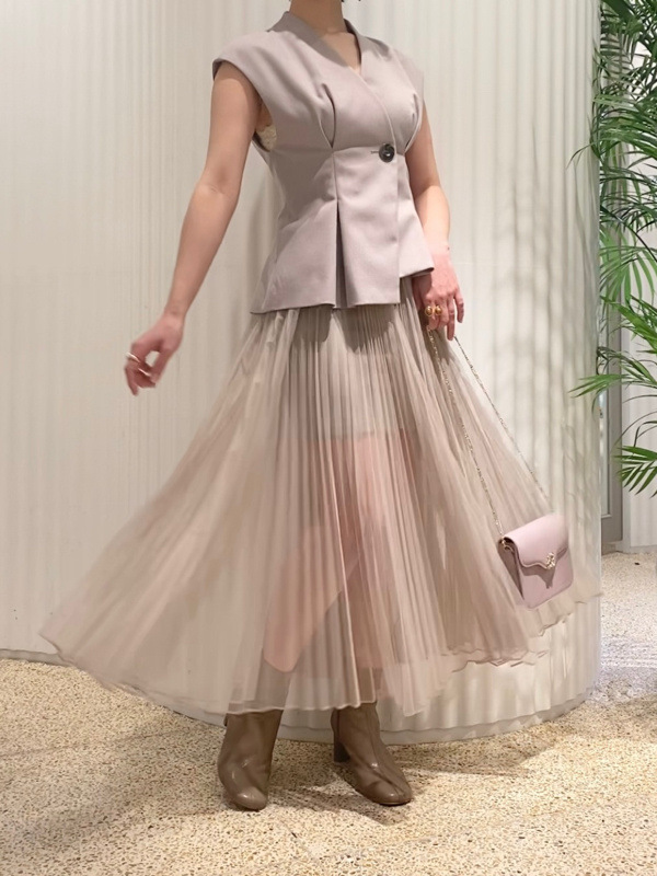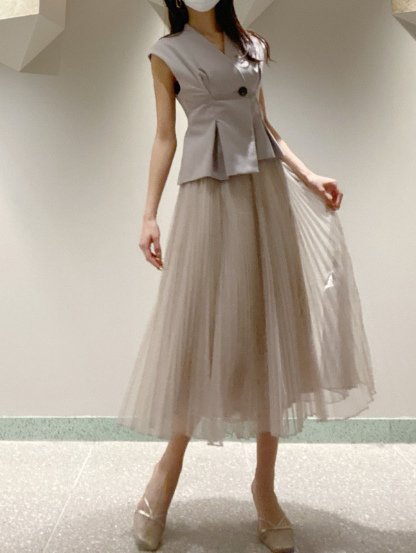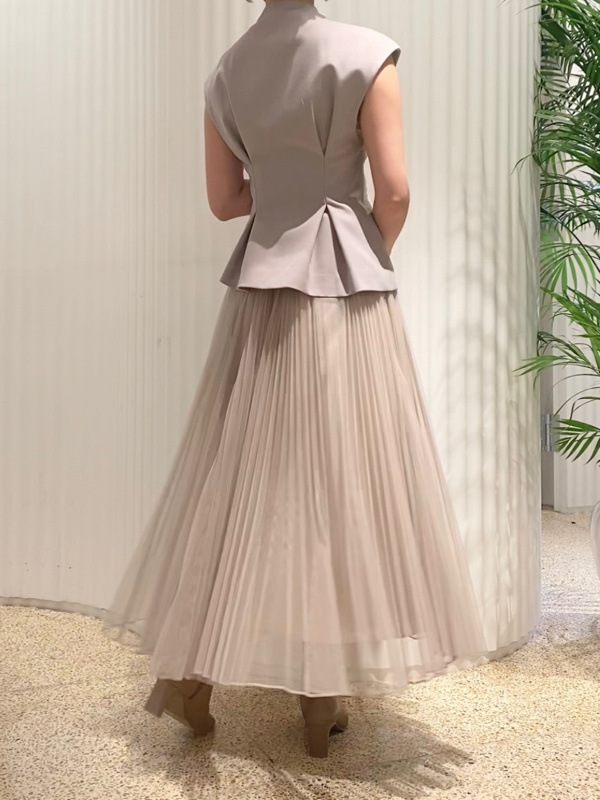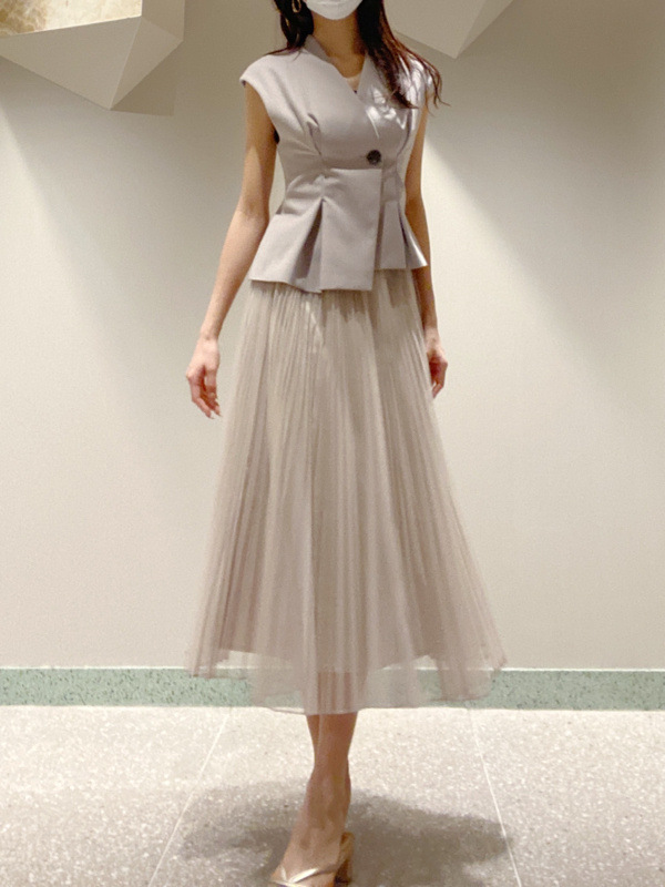 動作のたびに軽やかに揺れるプリーツスカートとハンサムなジレジャケットのセットアイテム。ジレジャケットは、ややクラシックなデザイン要素を落とし込み肩回りは体に沿った丸みを帯びたフォルムに。ウエストでかなりシェイプして腰回りは敢えて体に沿わせず広がるデザインにしているので、シルエットをカバーしつつ、スタイルアップ効果も期待できます。プリーツスカートは、たっぷりの分量を使用した女性らしいフレアシルエット。中に合わせるインナースカートはタイトミニスカートとロングのサテンスカートを備えているのでオケージョンだけではなく、様々なシチュエーションに合わせて使い分けのできる豪華な4点セットです。