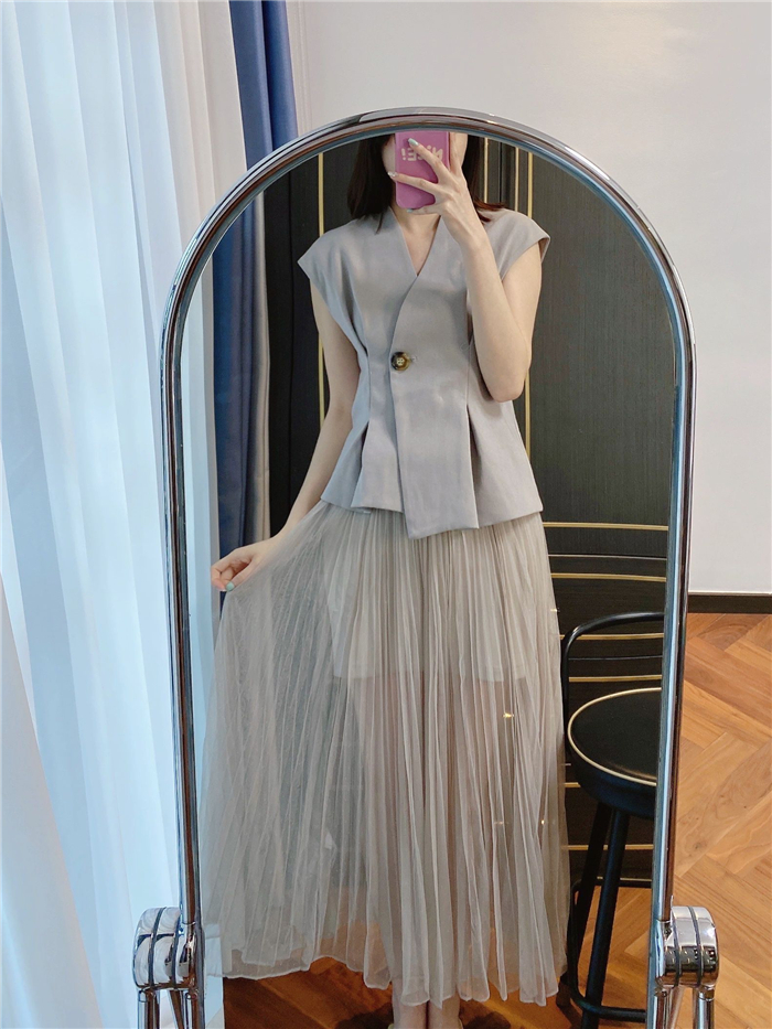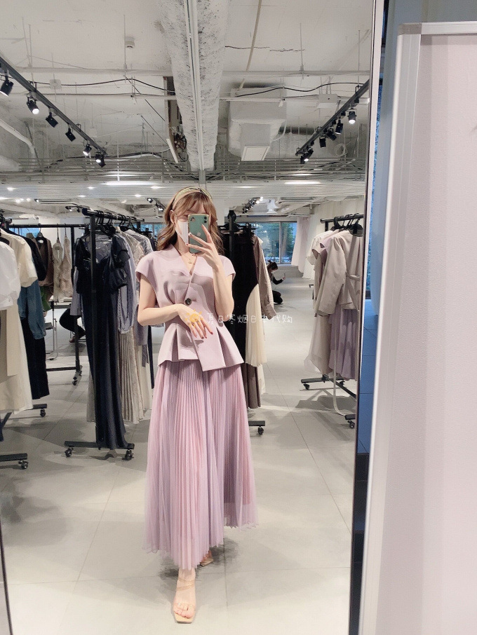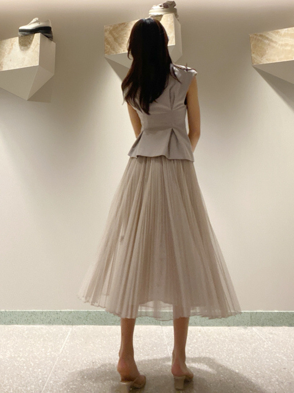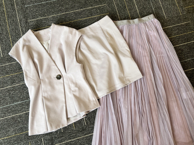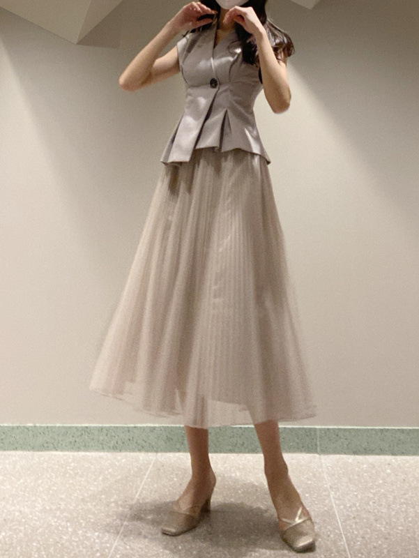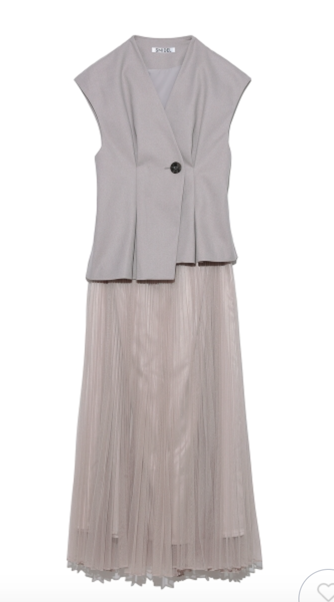 動作のたびに軽やかに揺れるプリーツスカートとハンサムなジレジャケットのセットアイテム。ジレジャケットは、ややクラシックなデザイン要素を落とし込み肩回りは体に沿った丸みを帯びたフォルムに。ウエストでかなりシェイプして腰回りは敢えて体に沿わせず広がるデザインにしているので、シルエットをカバーしつつ、スタイルアップ効果も期待できます。プリーツスカートは、たっぷりの分量を使用した女性らしいフレアシルエット。中に合わせるインナースカートはタイトミニスカートとロングのサテンスカートを備えているのでオケージョンだけではなく、様々なシチュエーションに合わせて使い分けのできる豪華な4点セットです。