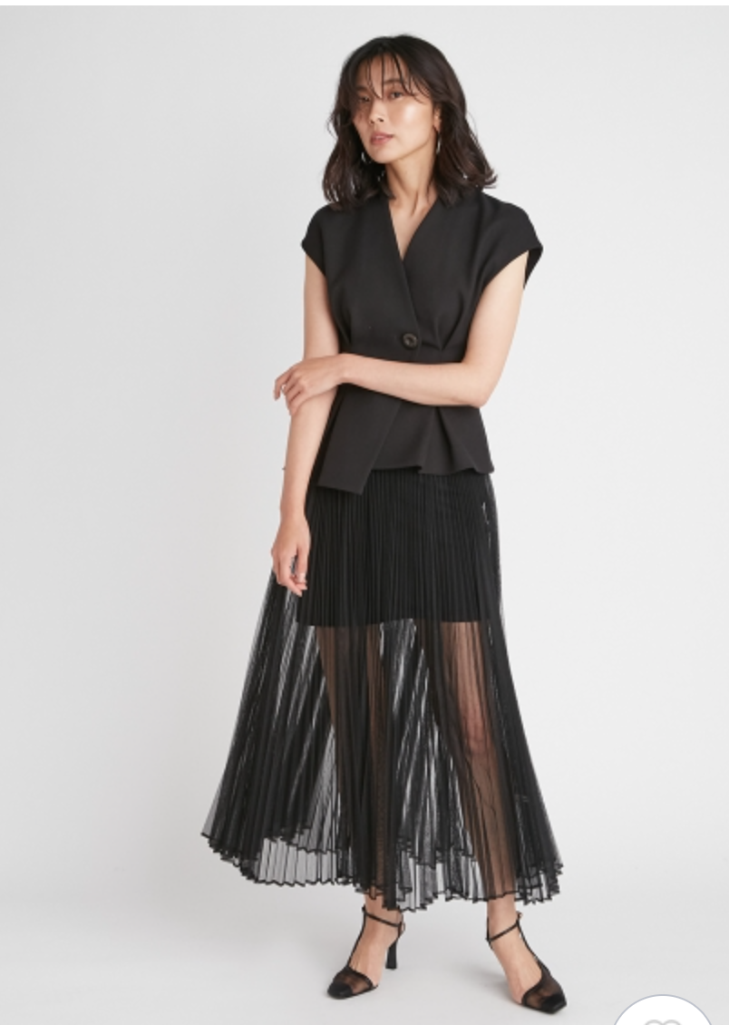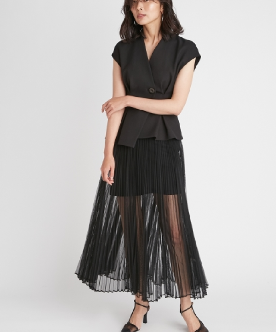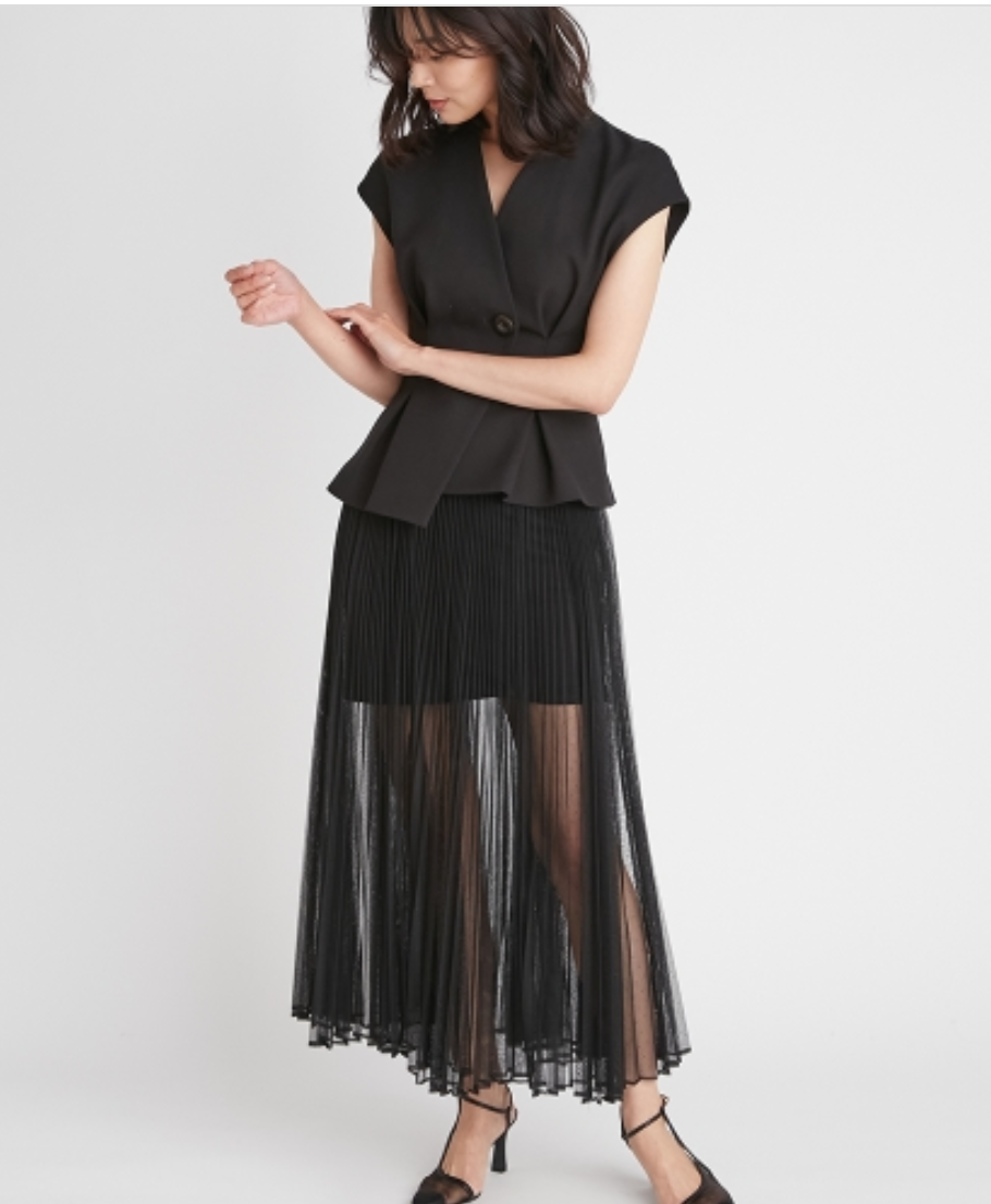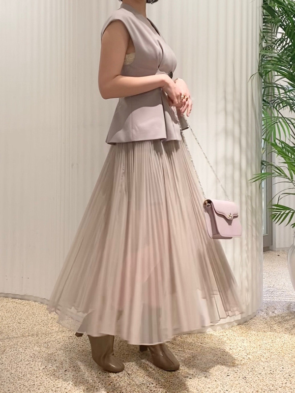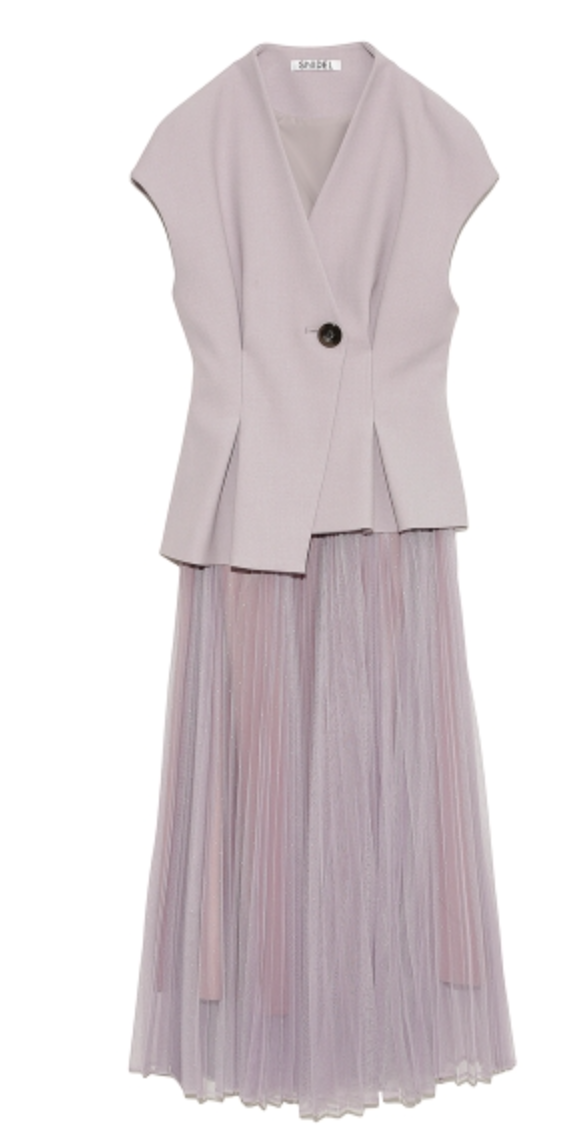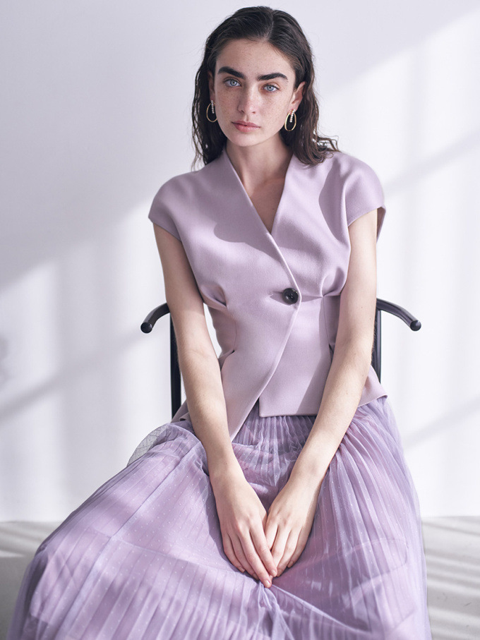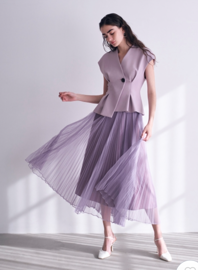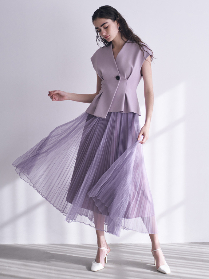 ジレは品の良いしなやかなマテリアルを使用し、スカートは透明感のあるチュール素材を使用。着まわしやすく定番のブラック&モカに加え、女性らしい優しいニュアンスのラベンダーの3色をご用意しました。