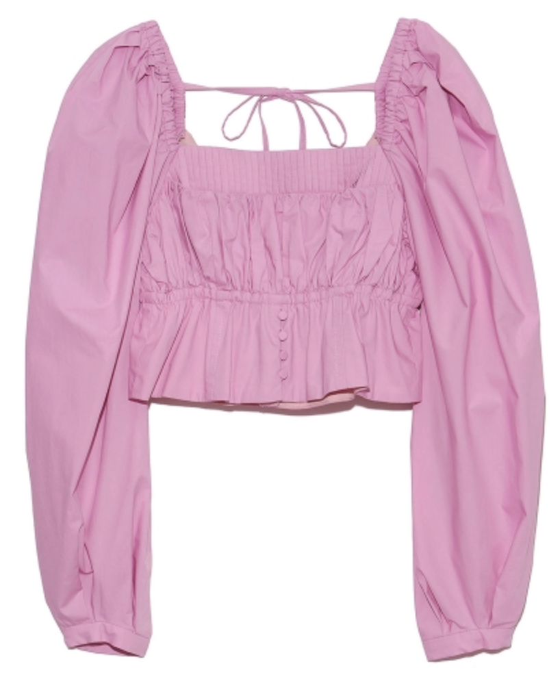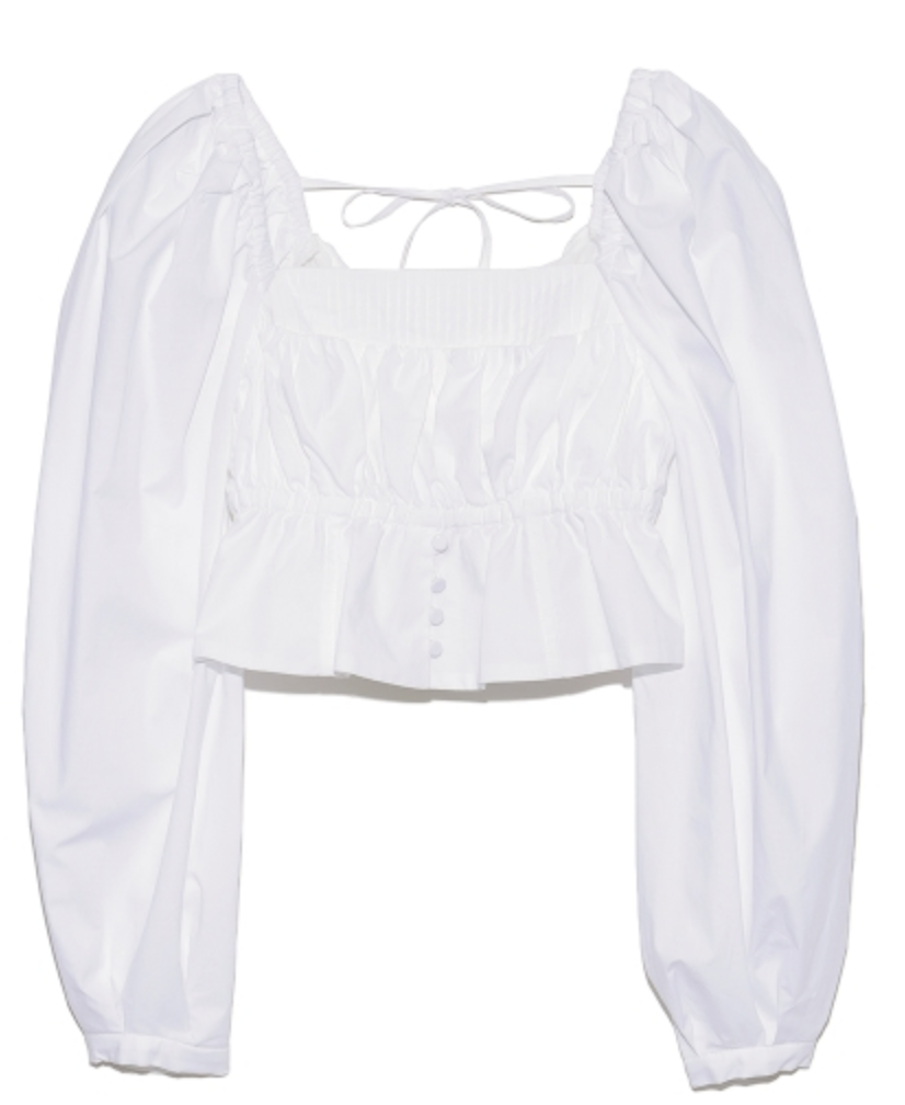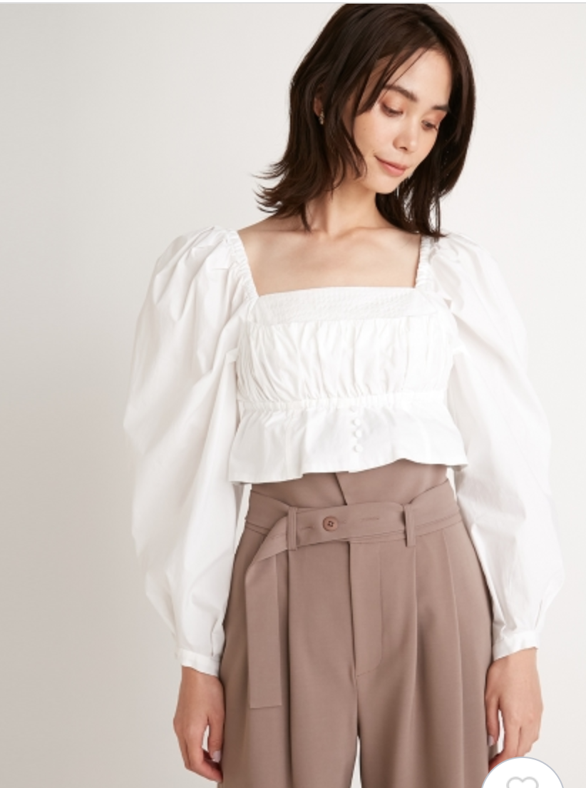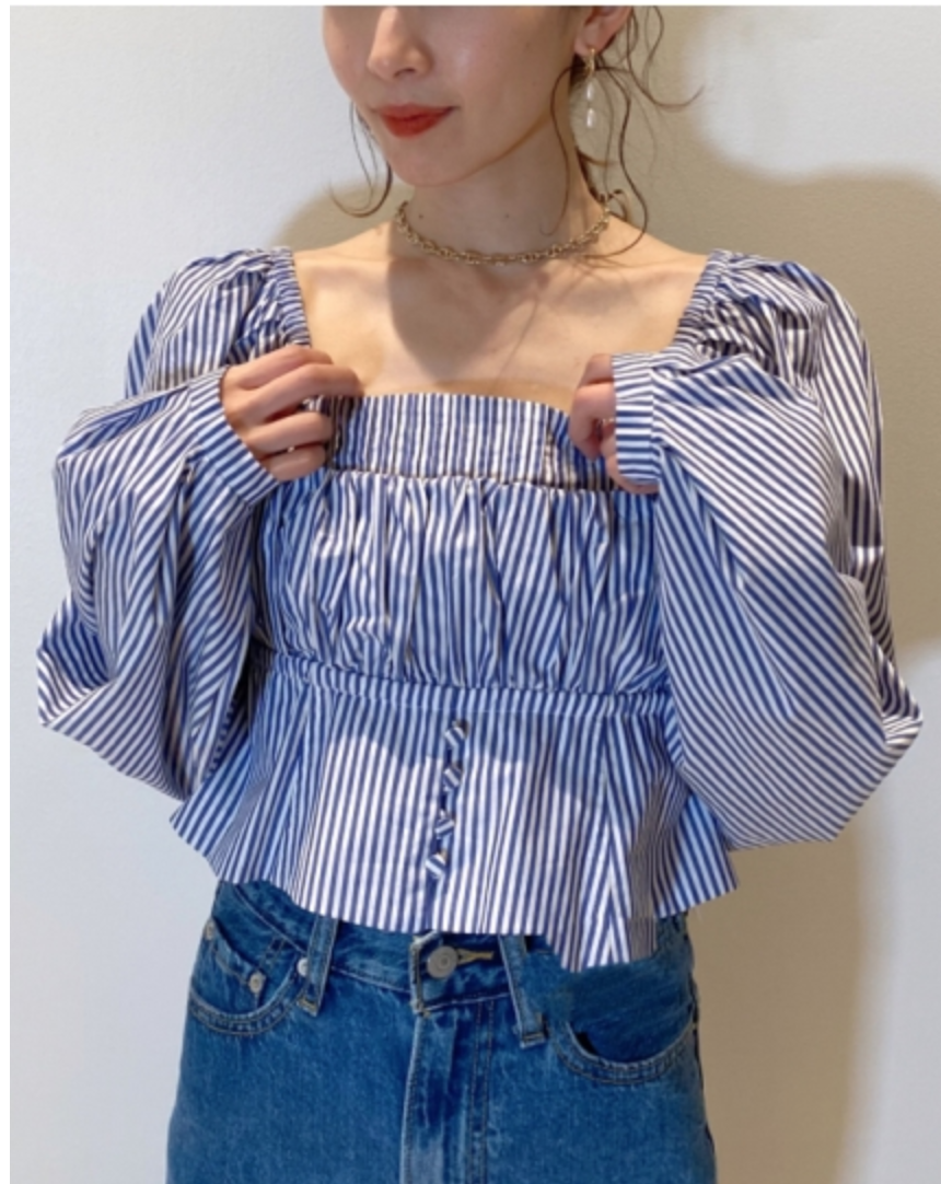 ビスチェを思わせるクラシカルなデザインが印象的なブラウス。胸元にはギャザーとピンタックを施し、ボリュームたっぷりの袖もプラスしてレディ度満点に仕上げました。クロップド丈のペプラム風シルエットが今季らしいデザインに。マニッシュなハイウエストパンツと合わせて、甘さ控えめに着こなすのがおすすめです。