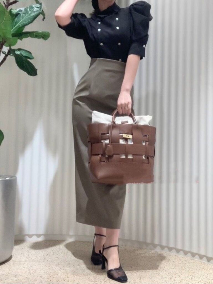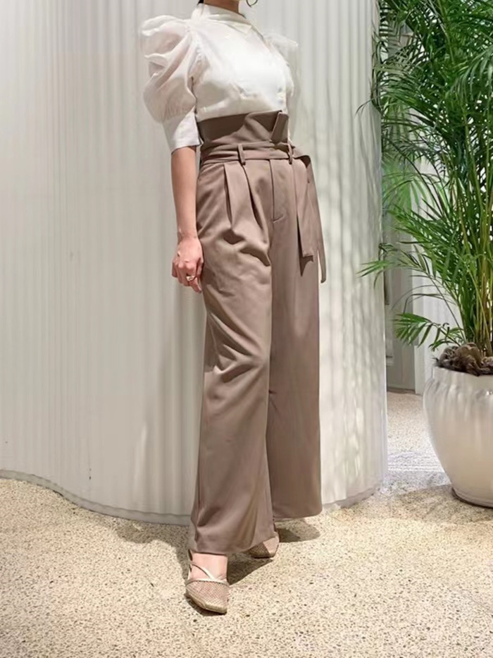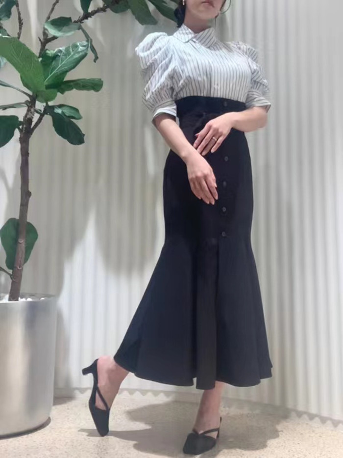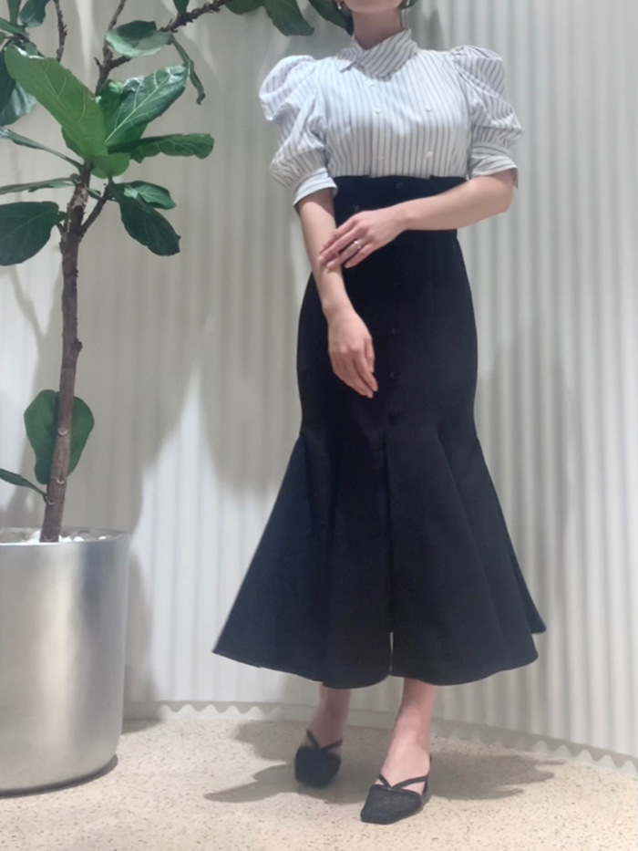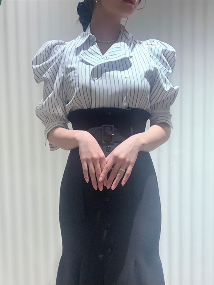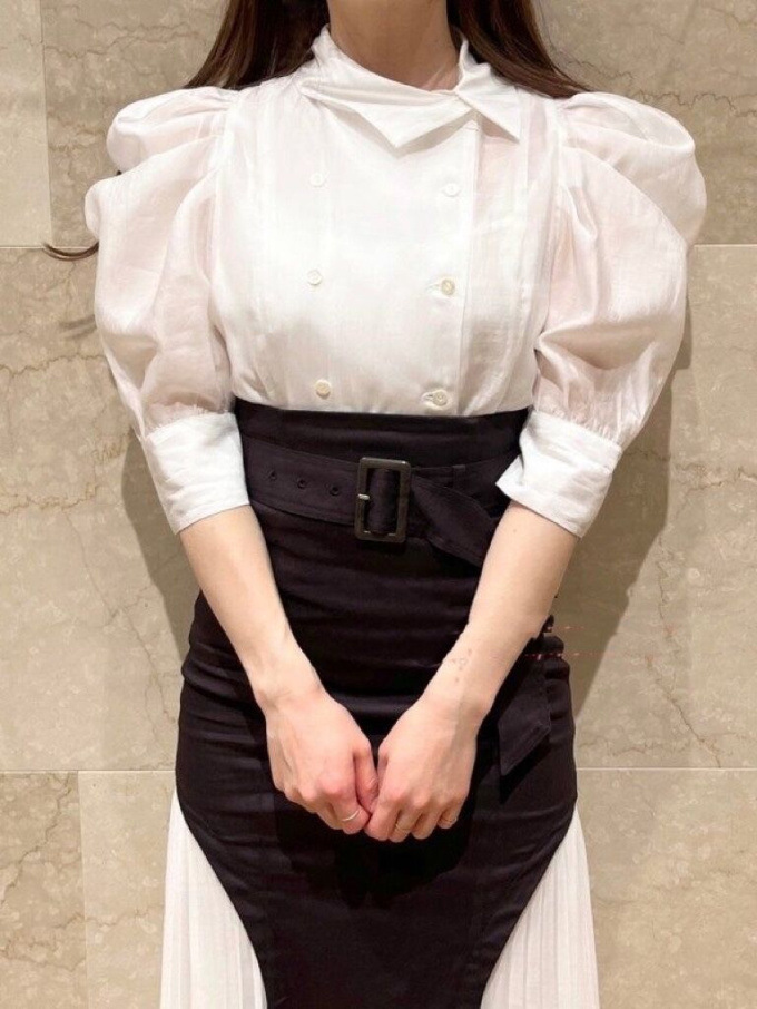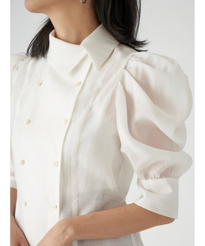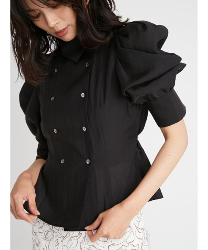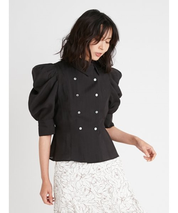 ダブルブレストのフロントデザインが印象的。王道のクラシカルディテールで清楚かつモードに仕上げたブラウス。たっぷりとギャザーを寄せた構築的なフォルムのパフスリーブが、女性らしさをぐっと高めています。巧みに切り替えを入れたウエストシェイプのスマートなシルエットが好印象。ボリュームスリーブとのメリハリ感も相まって、スタイルアップ効果を期待できます。バックウエストではリボンをキュッと結び後ろ姿まで抜かりなし。